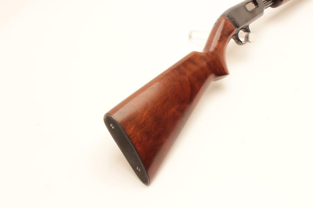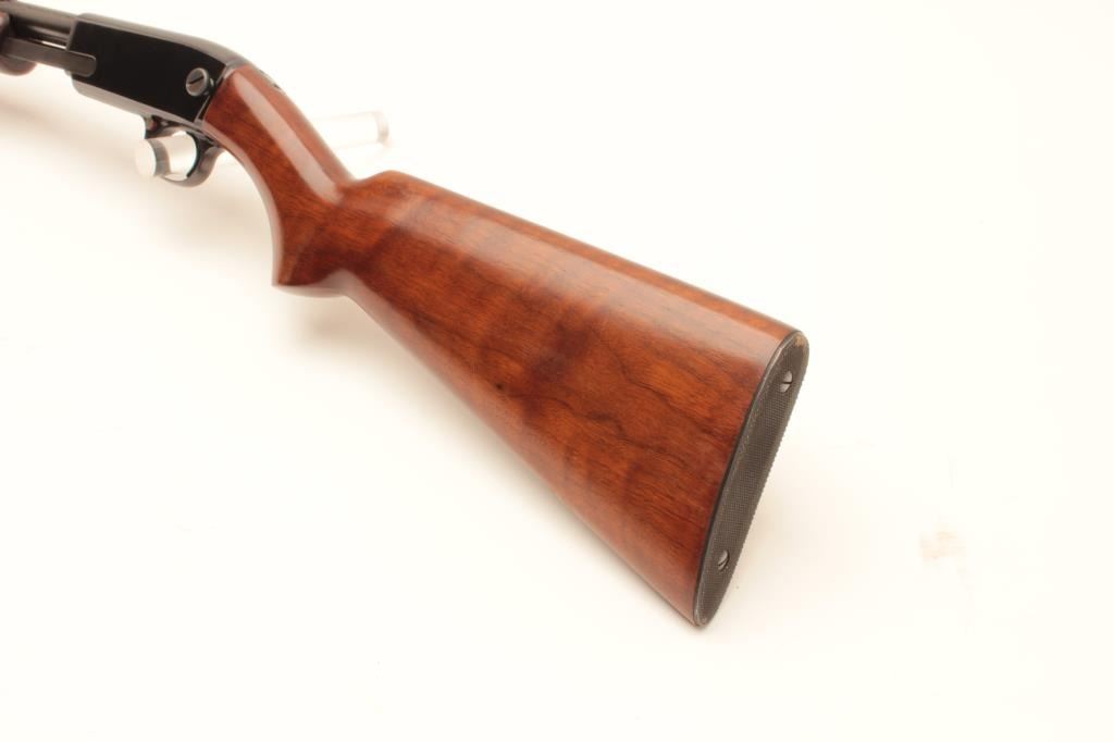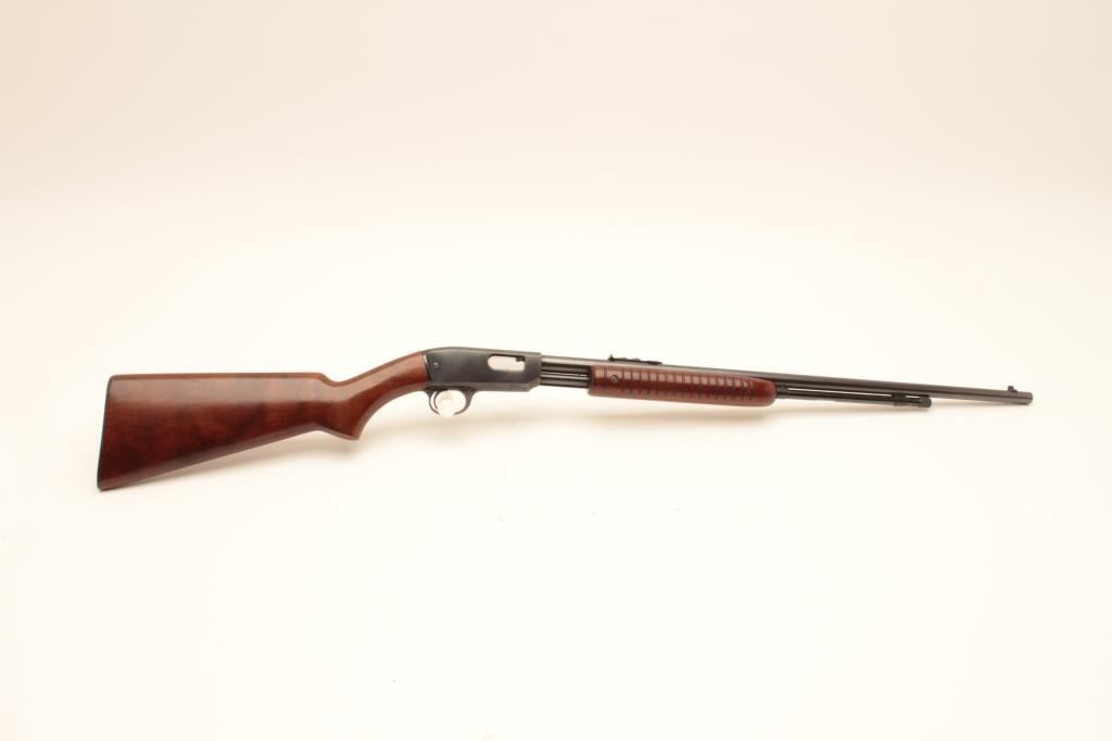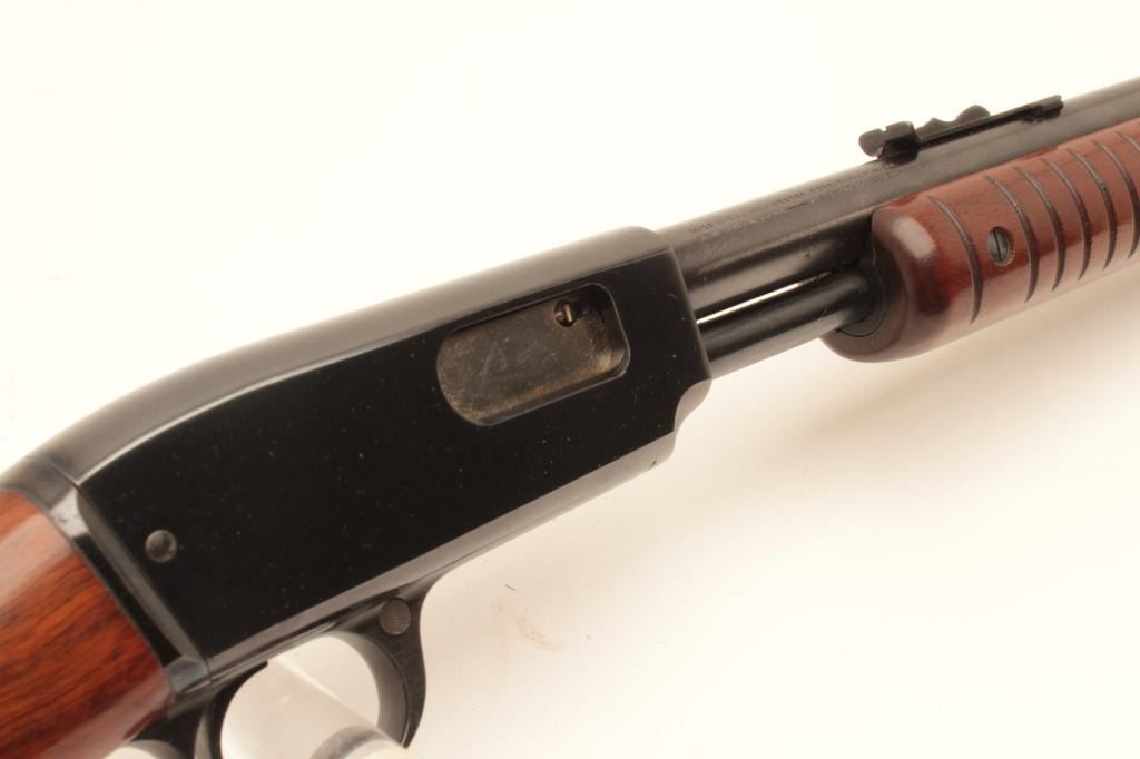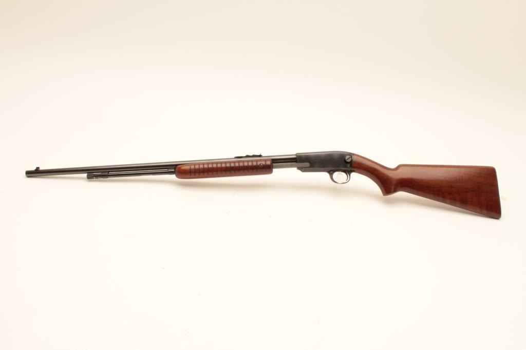 Winchester Model 61 pump action rifle, .22 short, long or LR caliber, 24” round barrel, blued finish, wood stocks, S/N 47114, with factory cardboard box, in overall like new condition showing little handling; no groove Lot Title early receiver; box is near fine condition with end label numbered to this gun. (C&R). Est.: $800-$1,600.