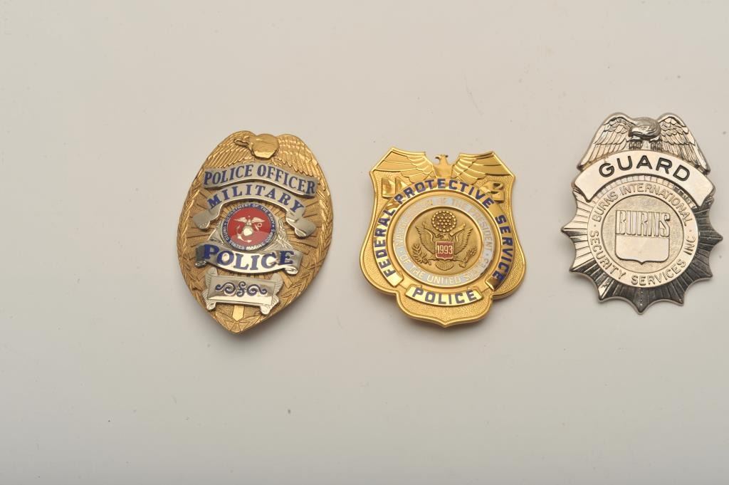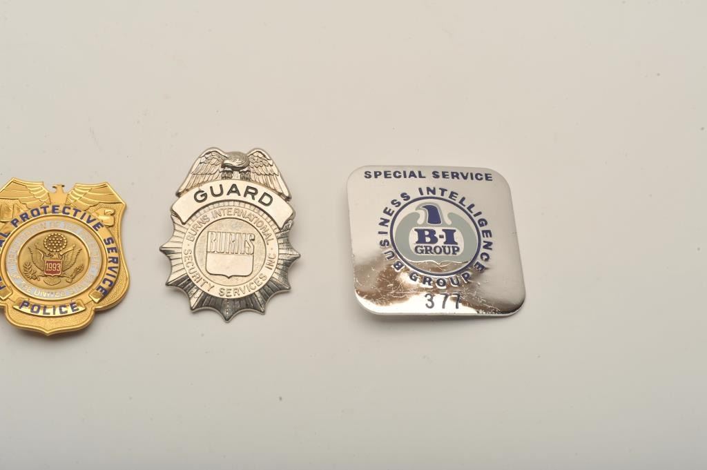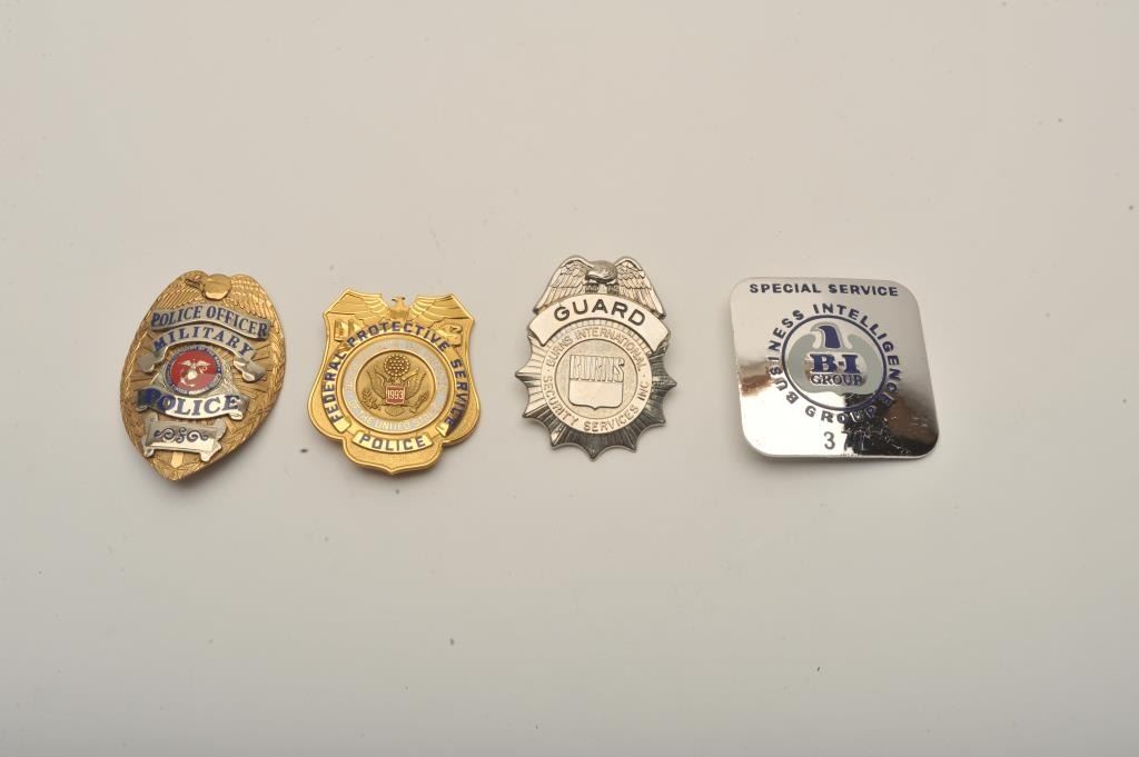 Lot of 4 badges including a Commemorative Federal Protective Services Police pin shield badge/Inauguration of the President of the United States (1993) hallmark Blackinton/#291; a U.S.M.C. Military PoliceOfficer pin shield badge, a Burns International Security Services guard shield badge and a Business Intelligence Group Special Service badge (#377). Est.: $150-$300.