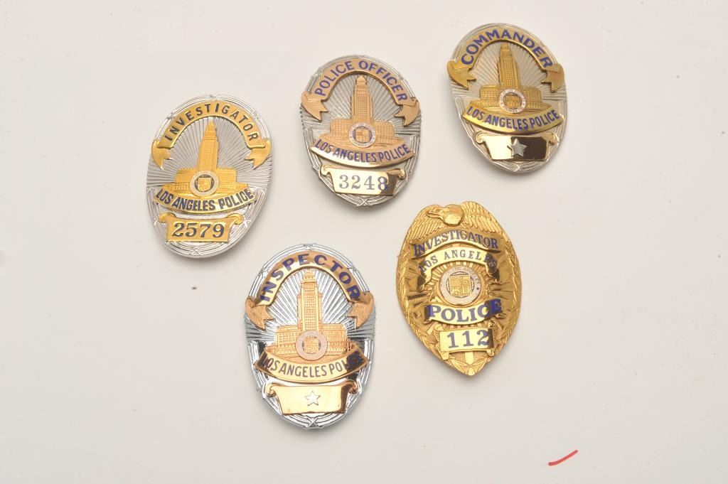 Lot of 5 Los Angeles, CA badges including an Inspector shield (hallmark Entenmann-Rovin Co.), Police Officer shield (3248/Entenmann-Rovin Co.), Commander shield (hallmark Entenmann-Rovin Co.), Investigator Lot Title shield (2579/no hallmark) and earlier Investigator shield (112/hallmark LA Stamp & Staty Co.). Est.: $150-$300.