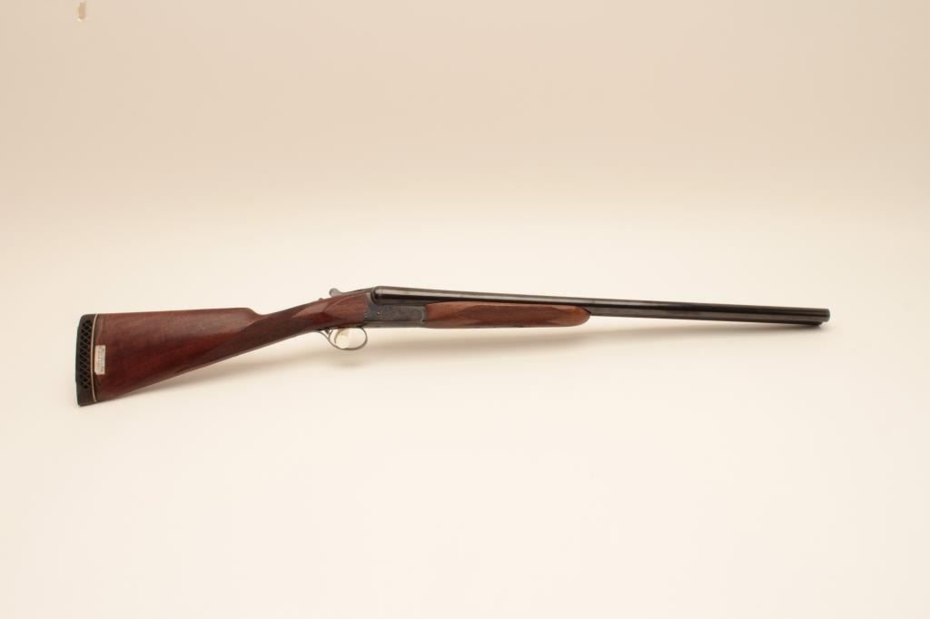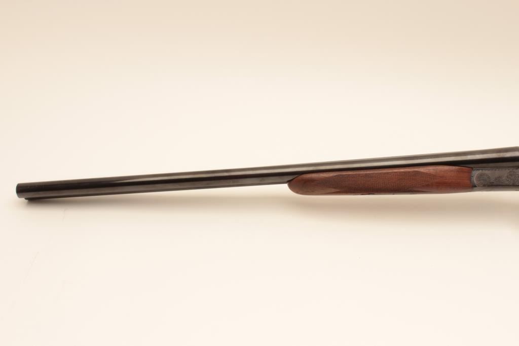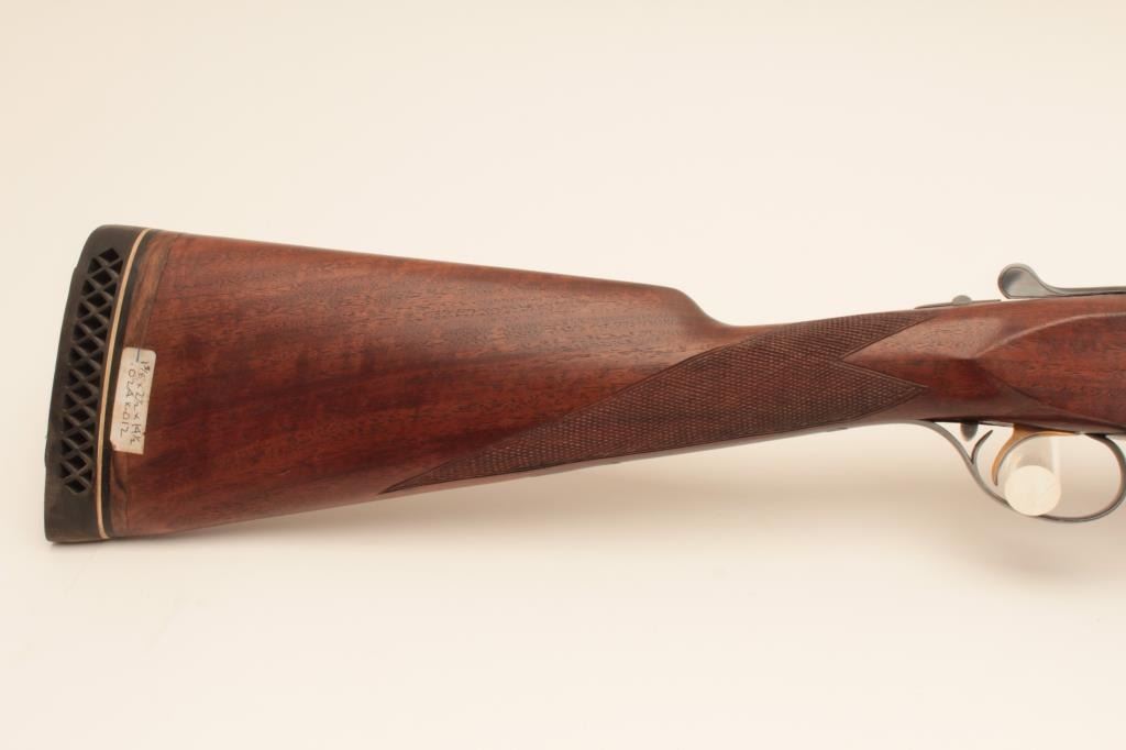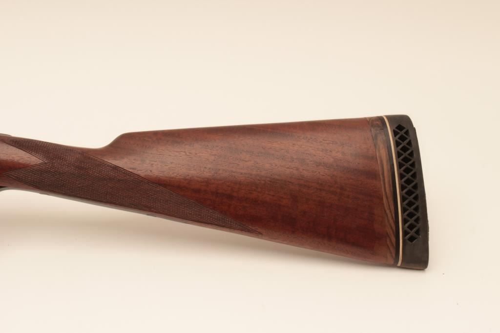 Browning BSS 12GA SxS shotgun with single trigger, auto ejectors, 26” barrel, and Straight stock. Choke improved right and modified left. The stock has been lengthen by addition of wood and thick pad. Measures 13: to the end of the original wood and 14 ¼” to the end of the pad. Very good used condition. 80% finish with bright bores. The wood is good to very good other than fitting of pad and extension which is slightly crude. With mutton case. (Modern) Est.: $500-$1000
