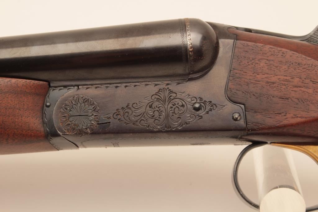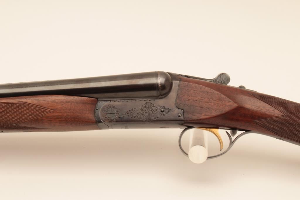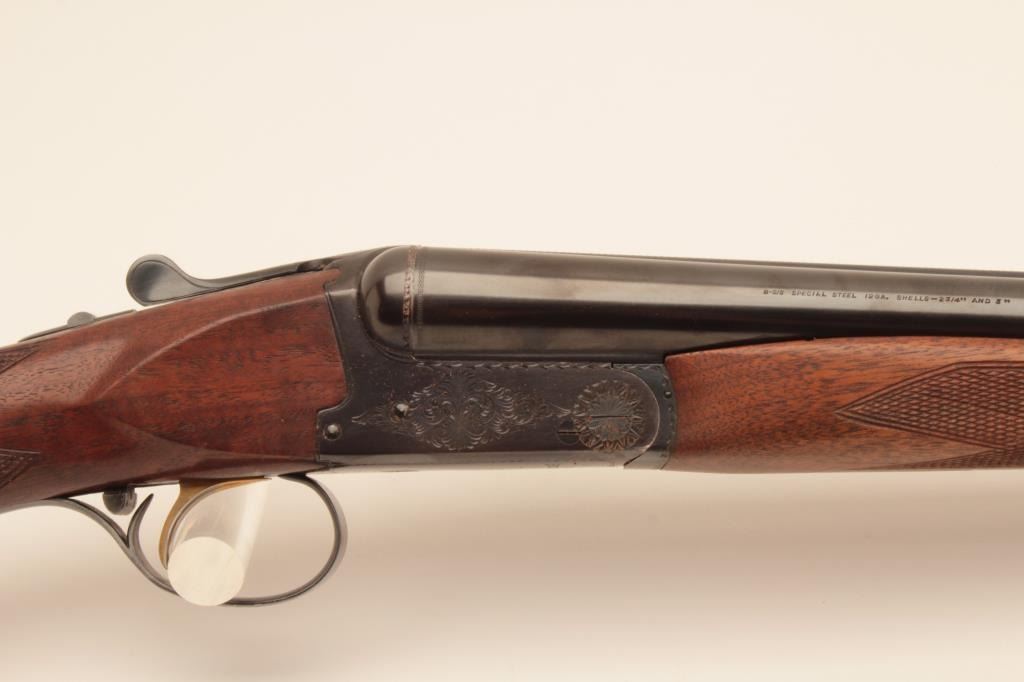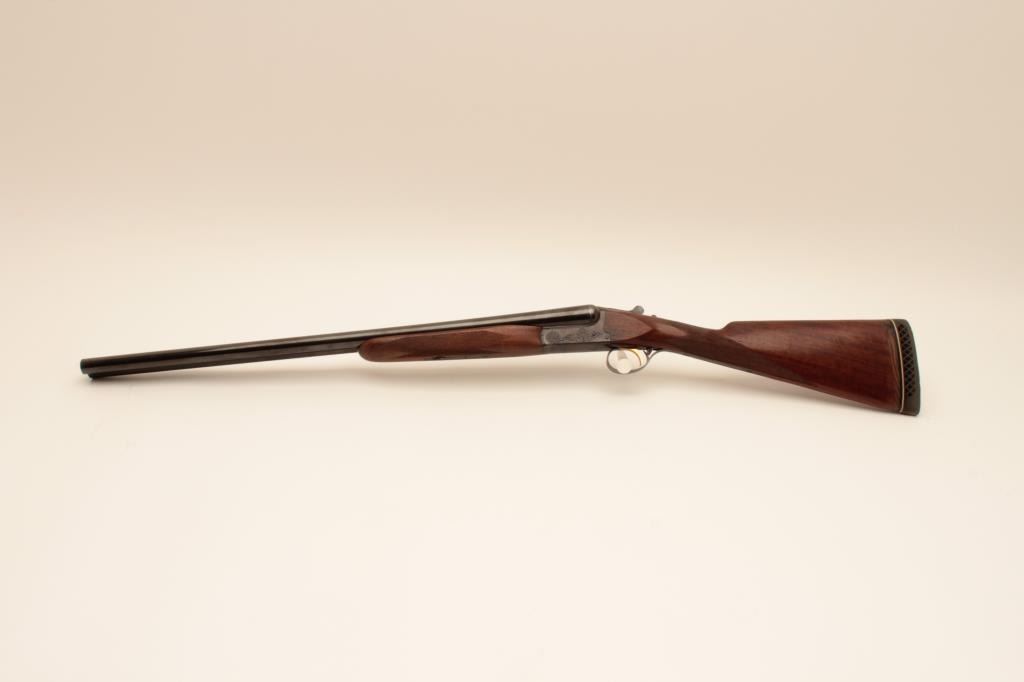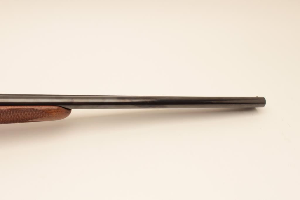 Browning BSS 12GA SxS shotgun with single trigger, auto ejectors, 26” barrel, and Straight stock. Choke improved right and modified left. The stock has been lengthen by addition of wood and thick pad. Measures 13: to the end of the original wood and 14 ¼” to the end of the pad. Very good used condition. 80% finish with bright bores. The wood is good to very good other than fitting of pad and extension which is slightly crude. With mutton case. (Modern) Est.: $500-$1000