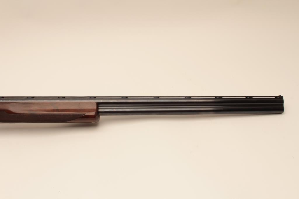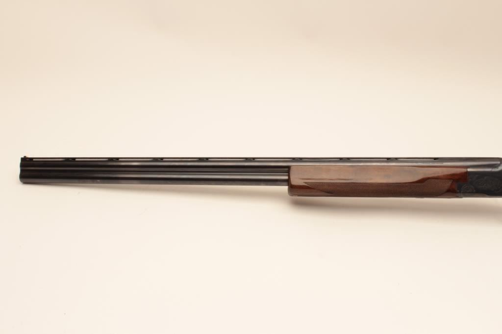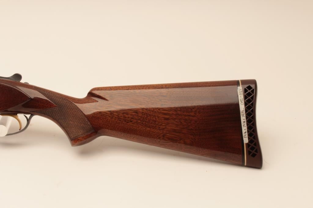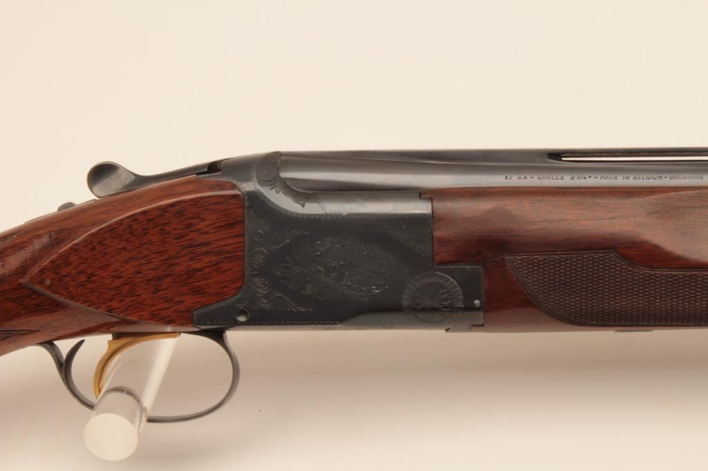 Browning Lightning Over/Under 12GA Trap shotgun with 32” barrels and Broadway rib, S/N 30826S70 with single trigger, auto ejector, choked full over modified. Measures 14 ½” to the end of the rubber pad. Near fine used condition with 95%-98% original blue. Very good to almost excellent wood showing minor use. With Browning luggage case. (Modern) Est.: $1300-$2600
