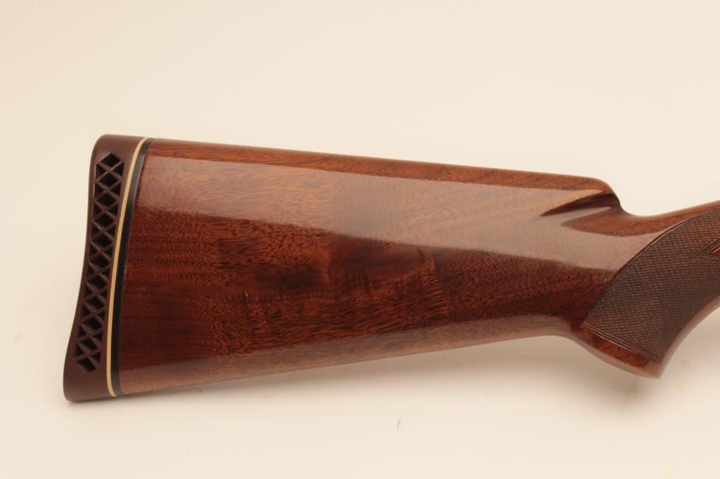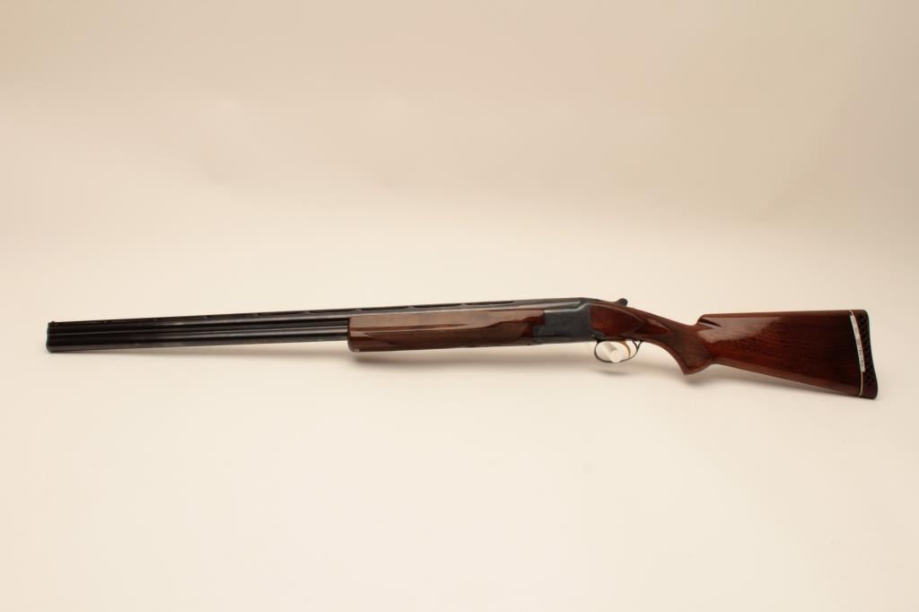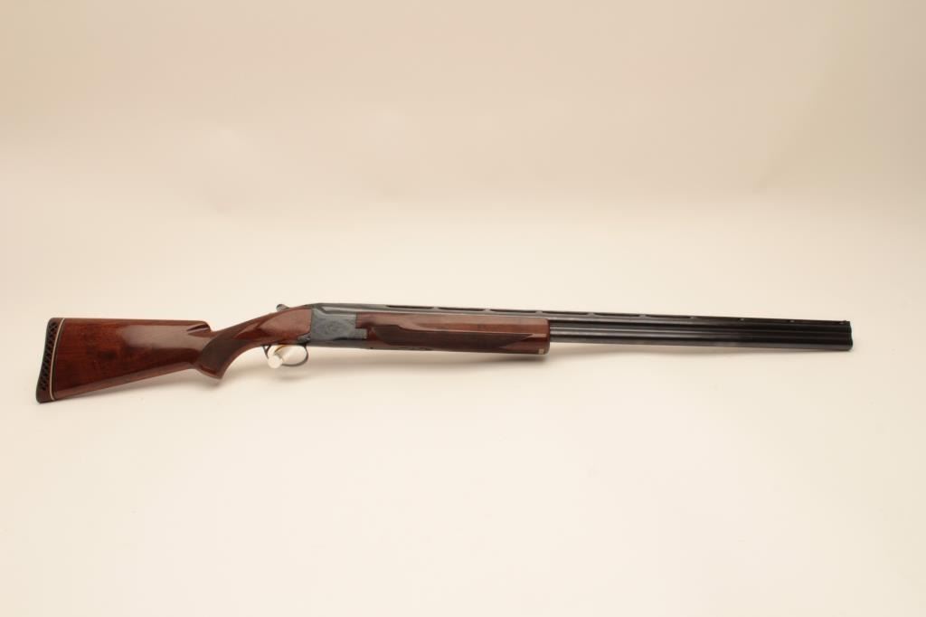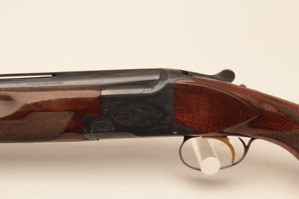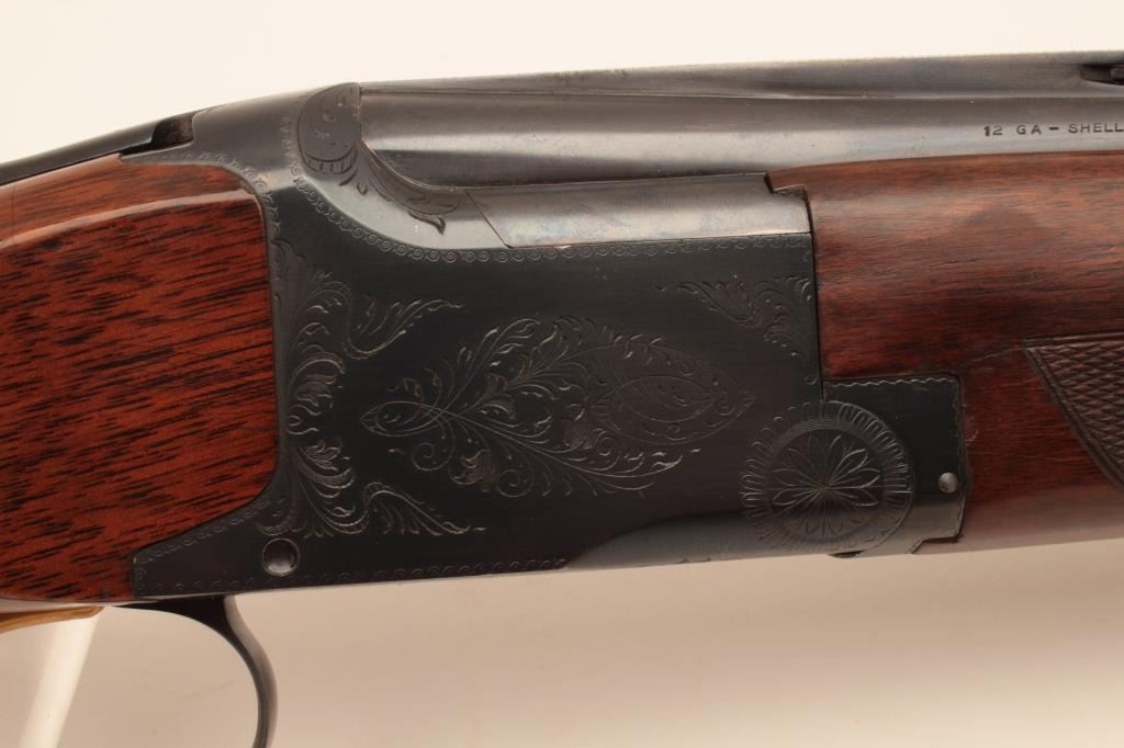 Browning Lightning Over/Under 12GA Trap shotgun with 32” barrels and Broadway rib, S/N 30826S70 with single trigger, auto ejector, choked full over modified. Measures 14 ½” to the end of the rubber pad. Near fine used condition with 95%-98% original blue. Very good to almost excellent wood showing minor use. With Browning luggage case. (Modern) Est.: $1300-$2600
