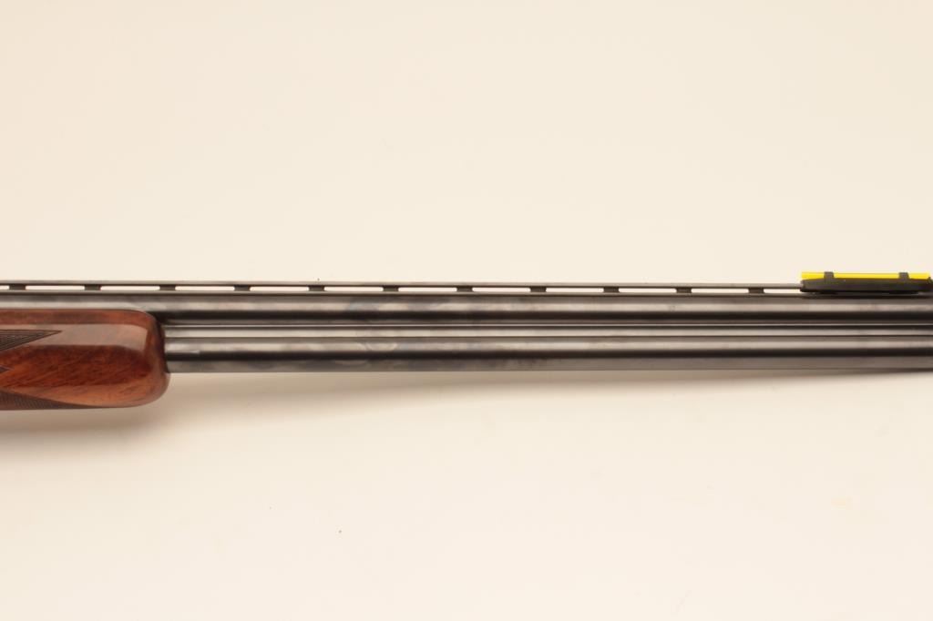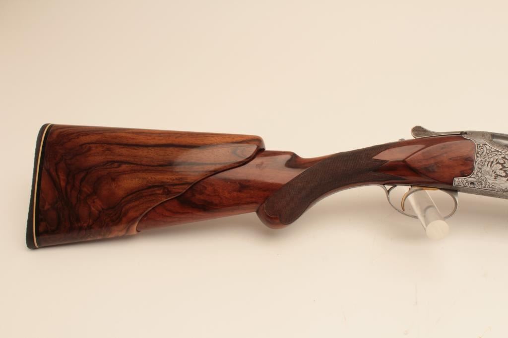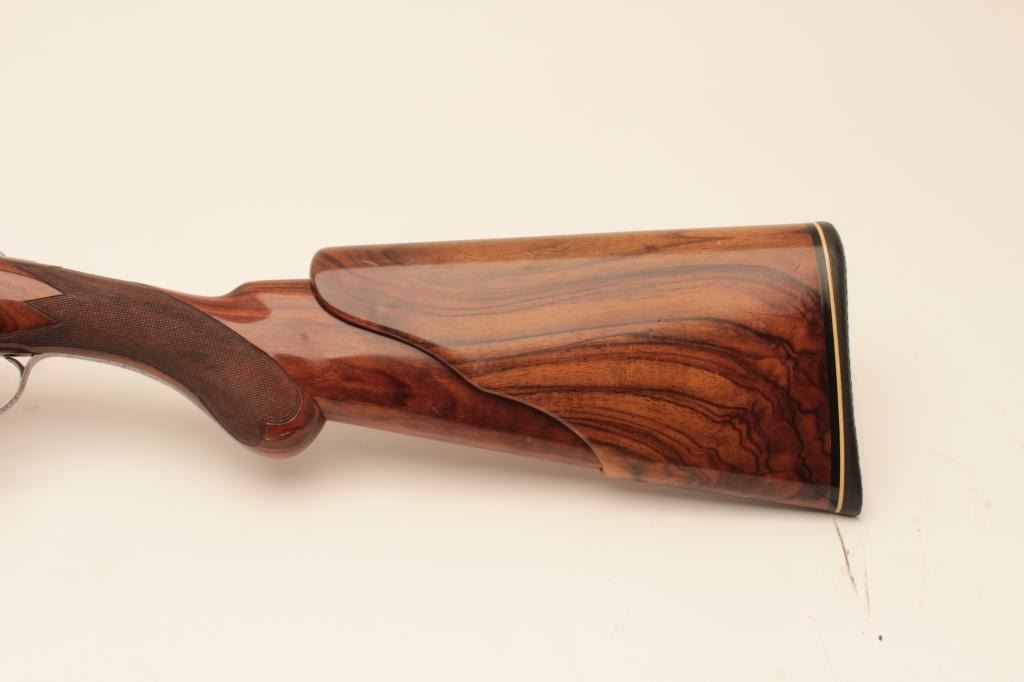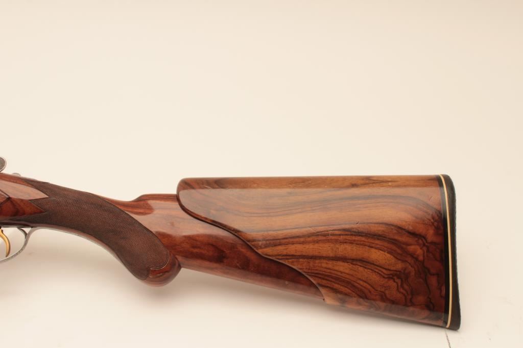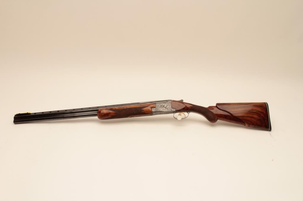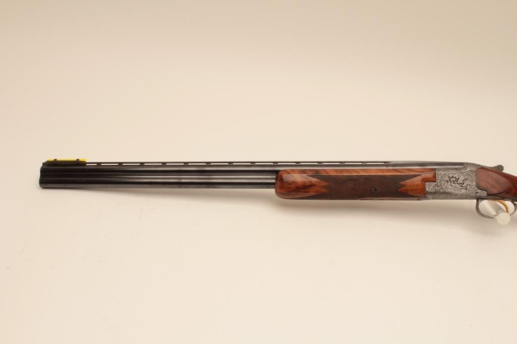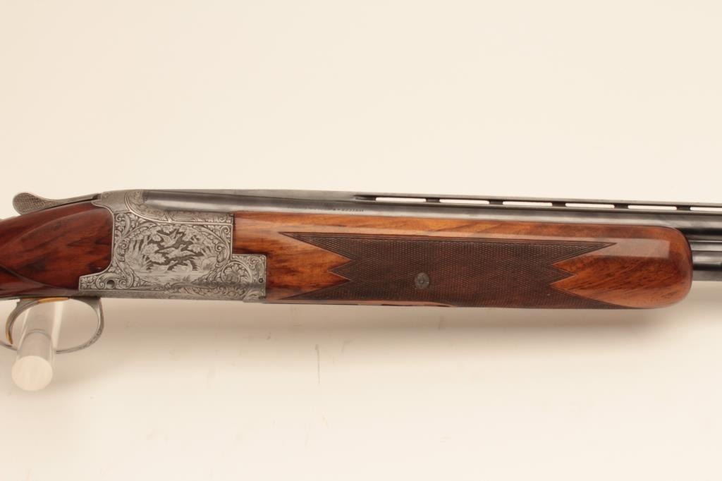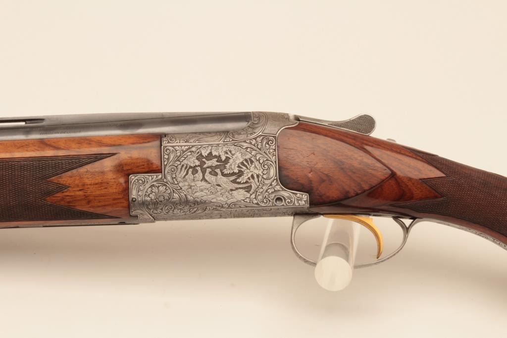Browning Diana Grade 20GA Over/Under Lightning shotgun signed “Funken” with long tang and round knob, S/N 10200. The barrels measures 26 ¼” and choked modified over full. Single trigger, auto ejector with hypro coil or pneumatic stock including pump and Browning case. Very good plus used condition with 90%-95% original finish. The stocks are also very good plus with minor imperfections and normal use. Funken is considered among the top few Browning engravers of this classic era. Measures 14 ¼” to the end of the pad. (C& R) Est.: $5,000-$10,000