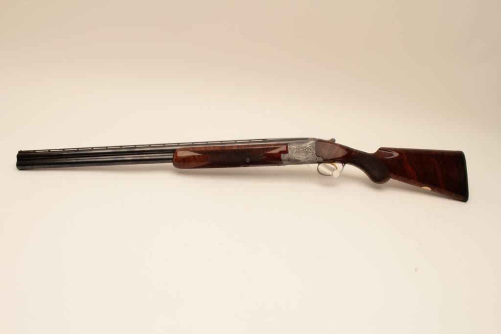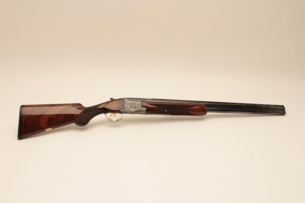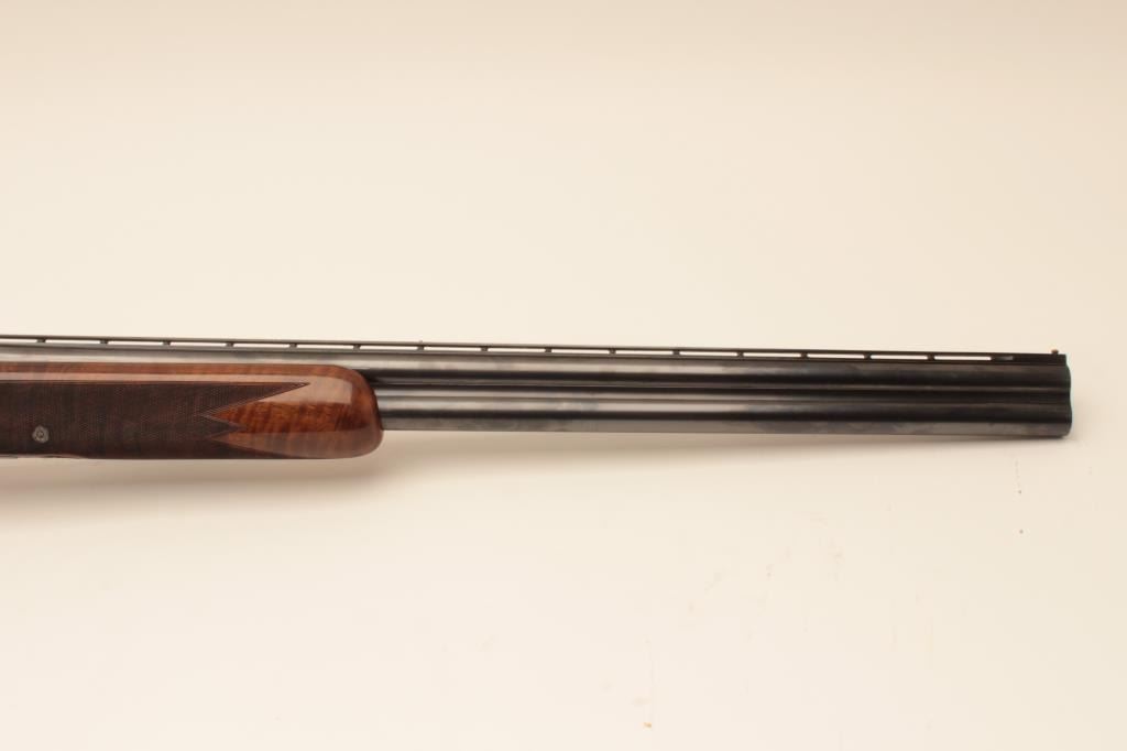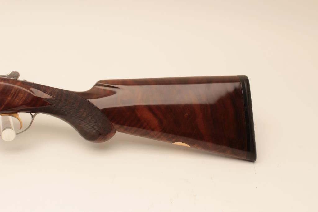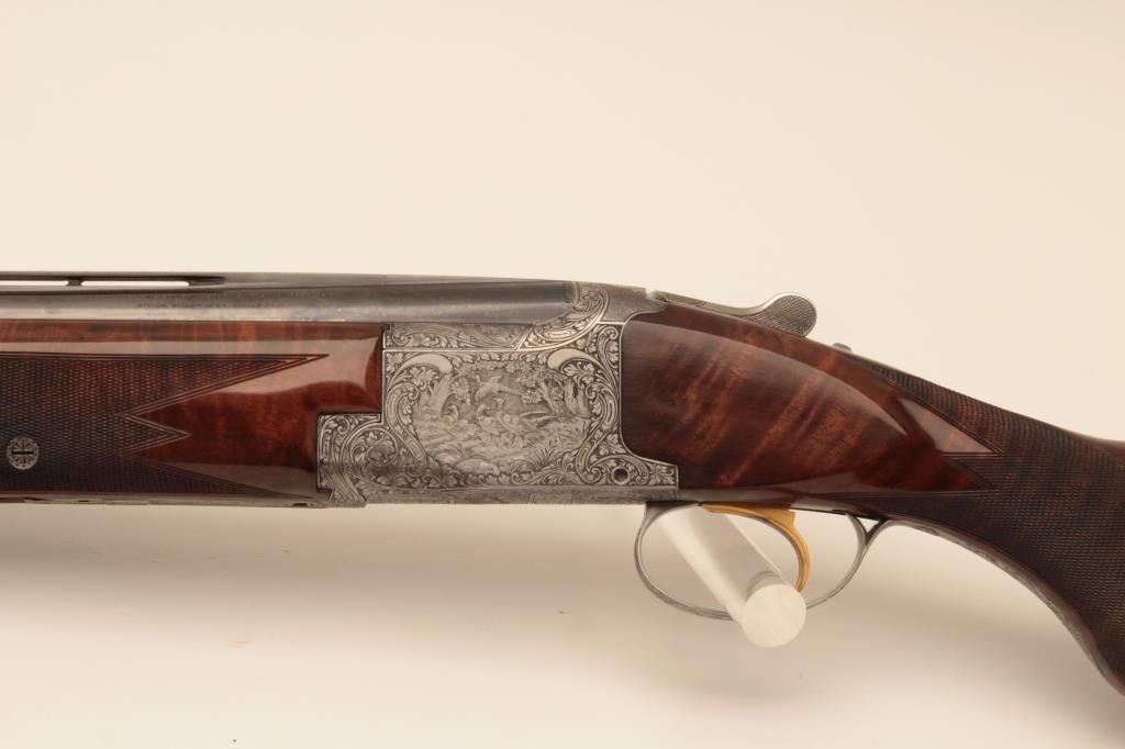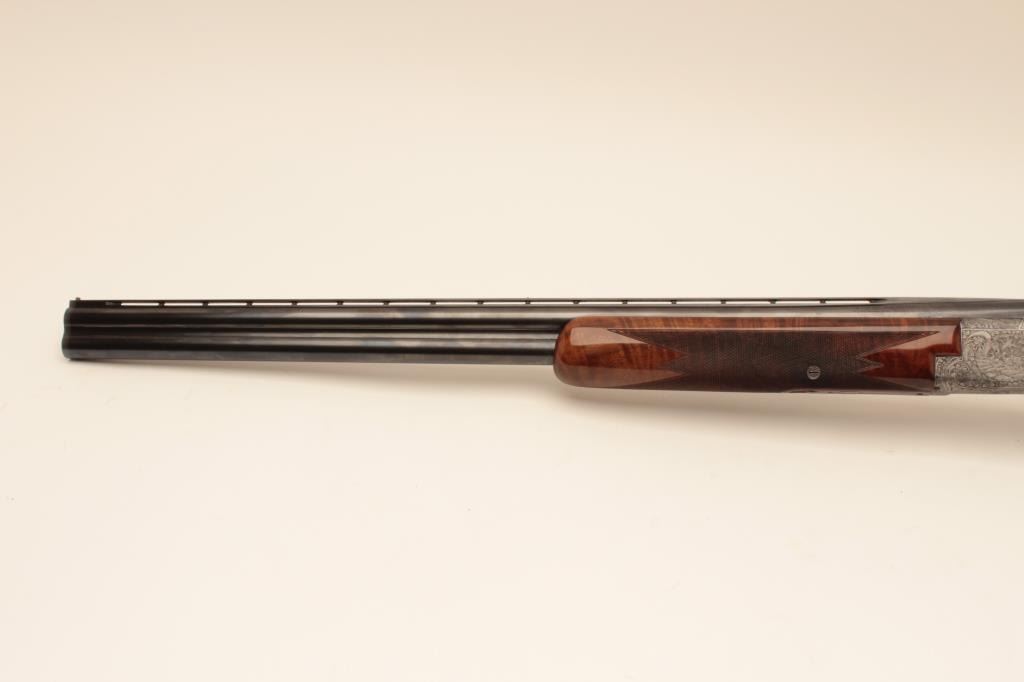 Belgium Browning Lightning Over/Under Diana Grade 2 barrel set in 12GA, S/N 76798. Long tang round knob with single trigger and auto ejectors, Signed “A. Marechal” in two places. The barrels measure 30” and 28” with theirown fore end. The 30” barrel is choked full and full. The 28” barrel is choked skeet and skeet. Fine original condition with 95%-98% original finish showing just slight aging and minor use. The stocks are also near finewith slight imperfections. A thin line rubber pad has been added and measures 14 ¼” to the end. A gold plaque is inlaid into the belly of stock with name engraved. An exceptionally engraved Diana with early style bluevelveteen lined luggage case included. (Modern) Est.: $5000-$10,000