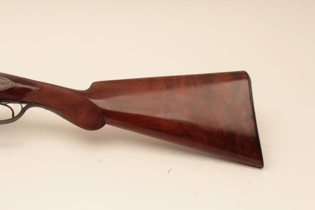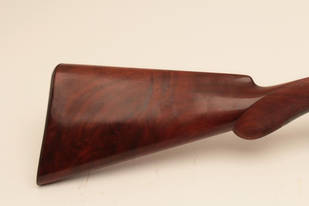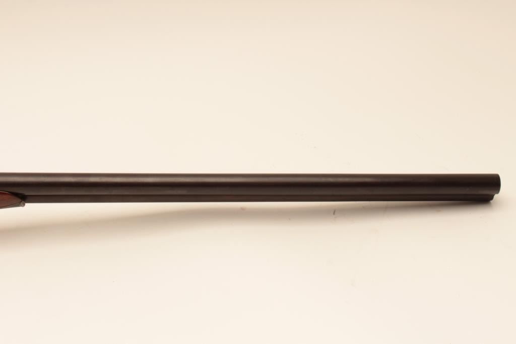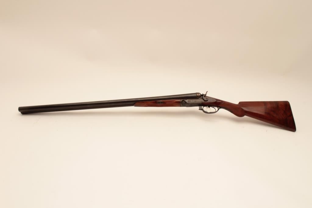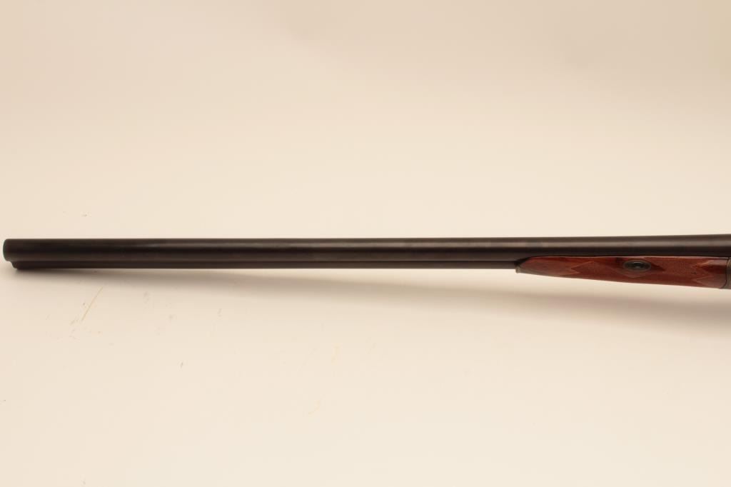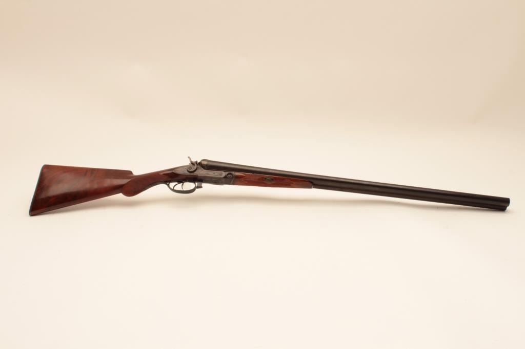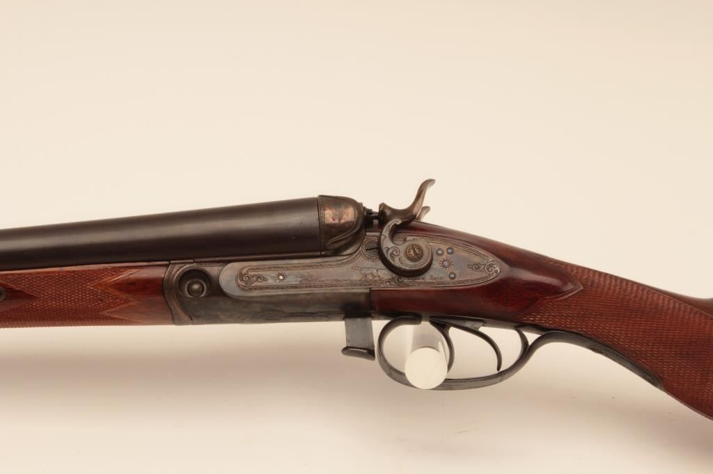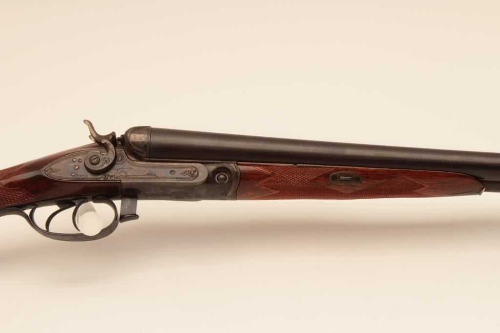 Parker Bros exposed hammer SxS barrel 12GA Damascus barrel shotgun, S/N 7777. Under action finger release with double triggers and standard extractors. The barrels are numbered 8128 and not matching (Note thebarrels are loose on the frame and not safe. Sold as collectible relic only). Finely restored and restocked with skeleton steel plate and checkered steel plate and checkered panel. The bores are slightly rough.Engraved action with dogs on each side and great dog on guard. Measures 14 ¼” to the end of the plate. With luggage case showing canvas and leather cover with velvet interior. Interesting serial number forgambler showing 4 sevens! A showpiece. Not a shooter. (Antique) Est.: $1500-$3000