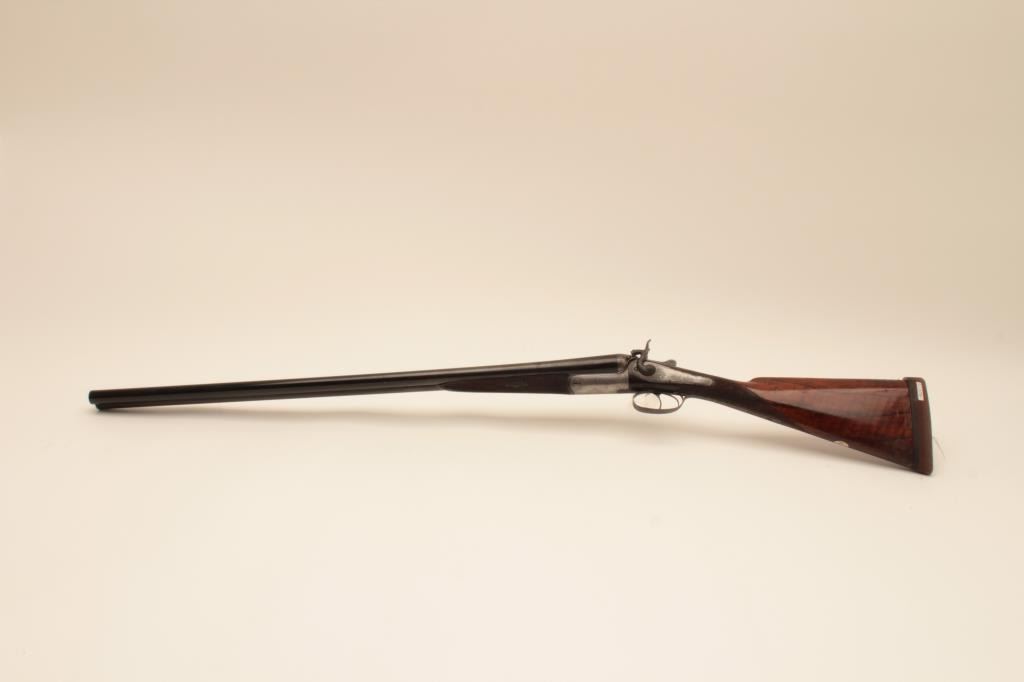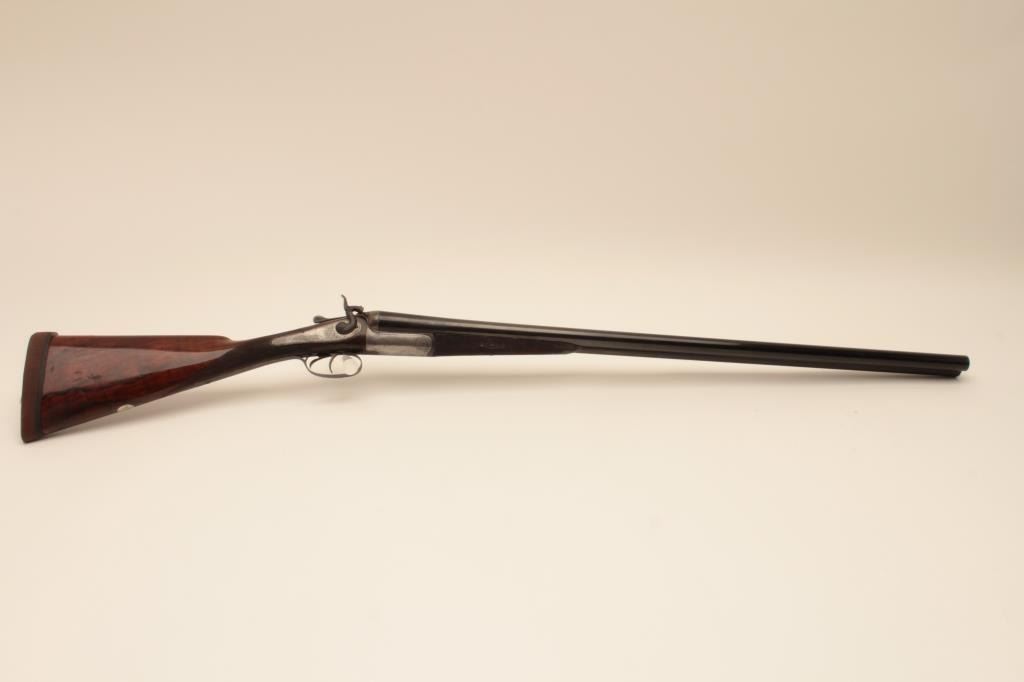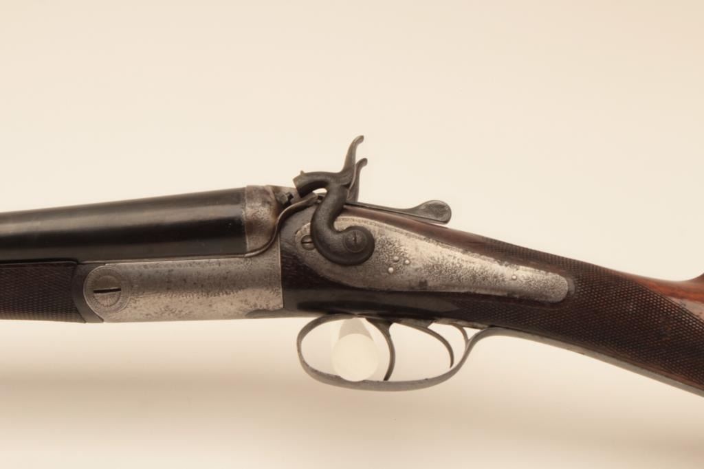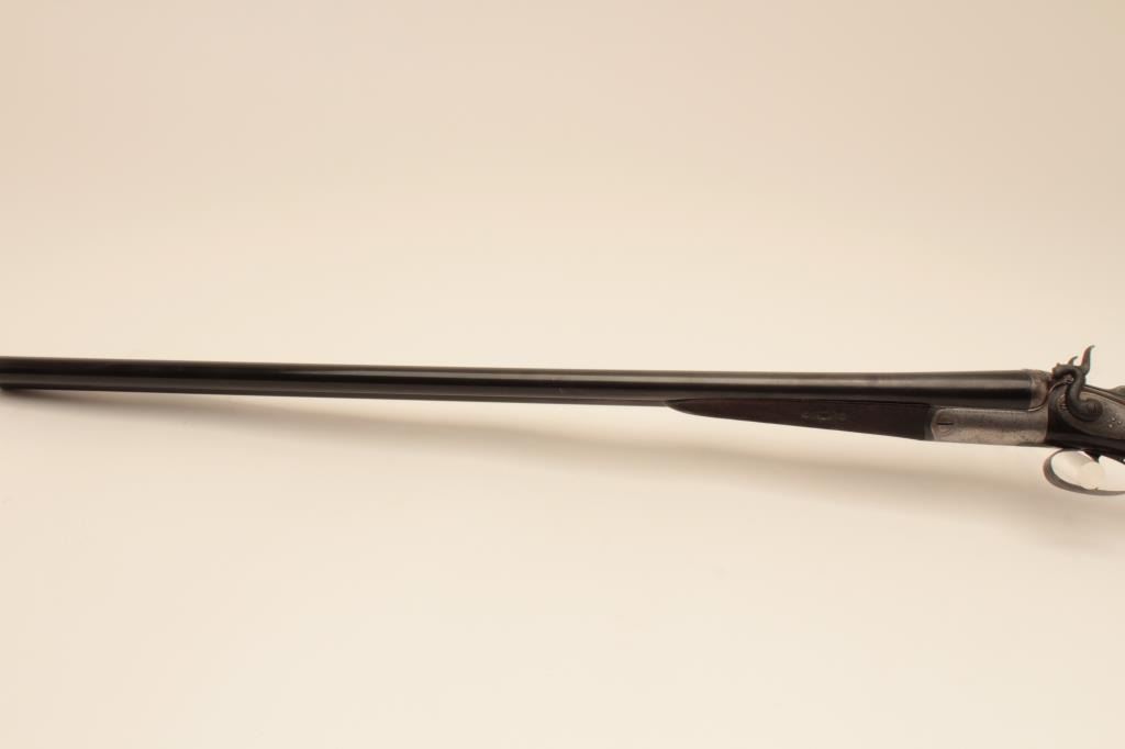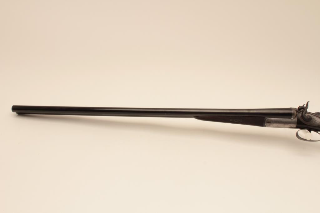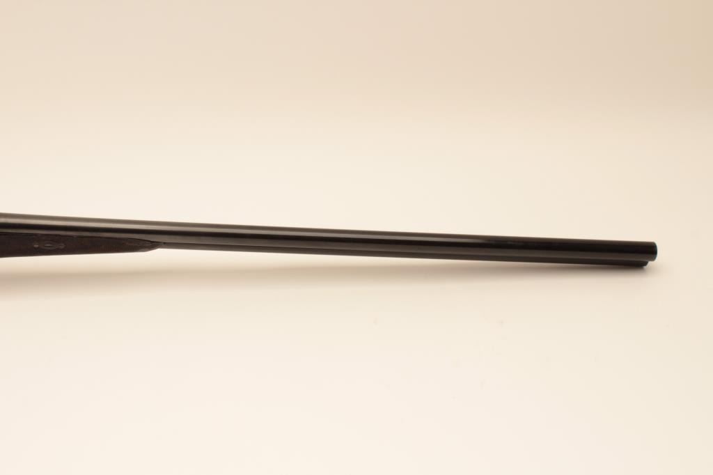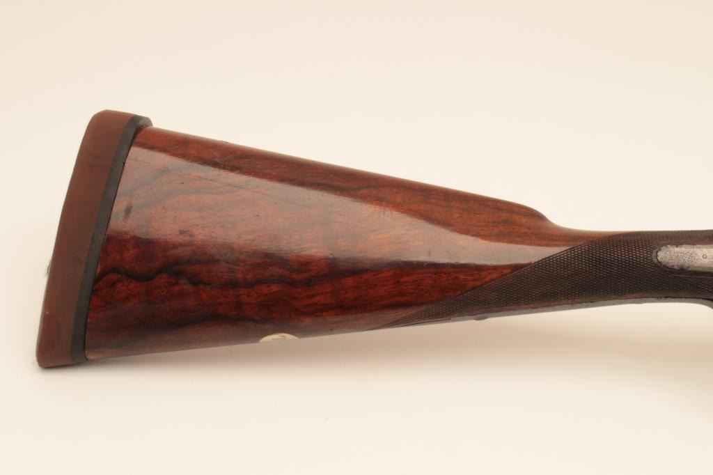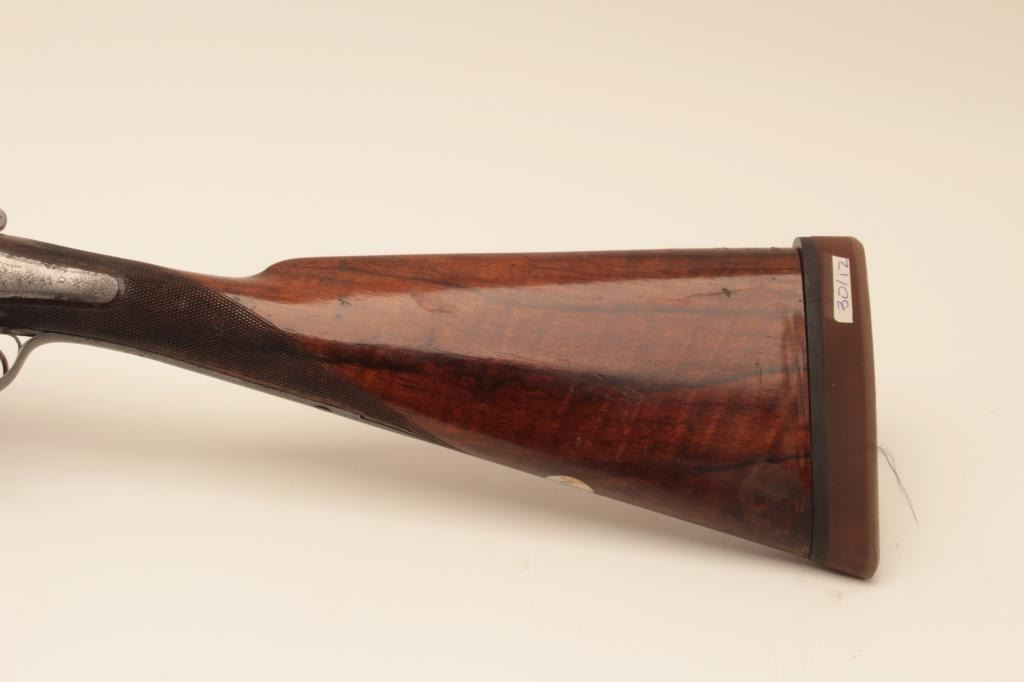 Early James Purdy, 314 ½ Oxford St, London addressed SxS 12GA exposed hammer damascus barrel shotgun, S/N 8395. The barrels measure 29 7/8” and choked full and modified with top lever release, double triggers, andstandard extractors. Tight floral engraving with checkered select walnut stock. The barrels and hammers have been reblued and the frame and locks cleaned to bright metal. Some minor pitting at the edges but mostlygood and clean metal surfaces. The stocks have been lightly refinished with good wood to metal fit. Oversize and poorly fit rubber pad added. Good lock up and sound mechanically. The bores are bright. Truly anentry level Purdey. (Antique) Est.: $2000-$4000