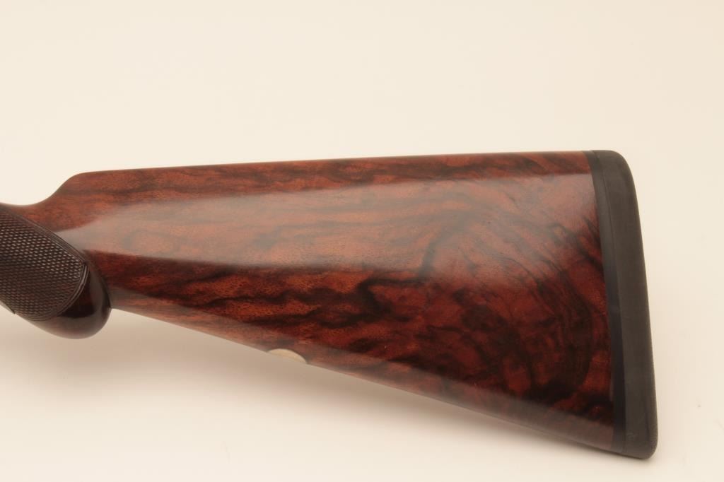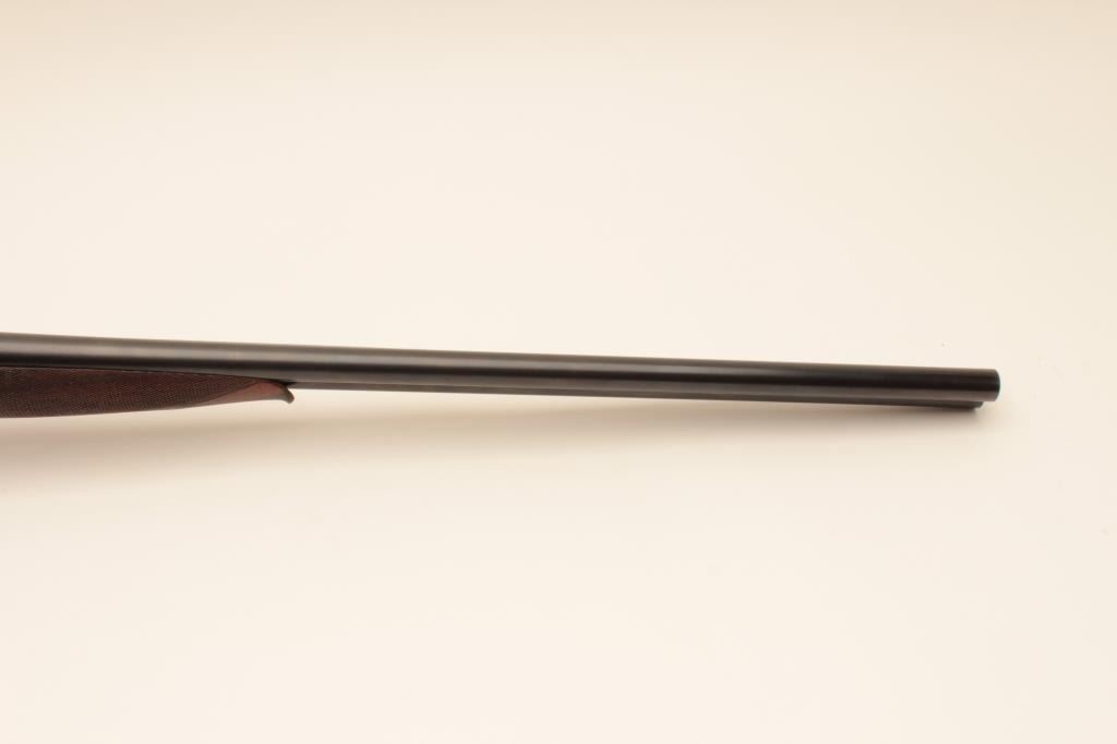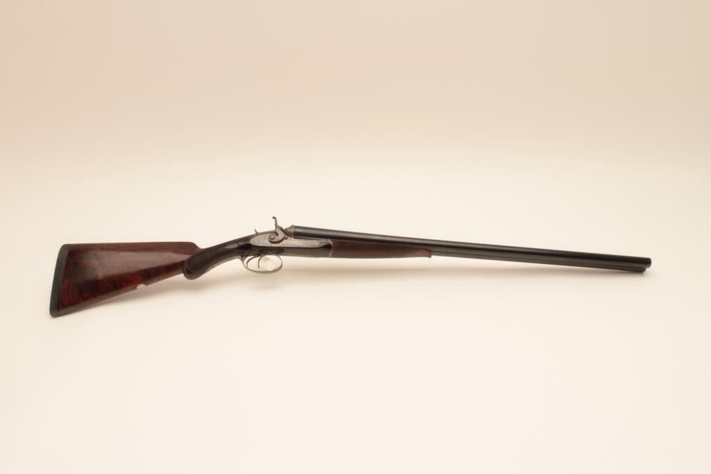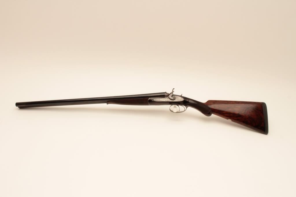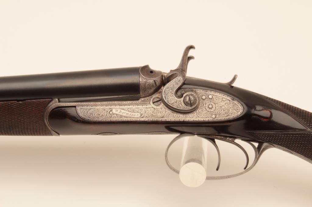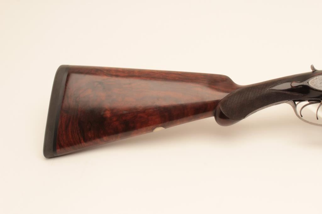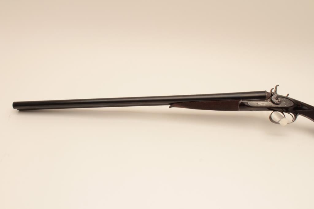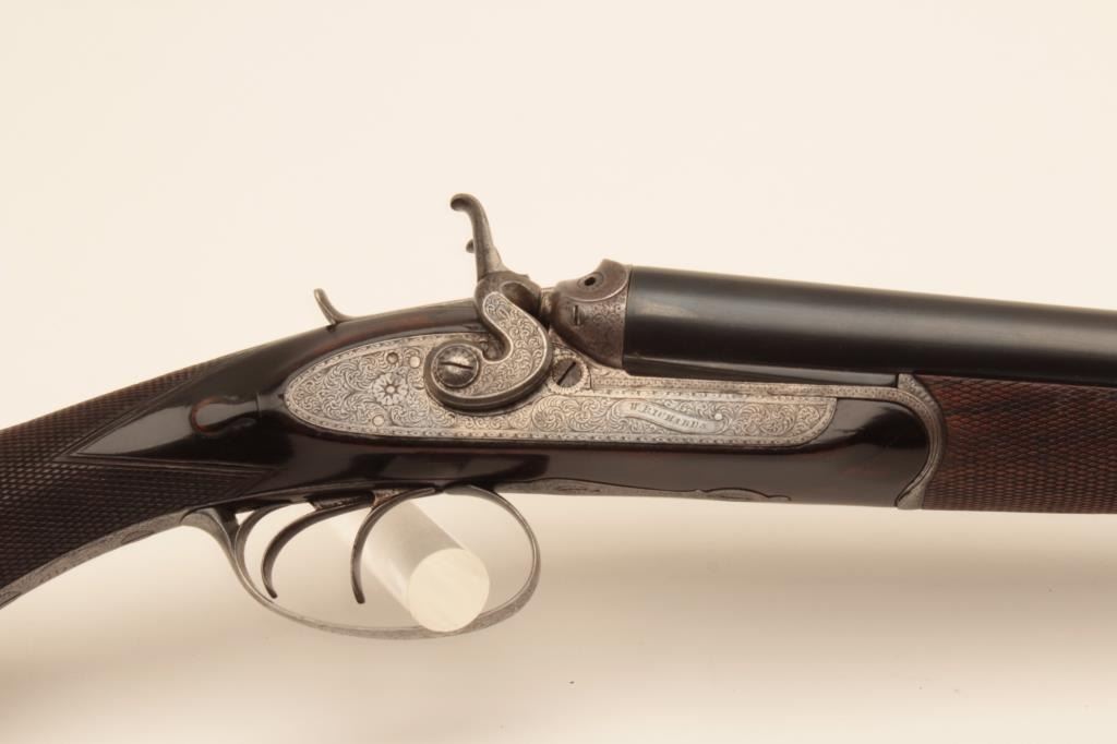 W. Richards (Powells PT) top lever release 16GA SxS shotgun with Liverpool address and black powder proofs along with double triggers, and standard extractors. The barrels measure 25 1/8” and 41 5/8” overall.Nice quality English scroll engraving with dogs on the trigger guard. Nicely refinished with bright locks. The stocks show fine grain. 90%-95% as restored condition with some minor imperfections in wood and aging to bright metal surfaces. Choked full and full. Measures 14 5/8” to the end of the pad. Neutral cast. 1 /14” drop at the comb and 3” at the heel. Weighs approximately 6 lbs. With canvas covered English trunk case with label in lid. The barrels have possibly been shortened and chambers lengthen to 2 ¾”. The case is very good plus original condition. (Antique) Est.: $1250-$2500