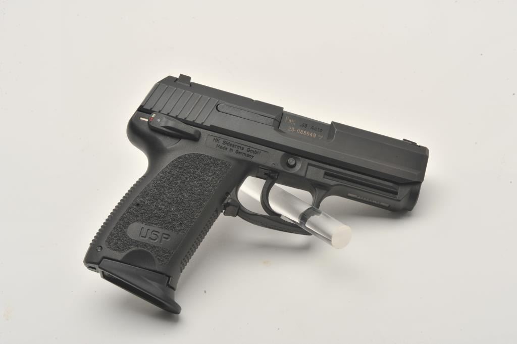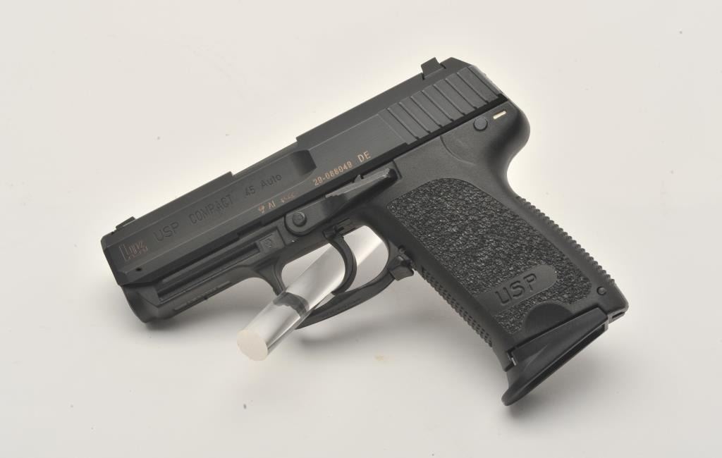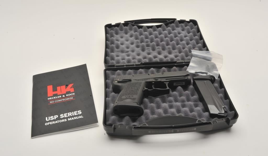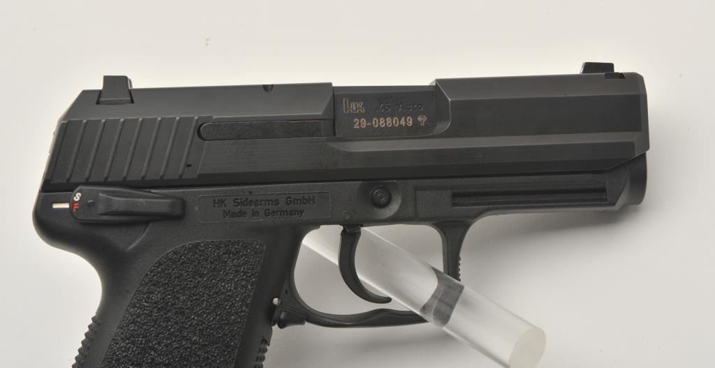 18EMY-19 H&K USP COMPACT PISTOLH&K USP Compact semi-automatic pistol, .45 caliber, black finish, S/N 29-088049, with one extra magazine, instructions manual and factory padded hardcase and end label numbered to this gun. Pistol is in like newcondition and set up with a left hand de-cocker lever (right hand de-cocker lever also included). (Modern/PPT). Est.: $500-$900.H&K USP Compact semi-automatic pistol, .45 caliber, black finish, S/N 29-088049, with one extra magazine, instructions manual and factory padded hardcase and end label numbered to this gun. Pistol is in like newcondition and set up with a left hand de-cocker lever (right hand de-cocker lever also included). (Modern/PPT). Est.: $500-$900.
