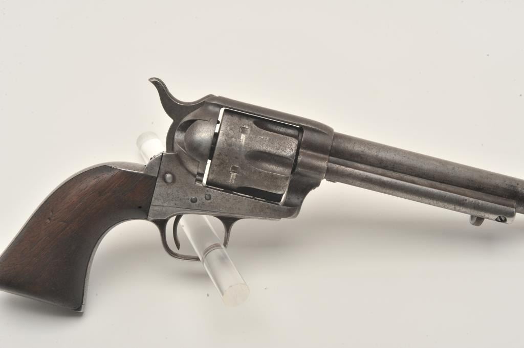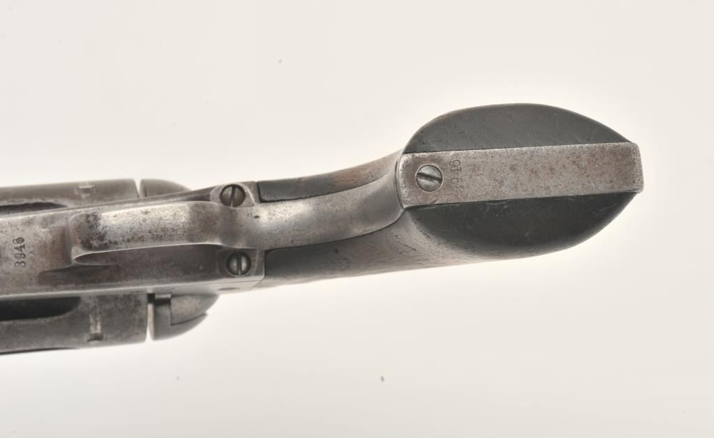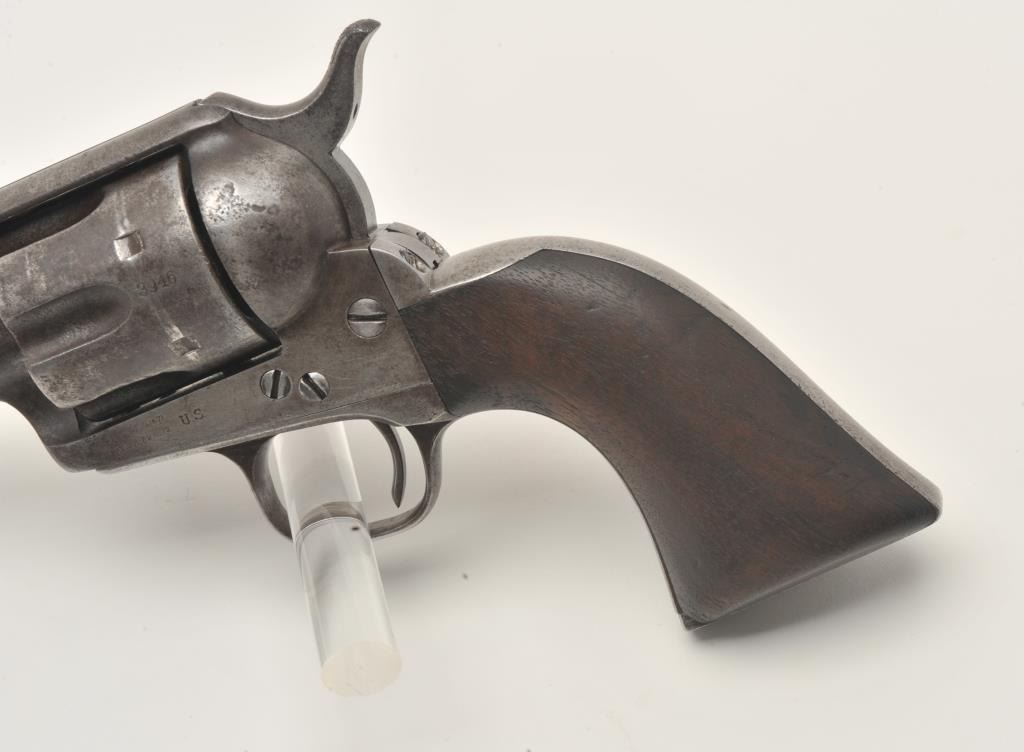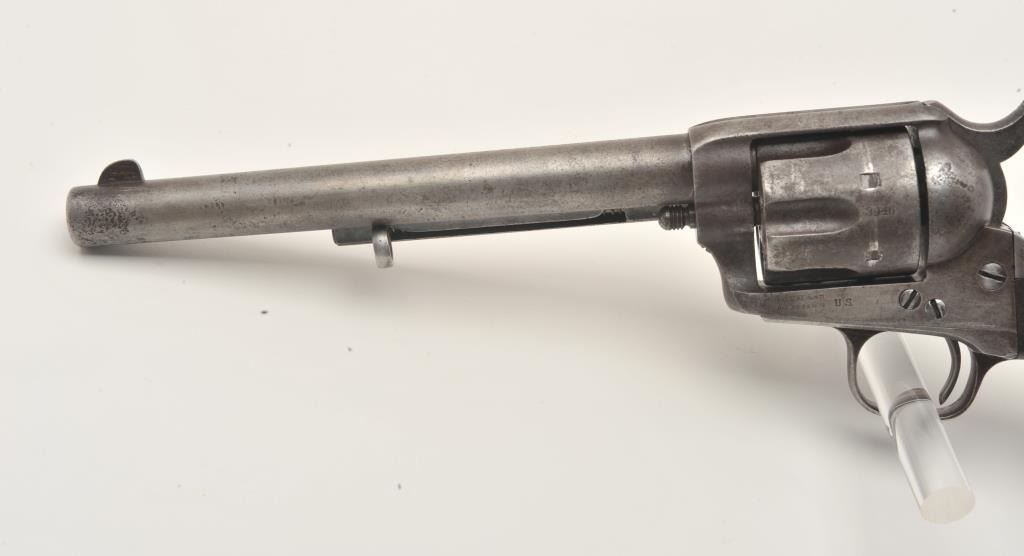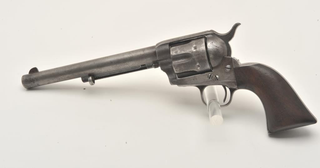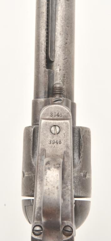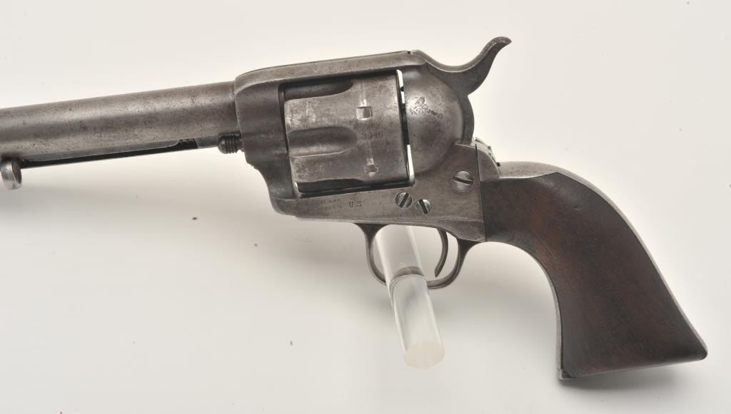 18EMY-26 COLT U.S. CAVALRY #3946Early Colt U.S. Cavalry Model SAA revolver, Ainsworth inspected, .45 caliber, 7.5” barrel, wood grips, S/N 3946, all matching visible serial numbers including barrel, in overall good + condition with a grey patinato metal surfaces and some scattered spots of erosion, good bore and action, sharp markings and good grips displaying no visible inspector cartouche. (Antique). Est.: $5,000-$10,000.Early Colt U.S. Cavalry Model SAA revolver, Ainsworth inspected, .45 caliber, 7.5” barrel, wood grips, S/N 3946, all matching visible serial numbers including barrel, in overall good + condition with a grey patinato metal surfaces and some scattered spots of erosion, good bore and action, sharp markings and good grips displaying no visible inspector cartouche. (Antique). Est.: $5,000-$10,000.