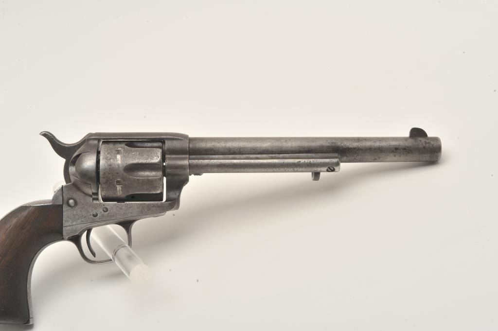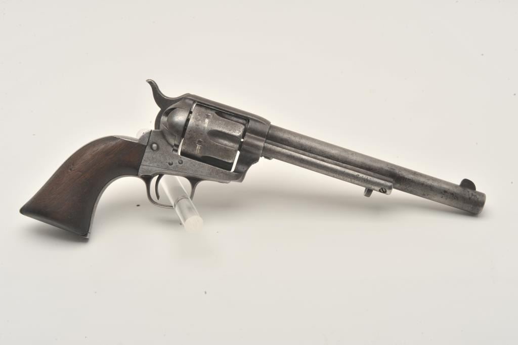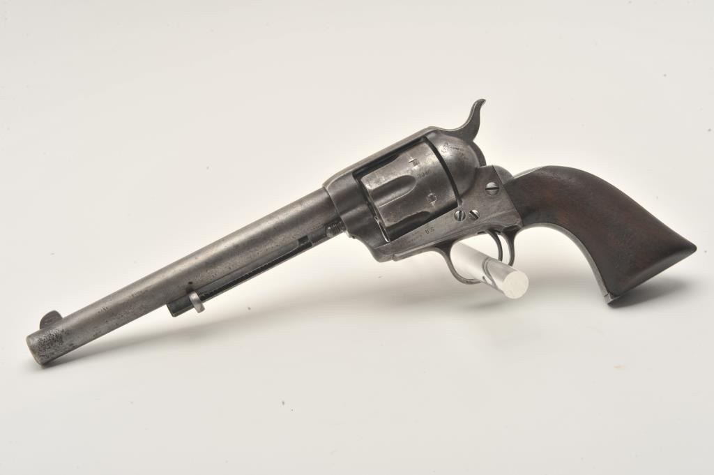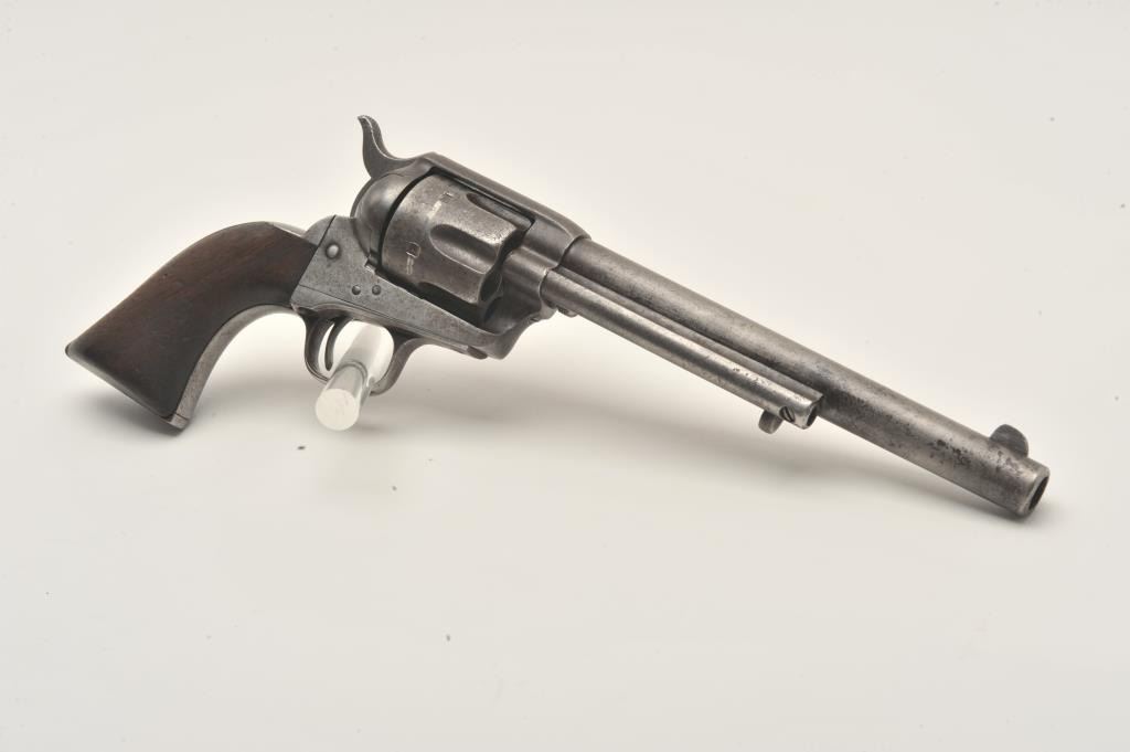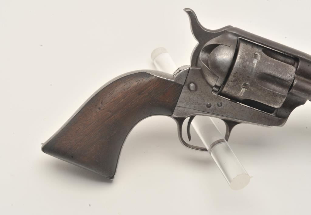 18EMY-26 COLT U.S. CAVALRY #3946Early Colt U.S. Cavalry Model SAA revolver, Ainsworth inspected, .45 caliber, 7.5” barrel, wood grips, S/N 3946, all matching visible serial numbers including barrel, in overall good + condition with a grey patinato metal surfaces and some scattered spots of erosion, good bore and action, sharp markings and good grips displaying no visible inspector cartouche. (Antique). Est.: $5,000-$10,000.Early Colt U.S. Cavalry Model SAA revolver, Ainsworth inspected, .45 caliber, 7.5” barrel, wood grips, S/N 3946, all matching visible serial numbers including barrel, in overall good + condition with a grey patinato metal surfaces and some scattered spots of erosion, good bore and action, sharp markings and good grips displaying no visible inspector cartouche. (Antique). Est.: $5,000-$10,000.