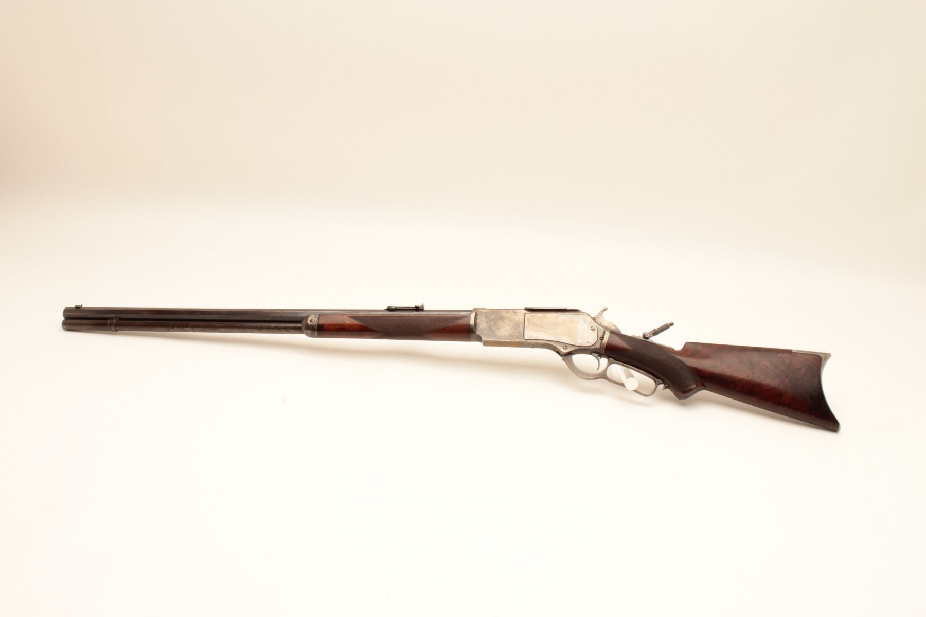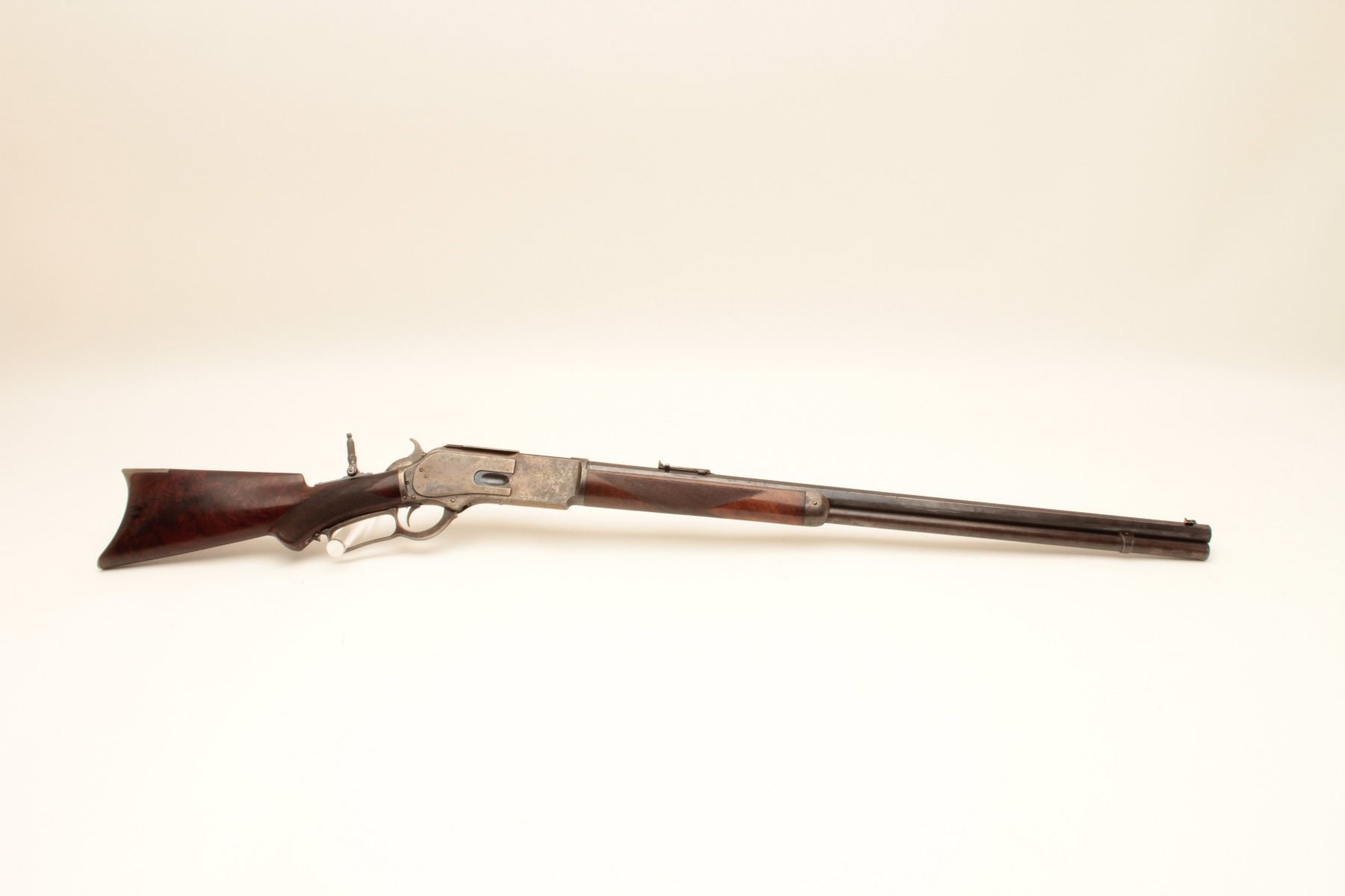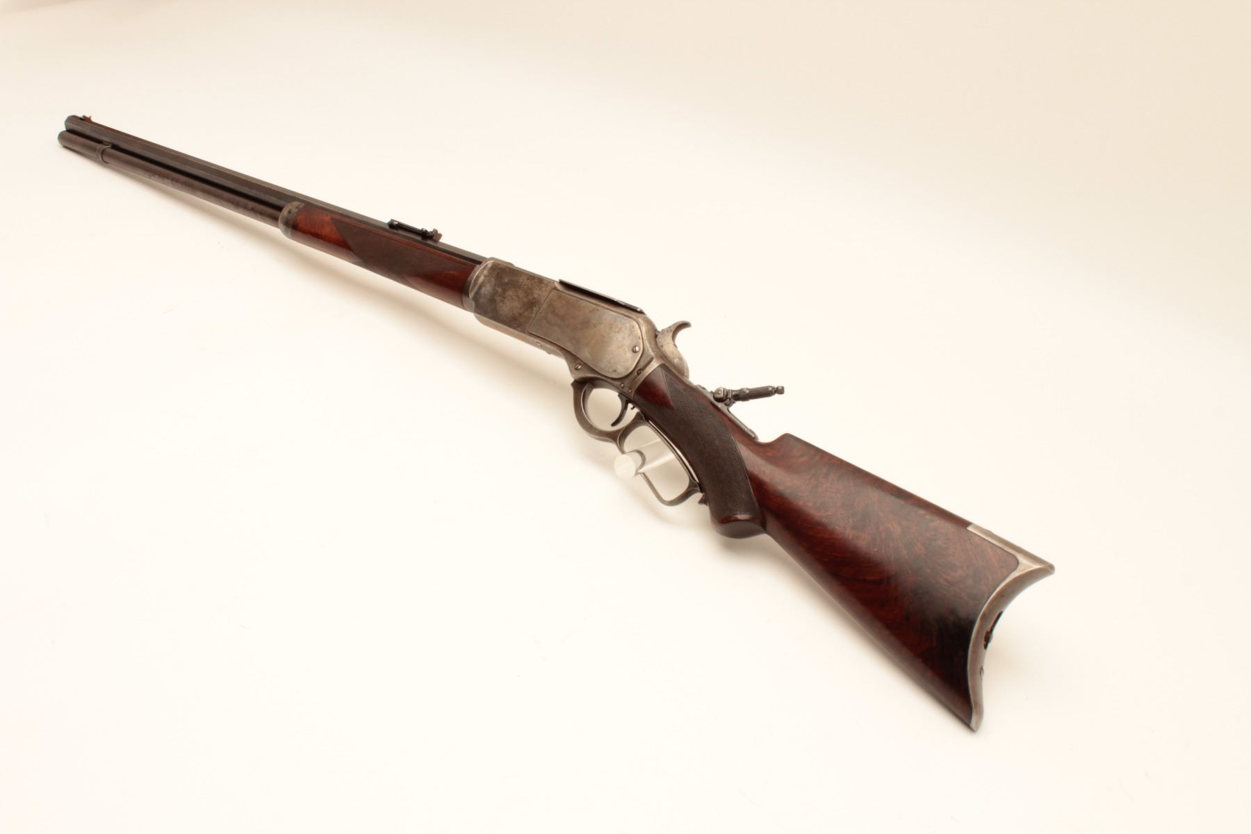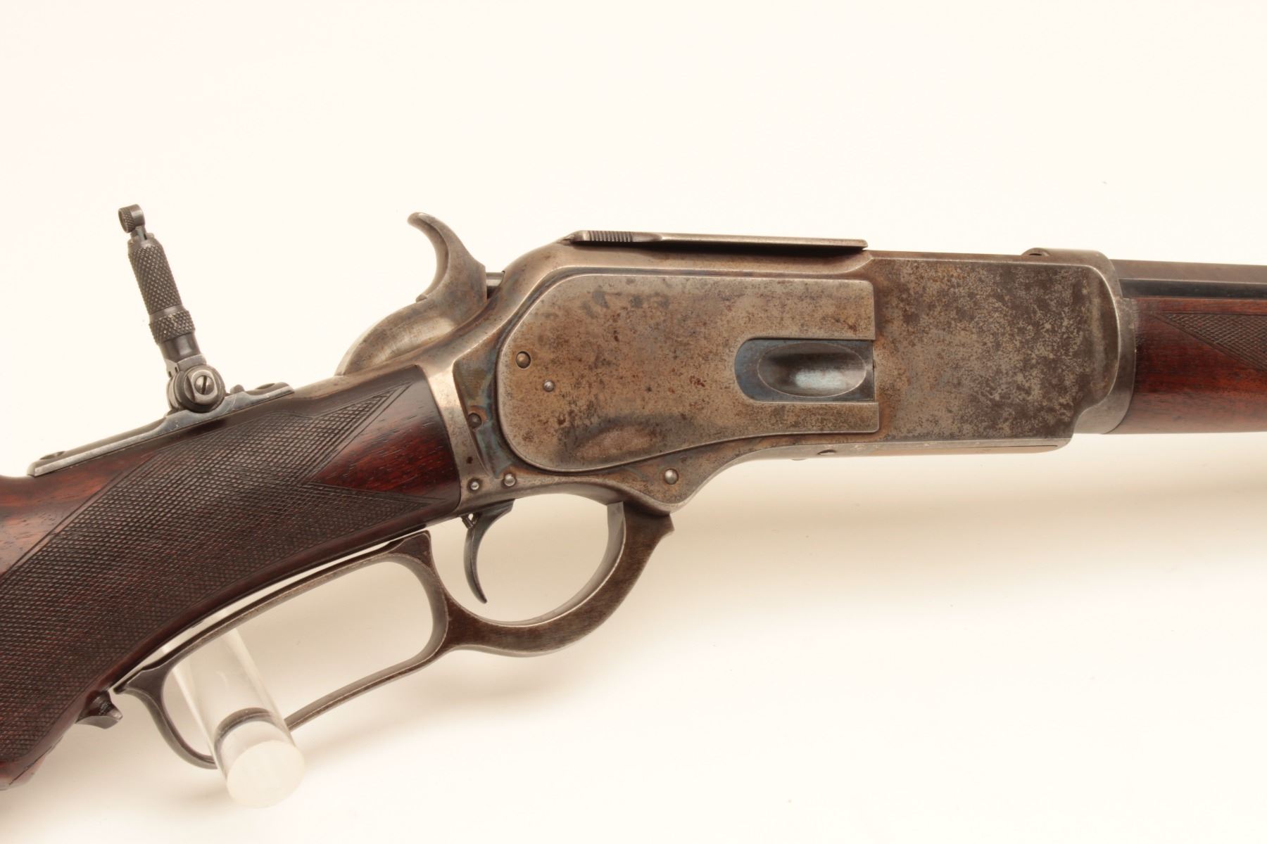 Winchester Model 1876 deluxe rifle in .45-60 caliber with a 28” octagon barrel, full mag, rifle butt, set trigger, checkered deluxe walnut stock, blue and casehardened finish, received in warehouse Sept. 9, 1882 shipped Lot Title Oct 9, 1882 with four other arms to order #27440. This rifle was purchased by the Kimball family who owned the 1st pharmacy in Riverside, California. It was sold to Frank Wright in the 1950’s who was also a Lot Title pharmacist in Riverside along with loading tools and ammo purchased in the 19th century to hunt bear in nearby mountains. This rifle has been in only two collections since new. The rifle retains 50%-70% original blue on Lot Title the barrel and magazine tube drifting to patina with minor pitting and erosion just starting. Good barrel address and sharp markings. Express rear sight and beech front (Gold plated). The frame shows 50%-60% case Lot Title colors naturally aging and drifting to silvery gray with some rainbows showing at the edges and in patina. The dust cover and loading gate show 50%-70% bright blue. 30%-50% case colors mixed in patina on the