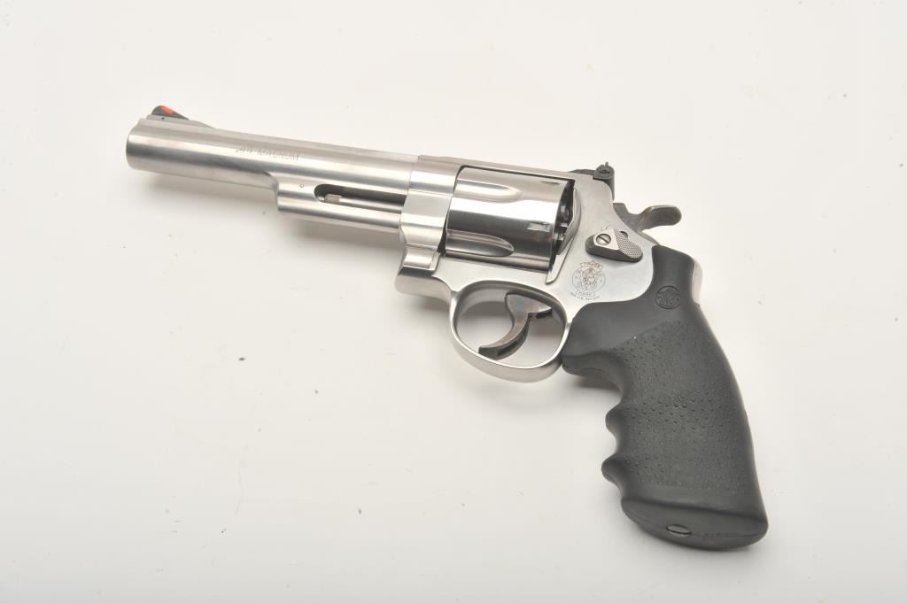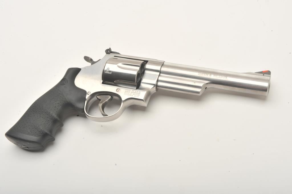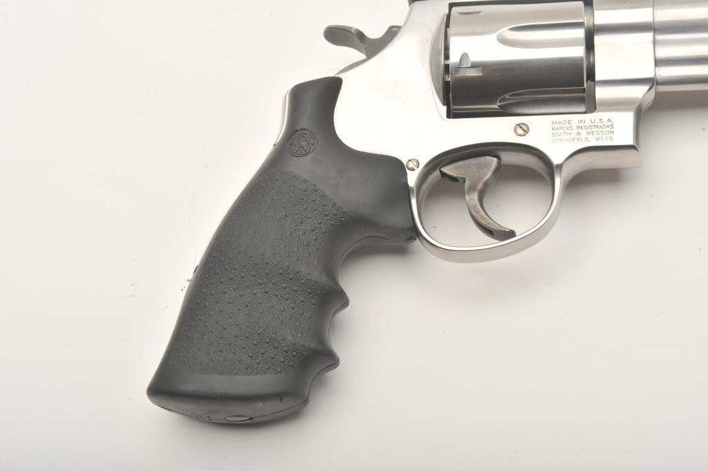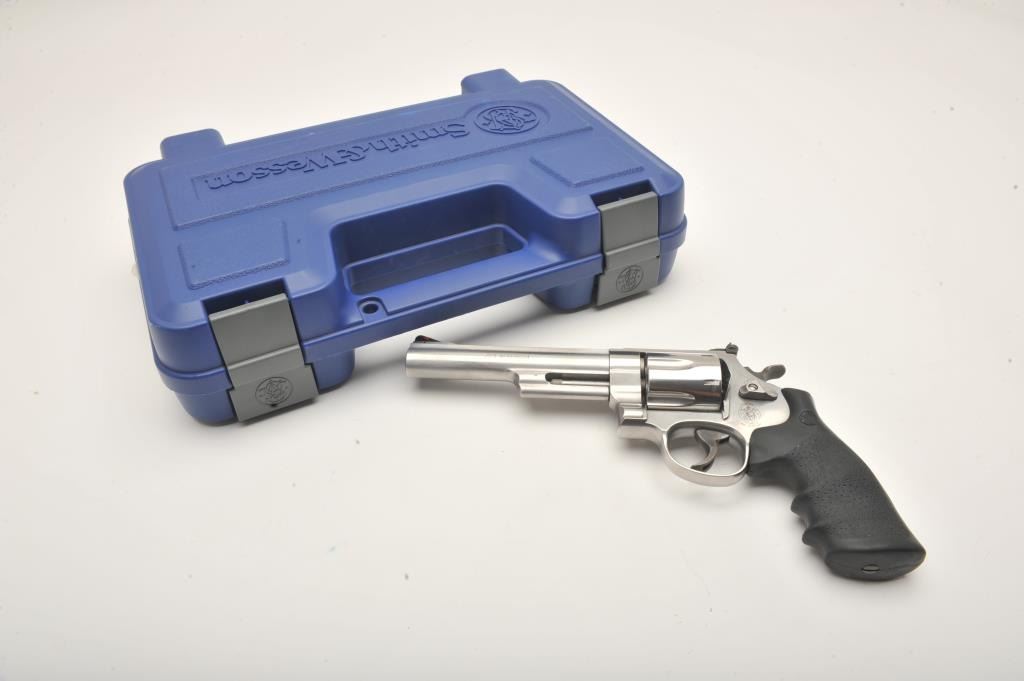 Smith & Wesson Model 629-6 DA revolver, .44 Magnum caliber, 6” barrel, stainless, stippled finger groove hard rubber grips, S/N CMW9879, with factory hard carry case and instructions; gun is in overall very good tofine condition with a fine bore, crisp action, sharp marking and very good grips. (Modern/PPT). Est.: $700-$1,200.