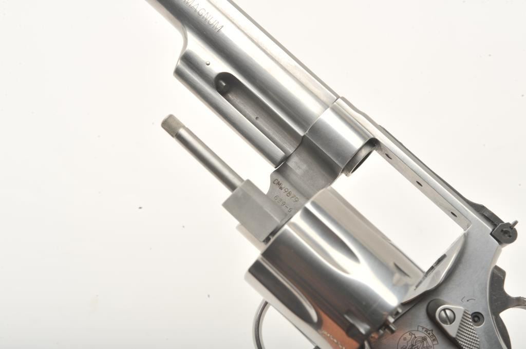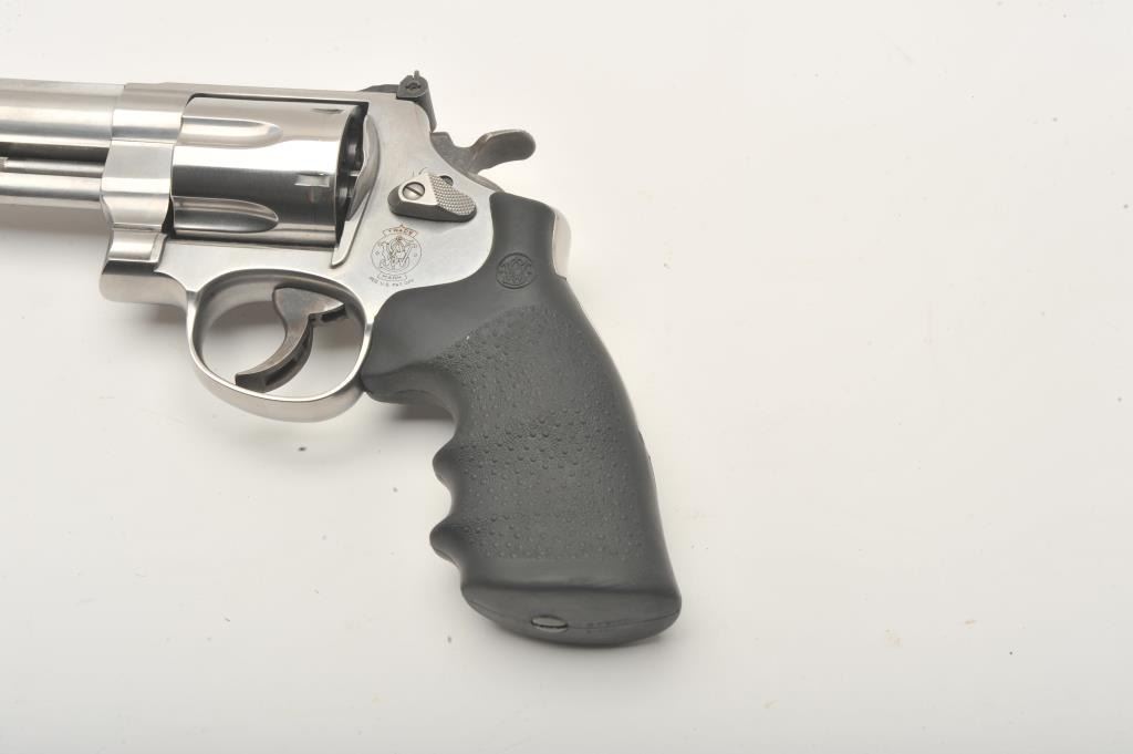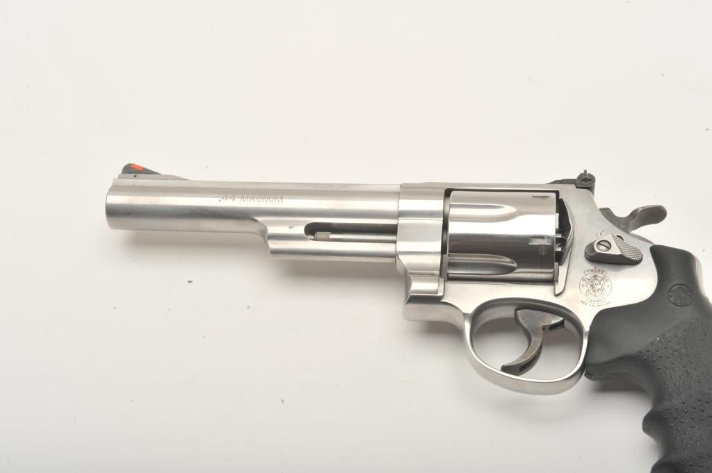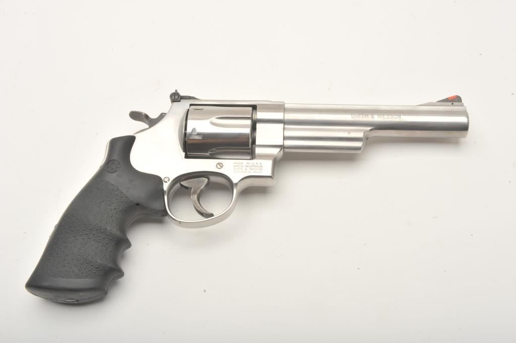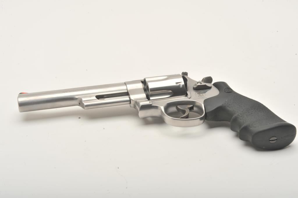 Smith & Wesson Model 629-6 DA revolver, .44 Magnum caliber, 6” barrel, stainless, stippled finger groove hard rubber grips, S/N CMW9879, with factory hard carry case and instructions; gun is in overall very good tofine condition with a fine bore, crisp action, sharp marking and very good grips. (Modern/PPT). Est.: $700-$1,200.