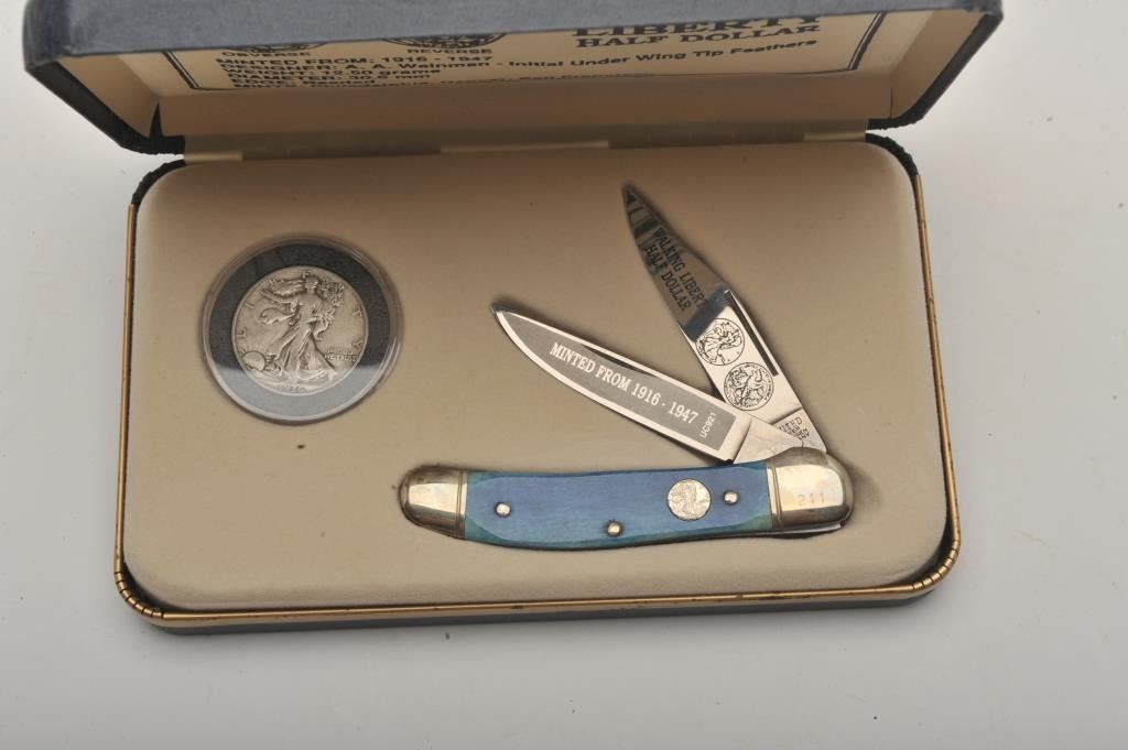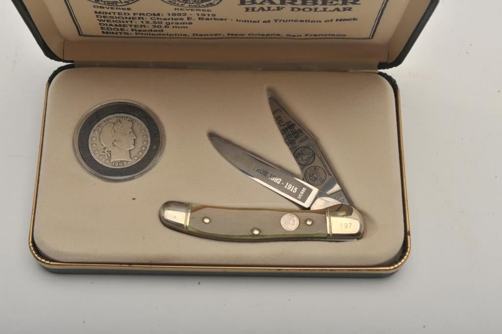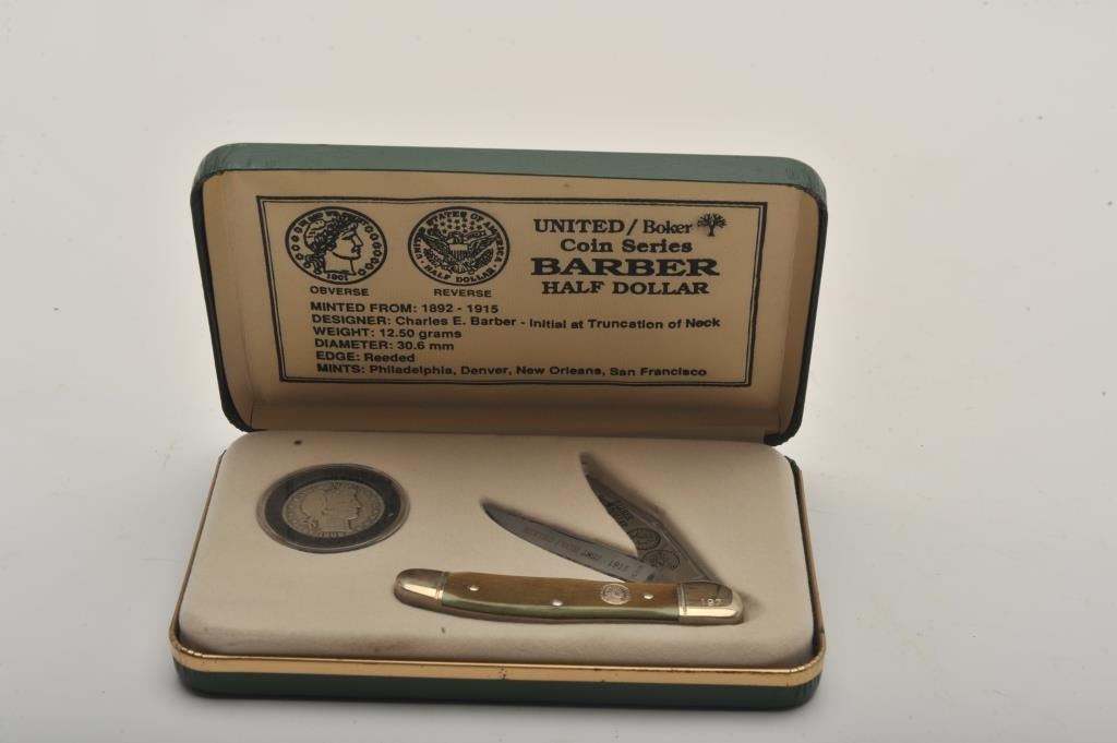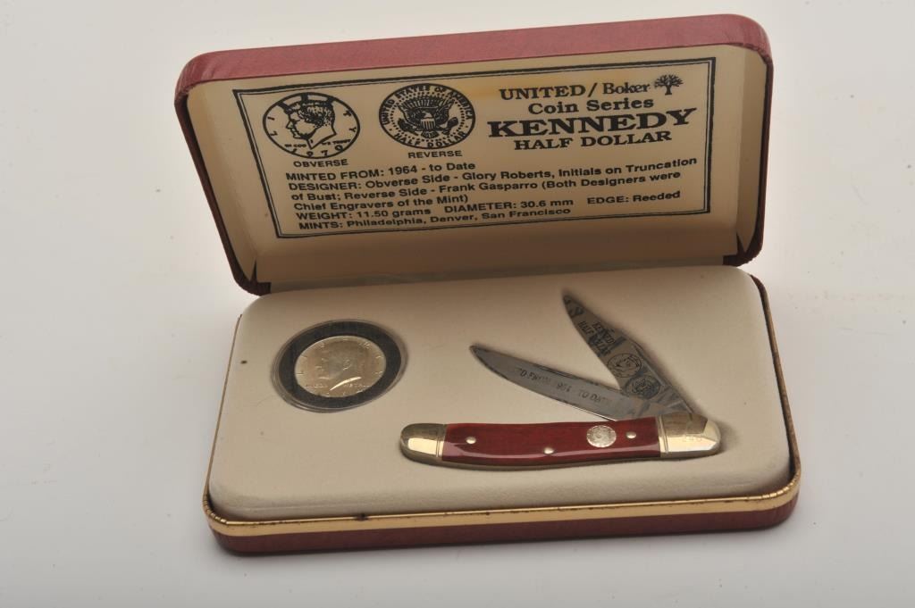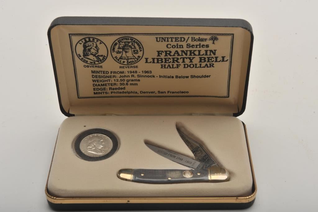 Lot of four commemorative cased folding knives by Boker, The Collector Coin and Knife Series. All four cased set include a Boker folder with two etched blades and a collectible coin. The four include: TheBarber half dollar, the Walking Liberty half dollar, the Franklin Liberty Bell half dollar and the Kennedy half dollar. All four sets are as new in the box. Est.: Est.: $150-$300.