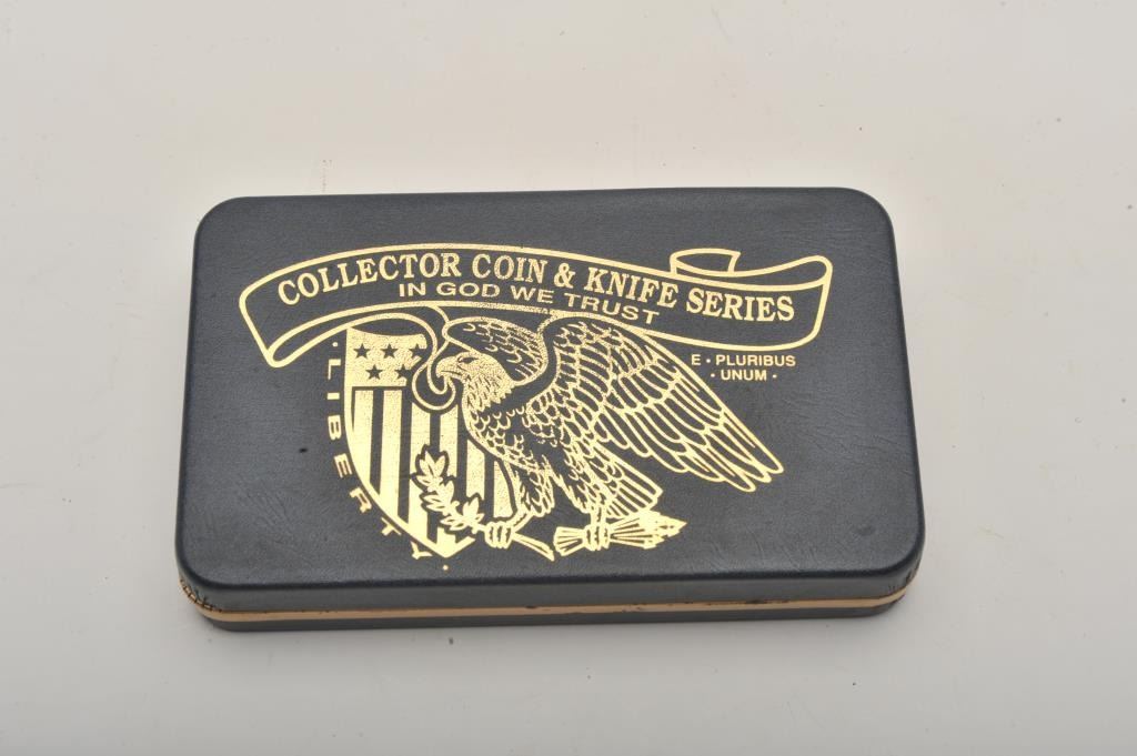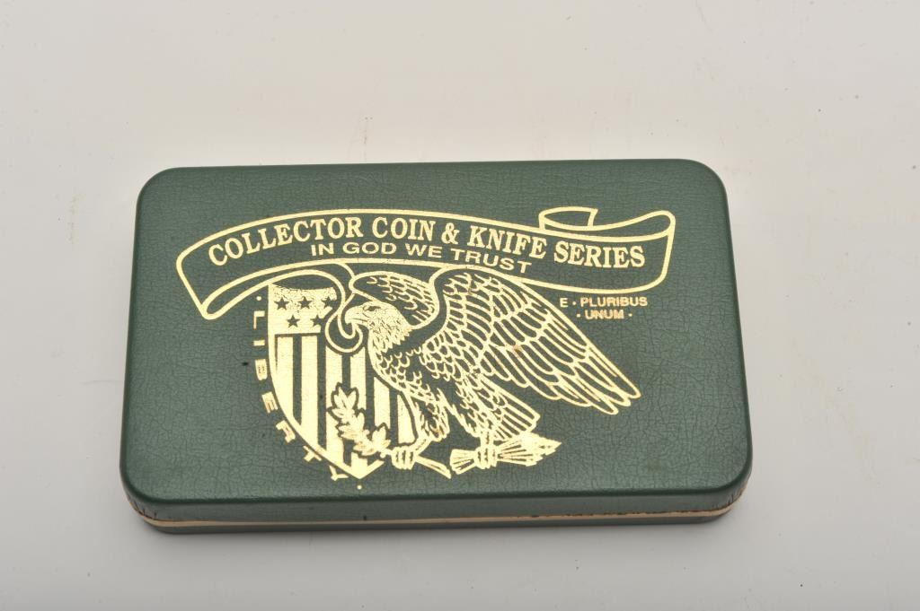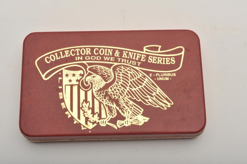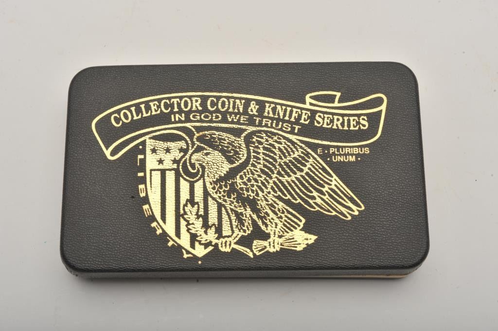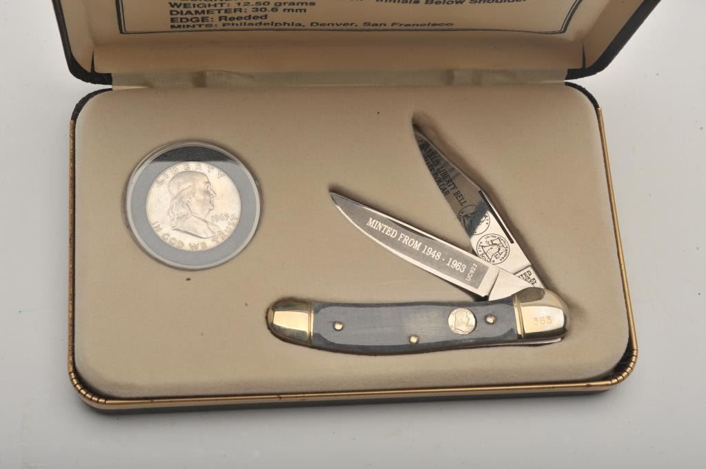 Lot of four commemorative cased folding knives by Boker, The Collector Coin and Knife Series. All four cased set include a Boker folder with two etched blades and a collectible coin. The four include: TheBarber half dollar, the Walking Liberty half dollar, the Franklin Liberty Bell half dollar and the Kennedy half dollar. All four sets are as new in the box. Est.: Est.: $150-$300.