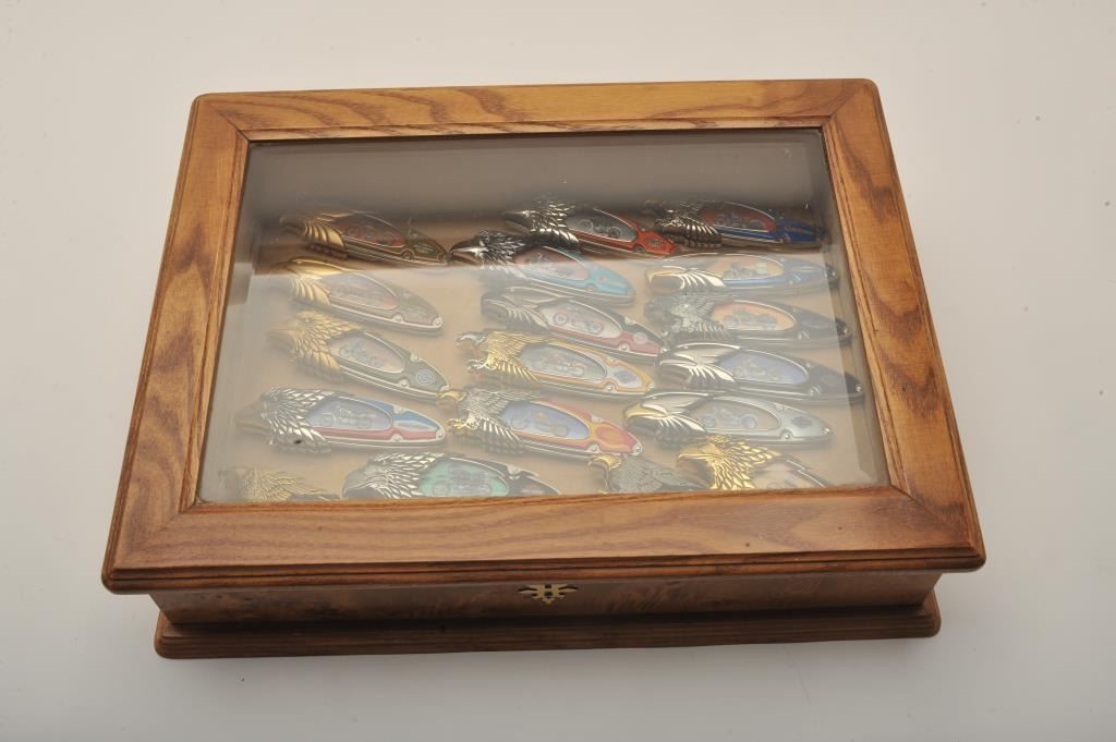 Lot of 19 commemorative Harley Davidson folding knives by the Franklin Mint in a glass top wood display case. The lot includes 19 knives each commemorating a Harley Davidson motorcycle. Each knifeprominently features the eagle emblem and lists the model on the blade. The knives come in a beautiful wood display case with a beveled glass top. This is a great display piece for the knife collector or HarleyDavidson aficionado. The lot includes 19 Franklin Mint marked knife rugs. Est.: $250-$500.