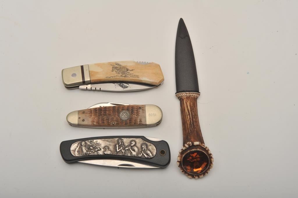 Lot of three folding knives and a letter opener. The first folder is marked NKCA 1989 on the blade for the National Knife Collector’s Association with jigged bone scales and Serial #0051. The second shows aFrederic Remington illustration on its faux ivory scales. The third, the blade is marked, “SEASON’S GREETINGS 1987 PARKER CUTLERY” with an embossed religious scene and scripture on the scales. The letter openeris meant to resemble a Scottish dagger in faux antler. Est.: $100-$200.