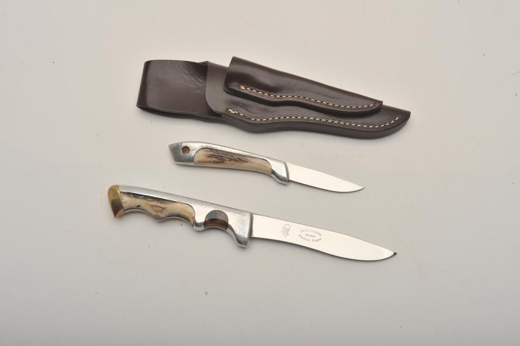Pair of Dave Murphy custom fixed blade knives in double sheath, Serial #1. The lot includes a set of knives limited to 50 sets. The smaller knife is 6 ¼” overall length with a 2 ½” blade of ATS-34 stainless steelmarked, “DAVE MURPHY Blades Gresham, Oregon.” The cast aluminum handle has beautiful stag inserts and the knife is marked with the number “1” on the underside of the grip. The second knife is 8 ¾” overall length with a 4 ¼” blade of D-2 stainless steel marked the same as the first with Dave Murphy’s signature etched on the blade. The cast aluminum handle has Cape buffalo horn and India stag inlay and a brass pommel cap. The blades come with a Gerber Mini-Magnum leather belt sheath with a metal plate inscribed with the above information. This is an extremely limited production set from one of the original blade makers associatedwith the Gerber brand. Est.: $250-$500.