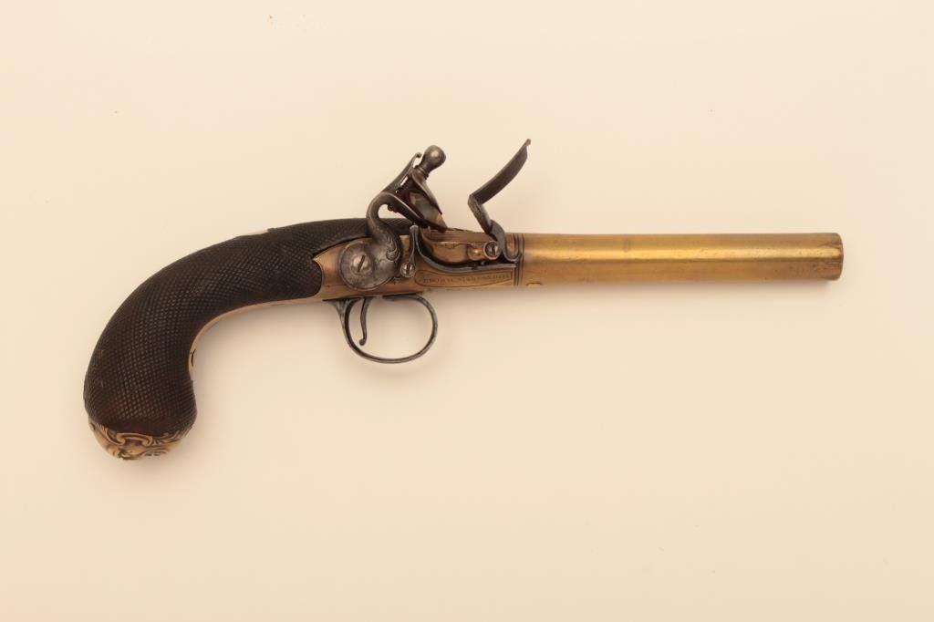 Unusual and near fine aide hammer British flintlock pistol by Bond of Corn Hill, London. Very nicely checkered wood grip with mask butt. Brass frame, barrel, and a few steel parts. .60 caliber smoothbore andmeasures 12 ¾” overall with a 6 ½” barrel. Circa 18th century. Nicely cased with wrench, mold and accessories by collector gunsmith Gary Harrison for his personal collection. Est.: $2500-$5000