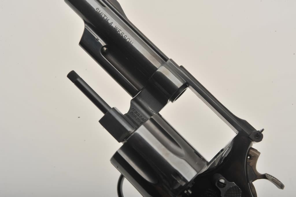 Smith & Wesson Model 29-5 DA revolver, .44 Magnum caliber, 4” barrel, blued finish with Pachmayr checkered hard rubber medallion combat grips, S/N BFM0805; ported and reconditioned with tuned action; fine bore,target hammer and trigger. (Modern/PPT). Est.: $500-$1,000.