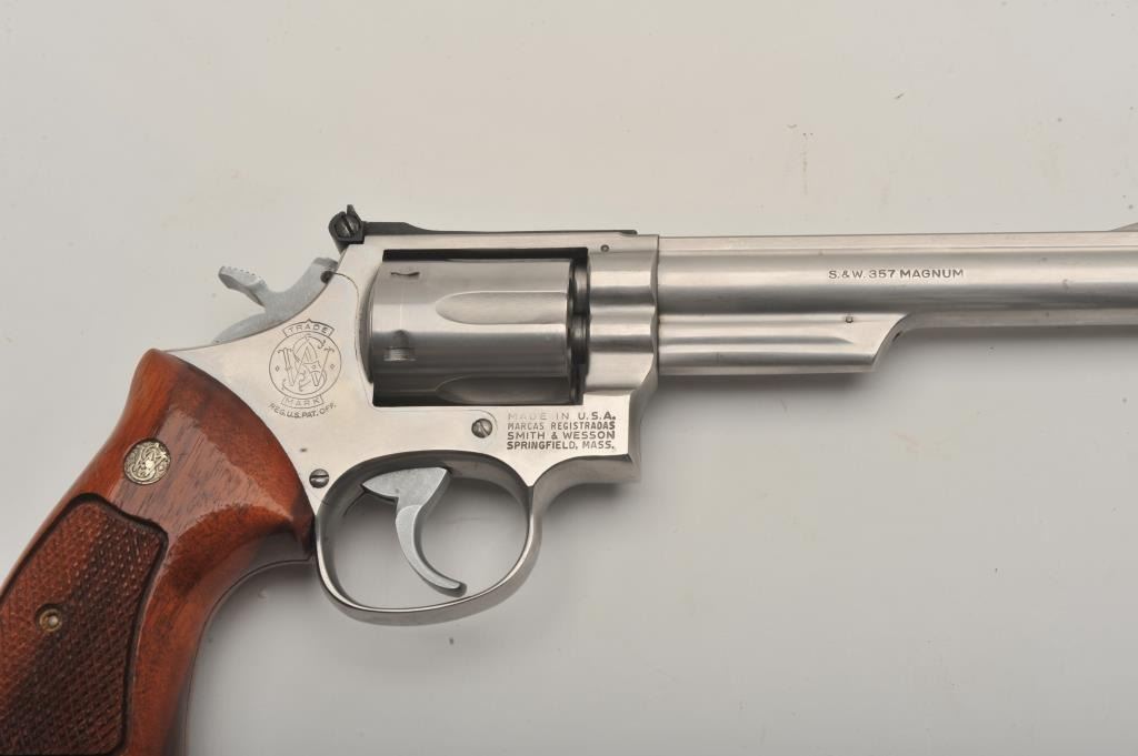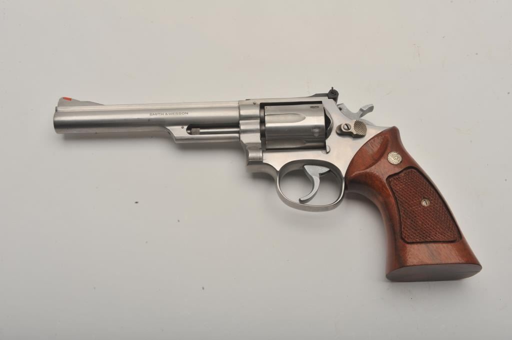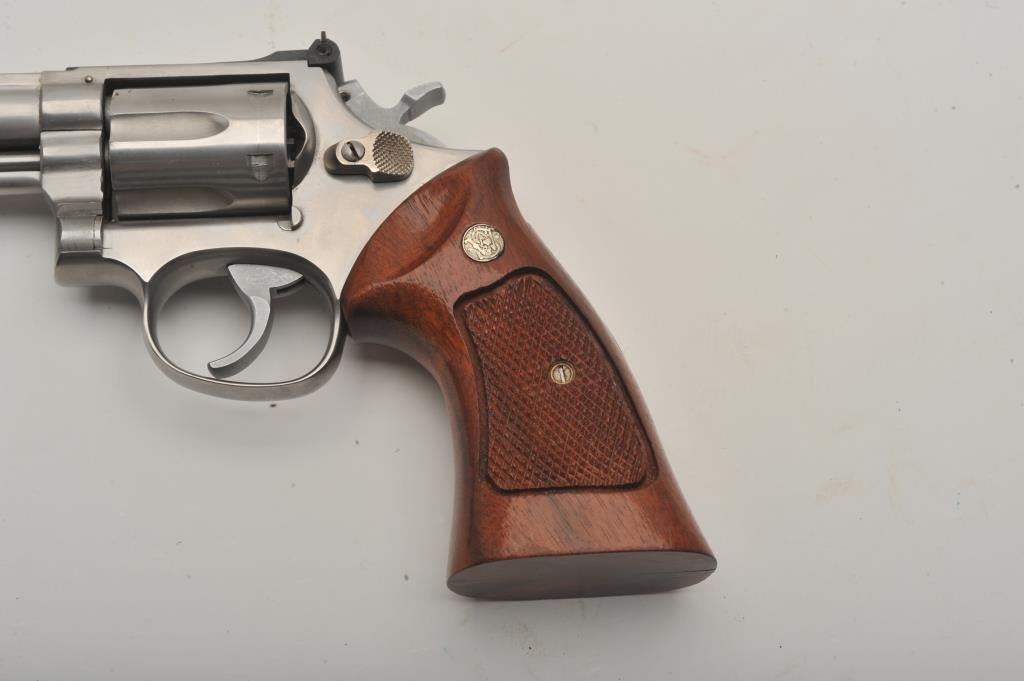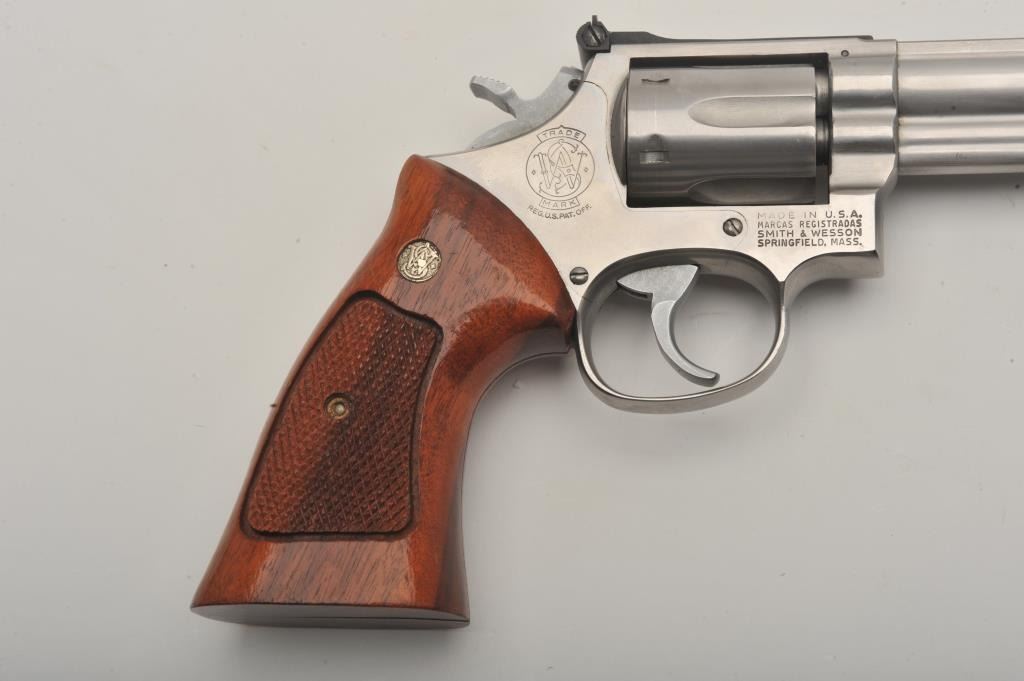 Smith & Wesson Model 66-1 DA revolver, .357 Magnum caliber, 6” barrel, stainless, checkered medallion wood combat grips, S/N 65K1716, in overall fine to excellent condition showing minimal use.(Modern/PPT). Est.: $400-$800.