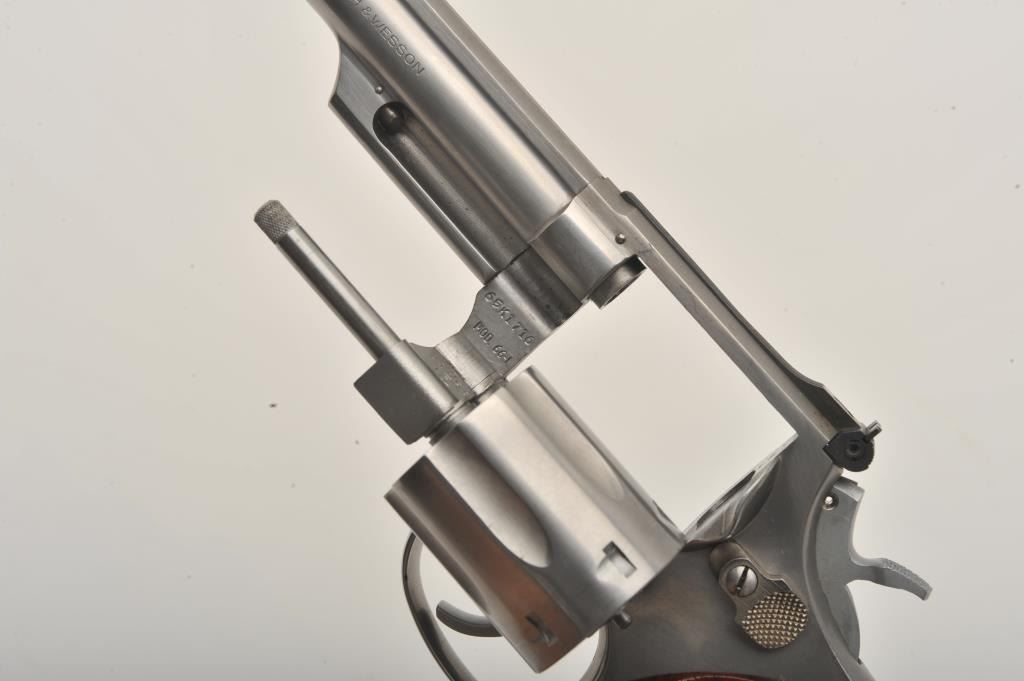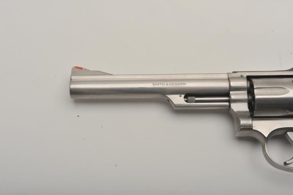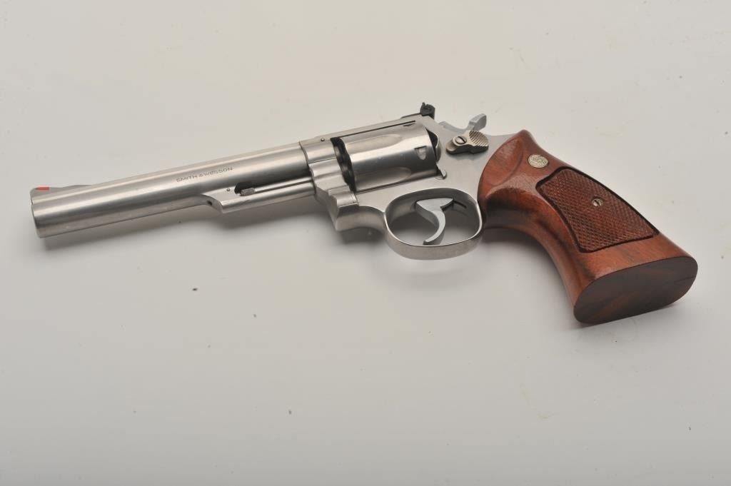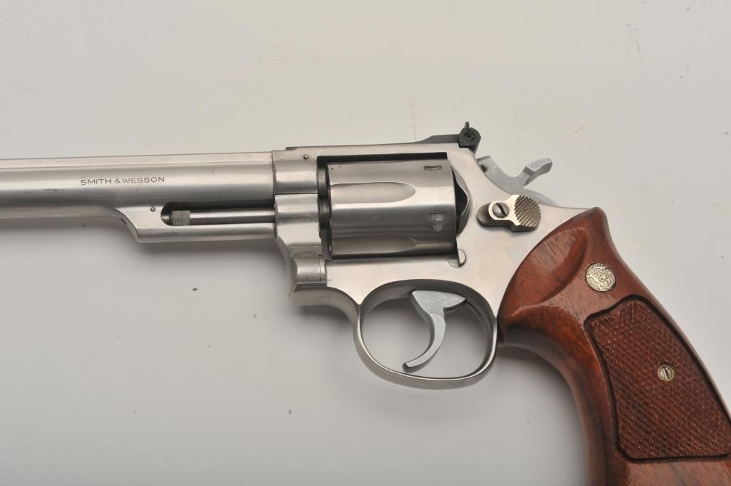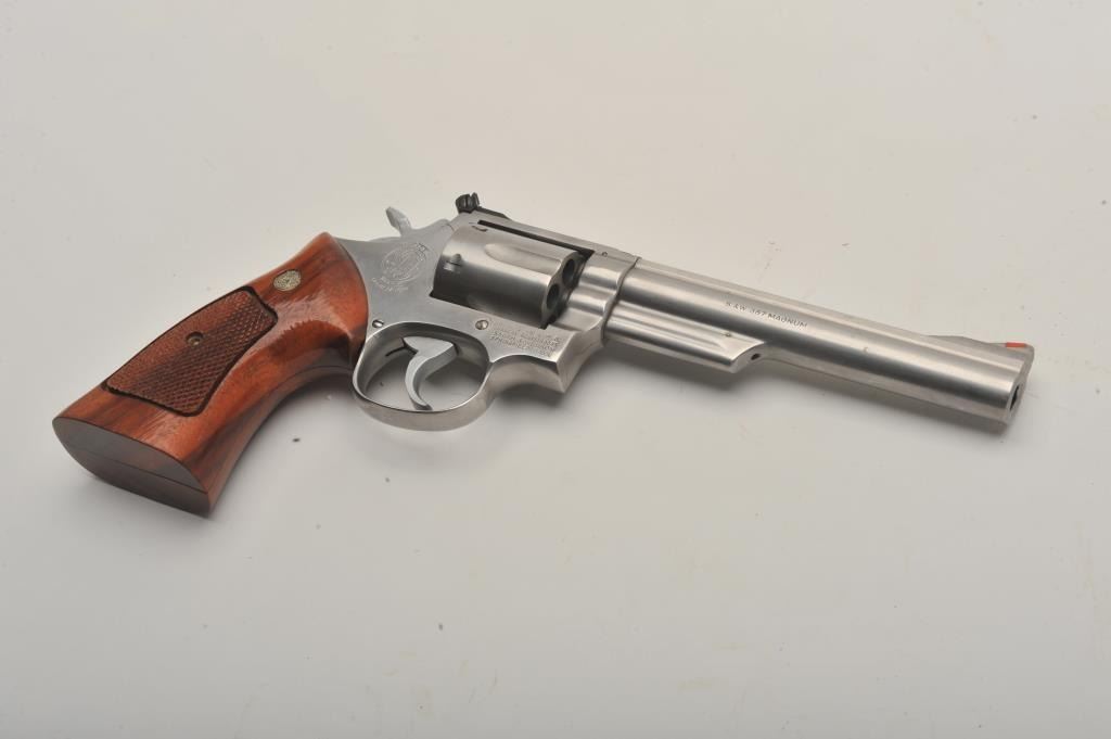 Smith & Wesson Model 66-1 DA revolver, .357 Magnum caliber, 6” barrel, stainless, checkered medallion wood combat grips, S/N 65K1716, in overall fine to excellent condition showing minimal use.(Modern/PPT). Est.: $400-$800.