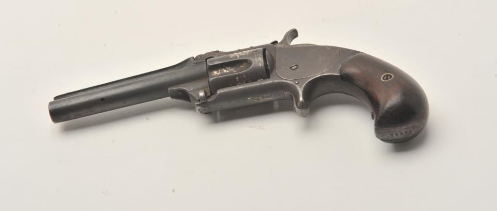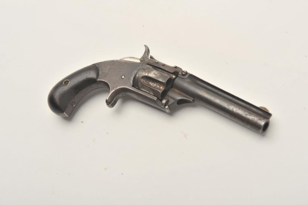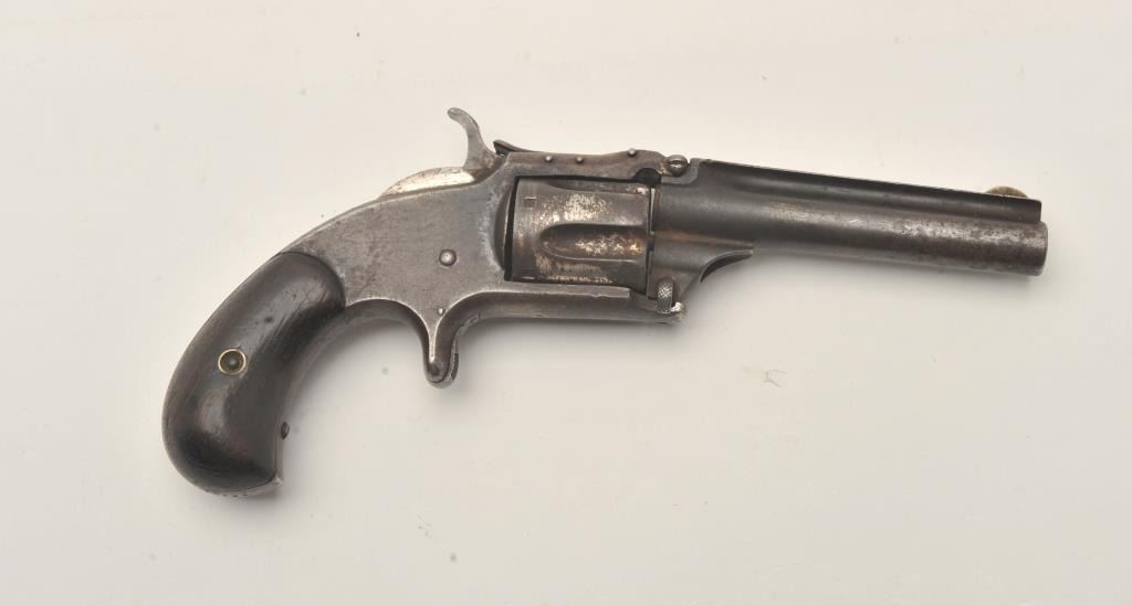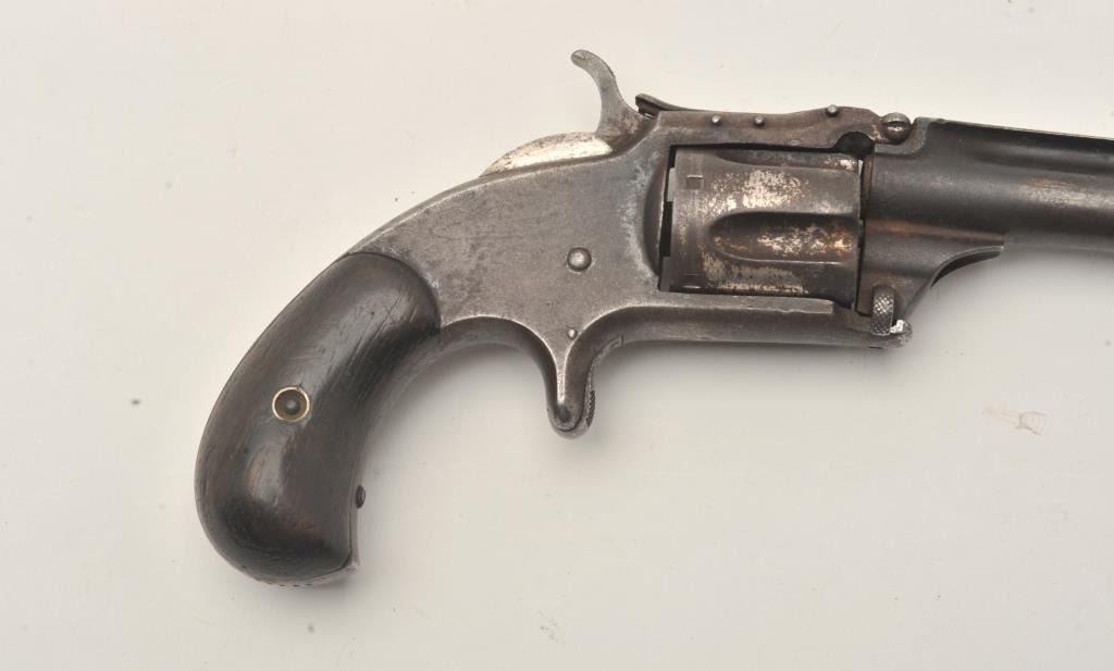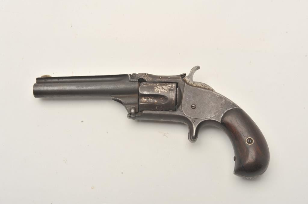 Smith & Wesson Model 1-1/2 Second Issue spur trigger revolver, .32RF caliber, 3.5” barrel, dark patina finish with traces of nickel finish on cylinder, rosewood grips, S/N 43781, overall fair to good condition withdark bore, good markings, action needs adjustment, good grips. (Antique). Est.: $150-$300.