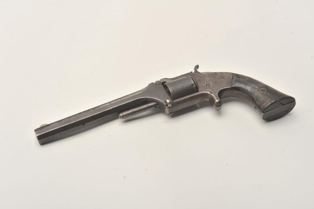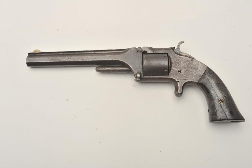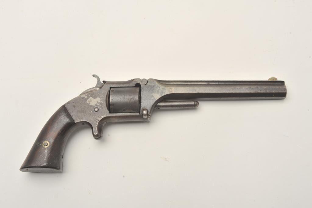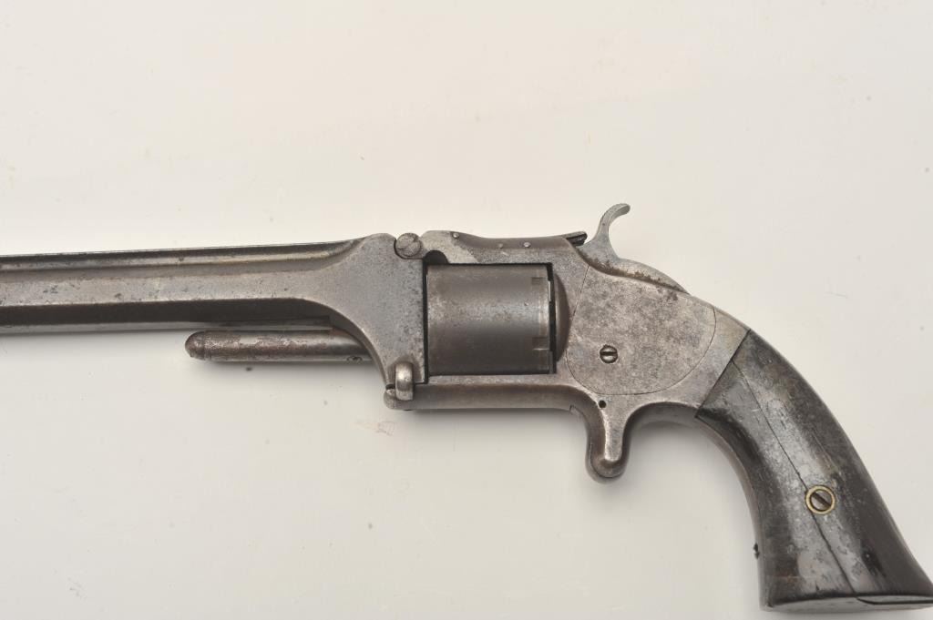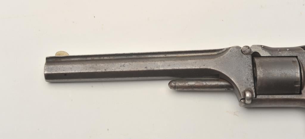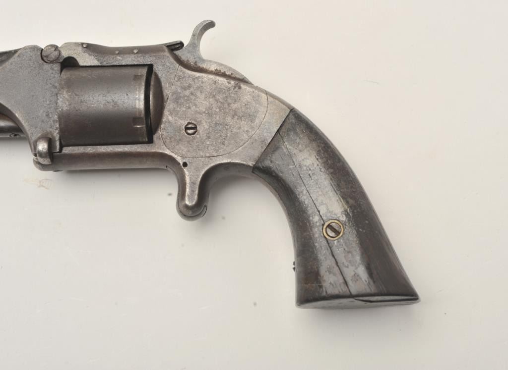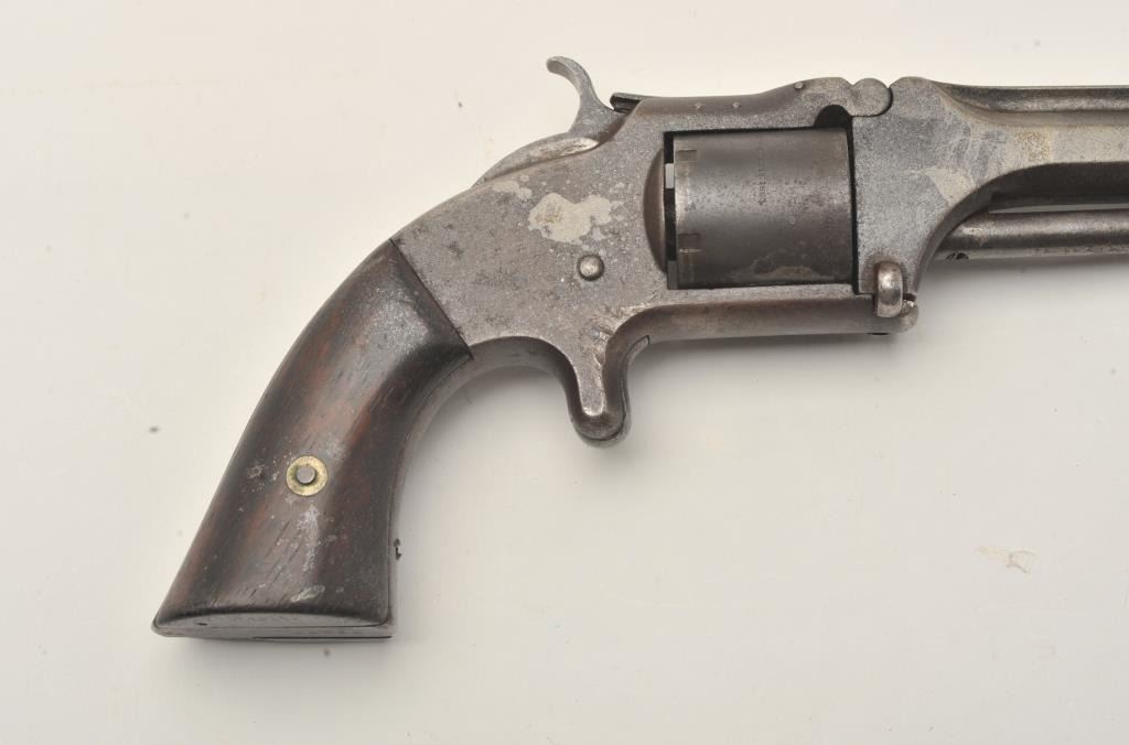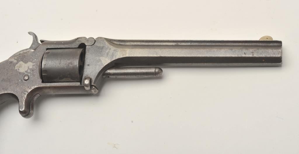 Smith & Wesson No. 2 Army spur trigger revolver, .32RF caliber, desirable 6” octagon barrel, S/N 53354, overall fair to good, dark patina with scattered areas of pinprick pitting, working action but not staying onfull cock, dark bore, grips show wear and old repaired crack to left grip. (Antique). Est.: $150-$300.