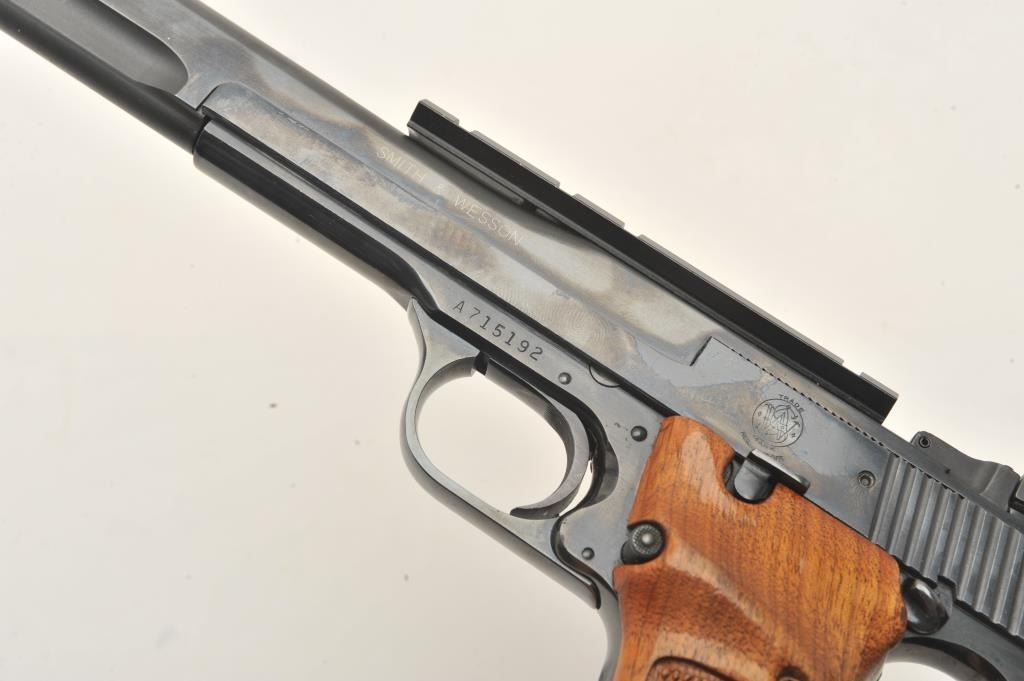 Smith & Wesson Model 41 semi-automatic pistol, .22 LR caliber, Serial #A715192. The pistol is in very good overall condition with a 7” barrel with a ramped blade front and adjustable rear sights. A one-piecescope mount has been added during the period of use. The metal surfaces retain the majority of their blue finish with wear at the muzzle and small mars from carry and use. The checkered wood target grips are in very good condition with sharp checkering and light handling marks. The bore is good, the action is crisp and the markings are sharp. The lot includes one correct, S& W marked magazine. Est.: $350-$700. (Modern/PPT).