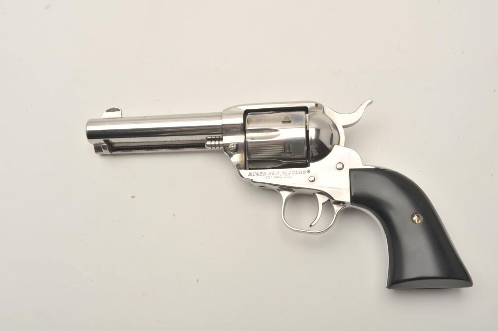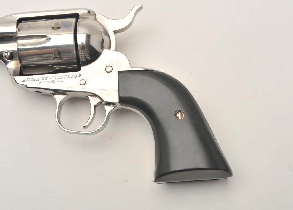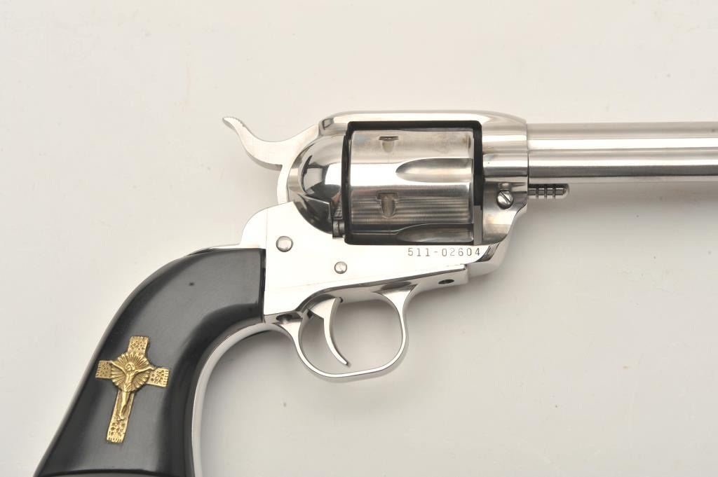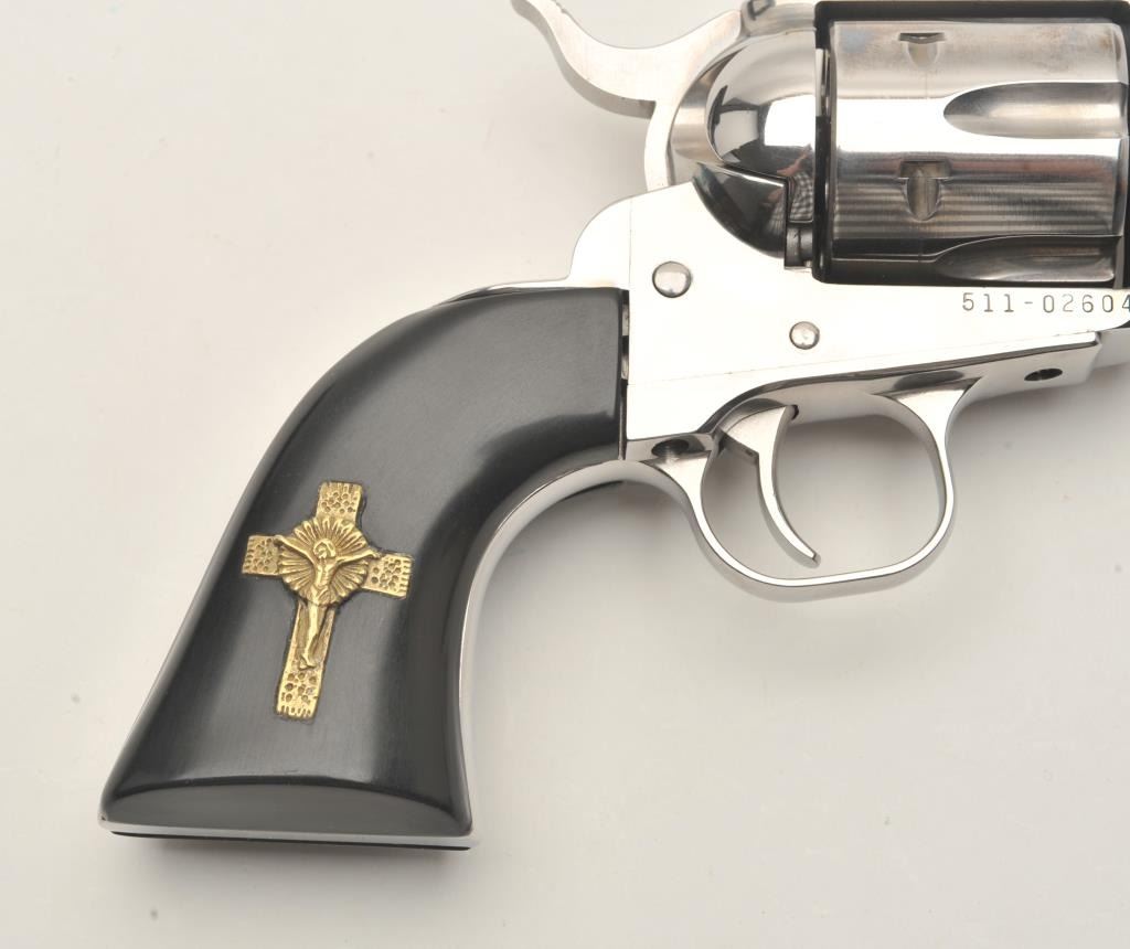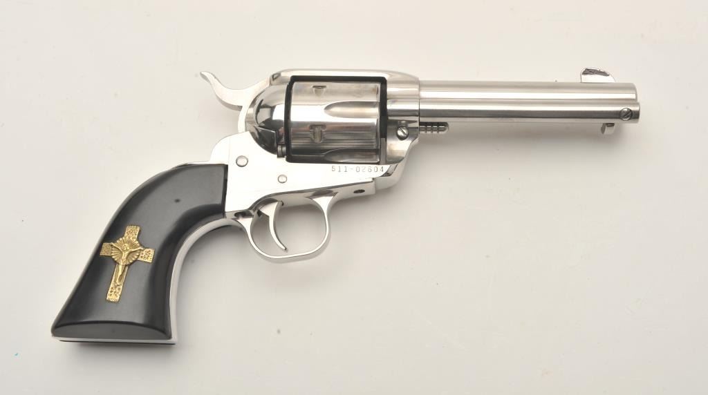 Ruger New Vaquero revolver, .357 Magnum caliber, Serial #511-02604. The pistol is in fine overall condition with a 4 5/8” barrel. The metal surfaces retain nearly all of their polished stainless steel finish withonly light handling marks. The top of the front sight has been painted black for increased visibility. The custom smooth ebony grips are in very good condition with a gold tone crucifix inlayed into the rightpanel. The lot includes an additional set of black, laminated wood grips as well. The bore is very good, the action crisp and markings are sharp on this lightly used Ruger. See lot #317 for another Vaquero with the, “3:10 to Yuma” grip treatment. Est.: $300-$600. (Modern/PPT).