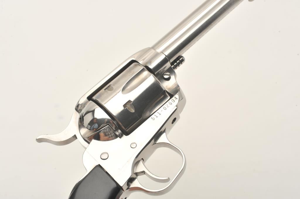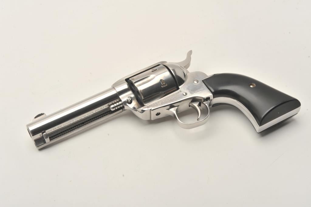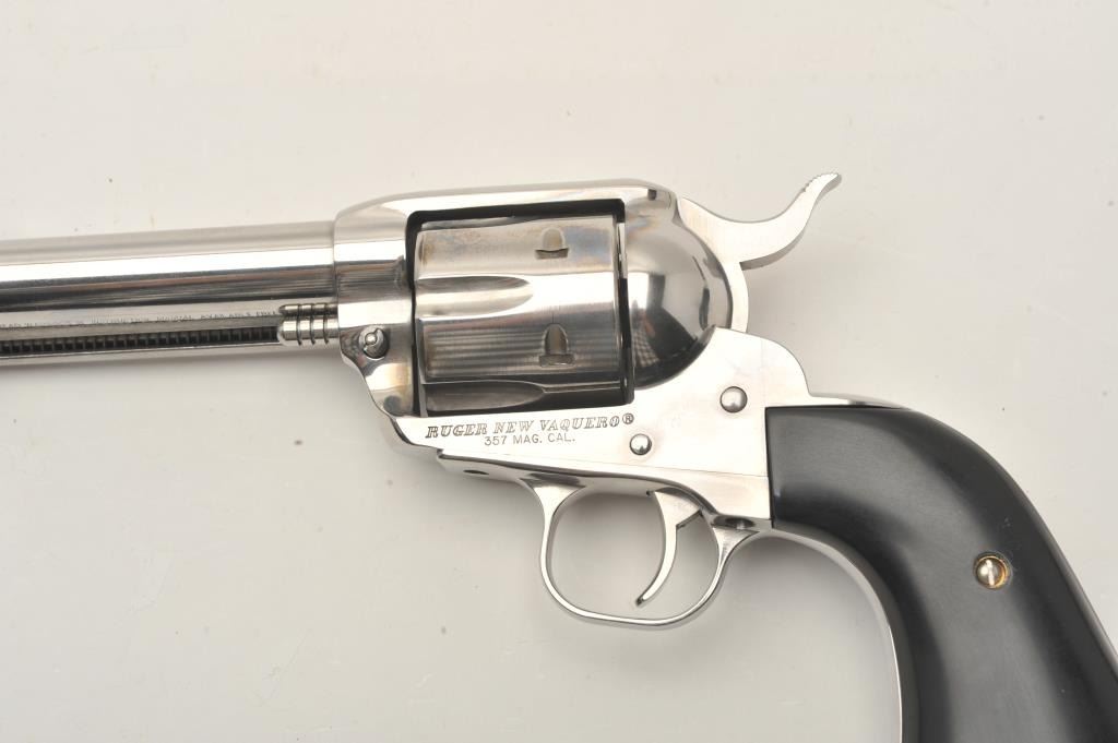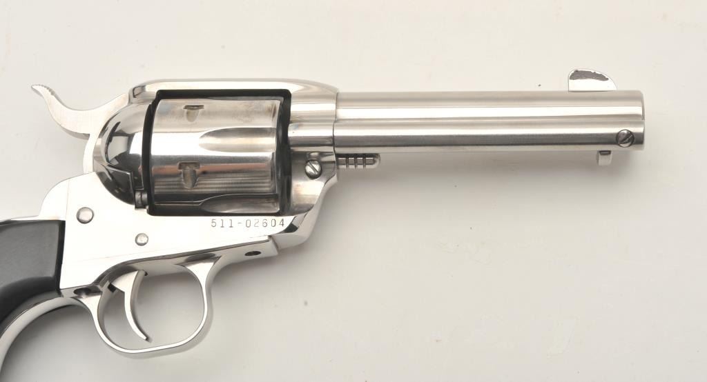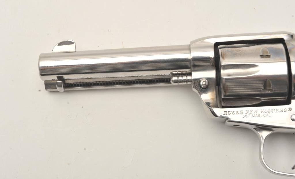 Ruger New Vaquero revolver, .357 Magnum caliber, Serial #511-02604. The pistol is in fine overall condition with a 4 5/8” barrel. The metal surfaces retain nearly all of their polished stainless steel finish withonly light handling marks. The top of the front sight has been painted black for increased visibility. The custom smooth ebony grips are in very good condition with a gold tone crucifix inlayed into the rightpanel. The lot includes an additional set of black, laminated wood grips as well. The bore is very good, the action crisp and markings are sharp on this lightly used Ruger. See lot #317 for another Vaquero with the, “3:10 to Yuma” grip treatment. Est.: $300-$600. (Modern/PPT).