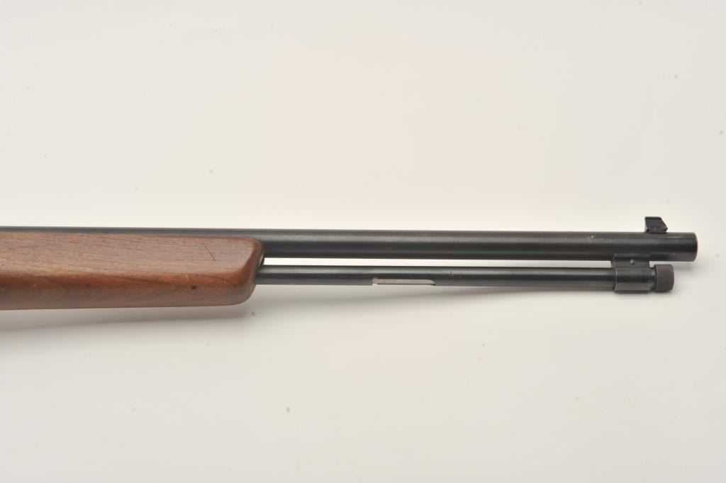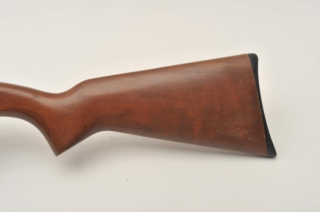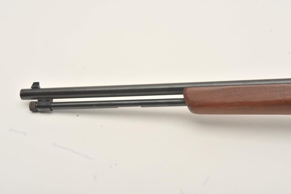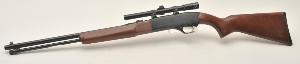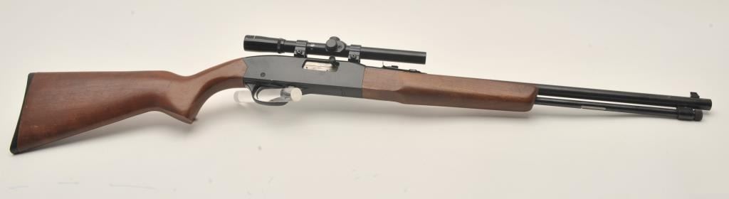 Winchester Model 190 semi-automatic rifle, .22 S, L or LR caliber, Serial #691600. The rifle is in good overall condition with a 20” barrel and full-length tube magazine. The metal surfaces retain the majority of theirblue finish with wear at the muzzle, small scrapes and scratches. The smooth wood stocks are in good condition showing moderate wear with compressions and dents from carry and use. The butt ends with a Winchestermarked plastic butt plate. The bore is fair, the action crisp and markings are legible. The rifle is topped two-piece scope mounts and a Tasco 4 x 15 fixed power scope. Est.: $150-$300. (Modern).