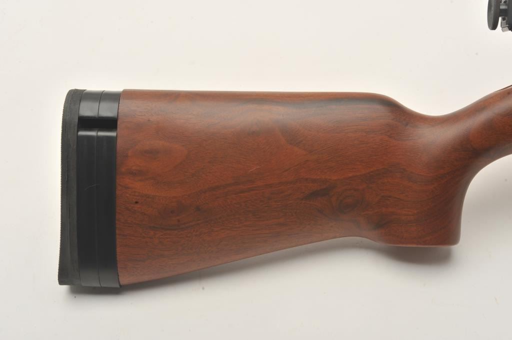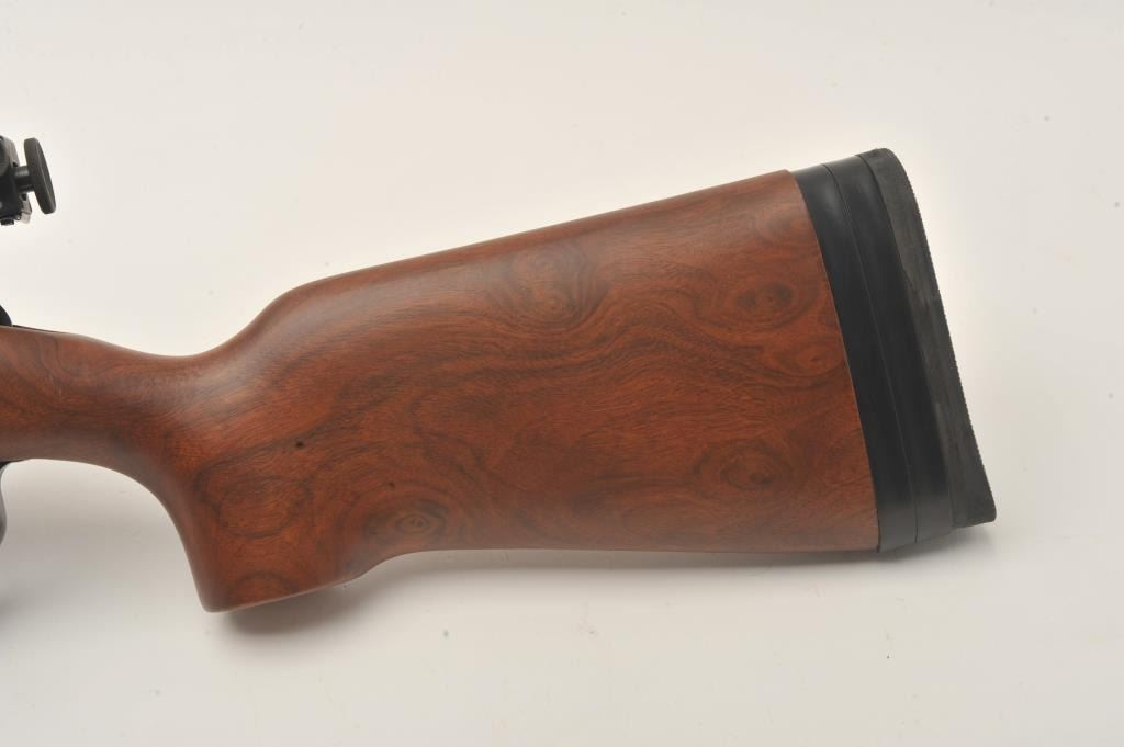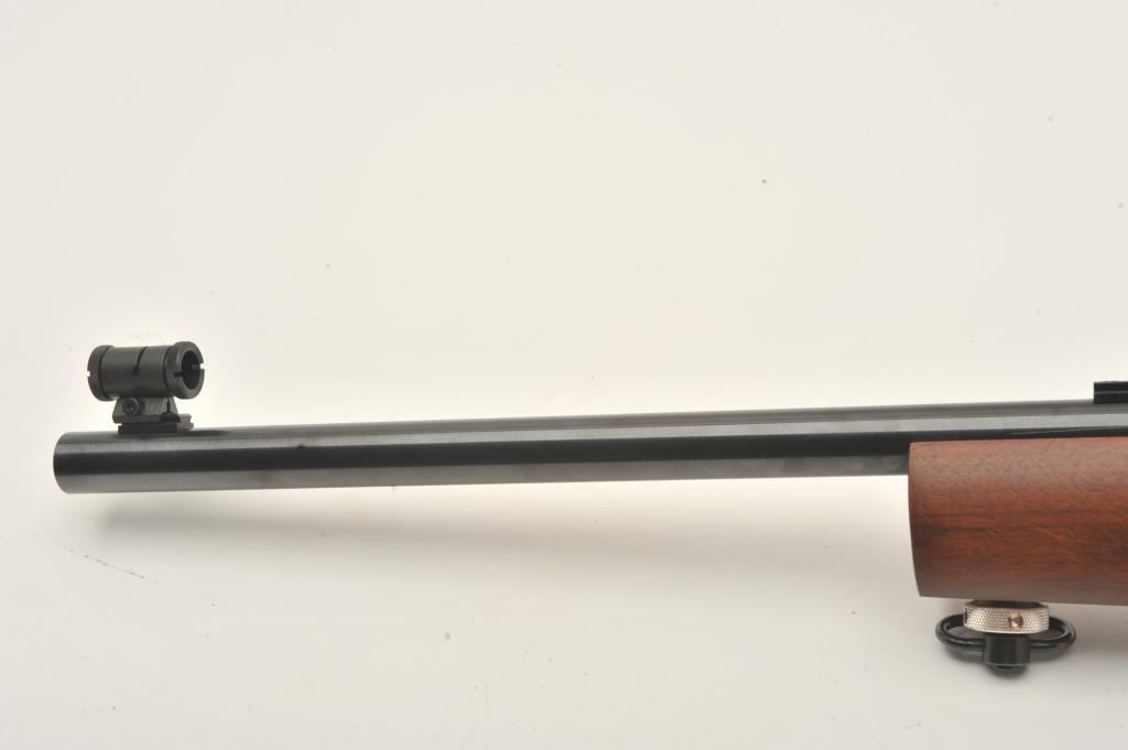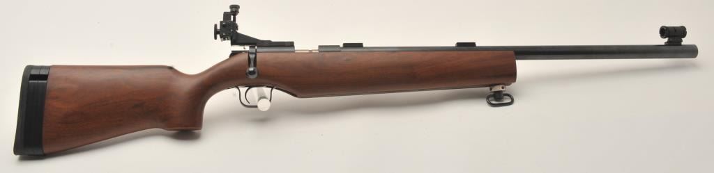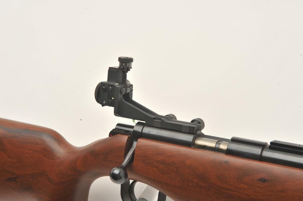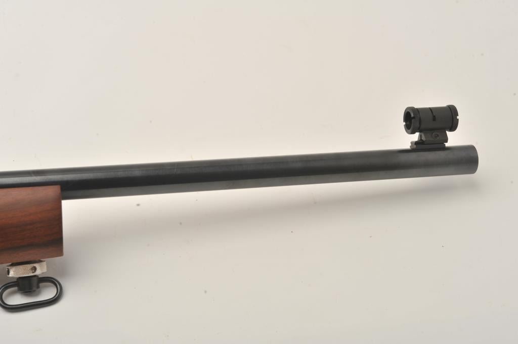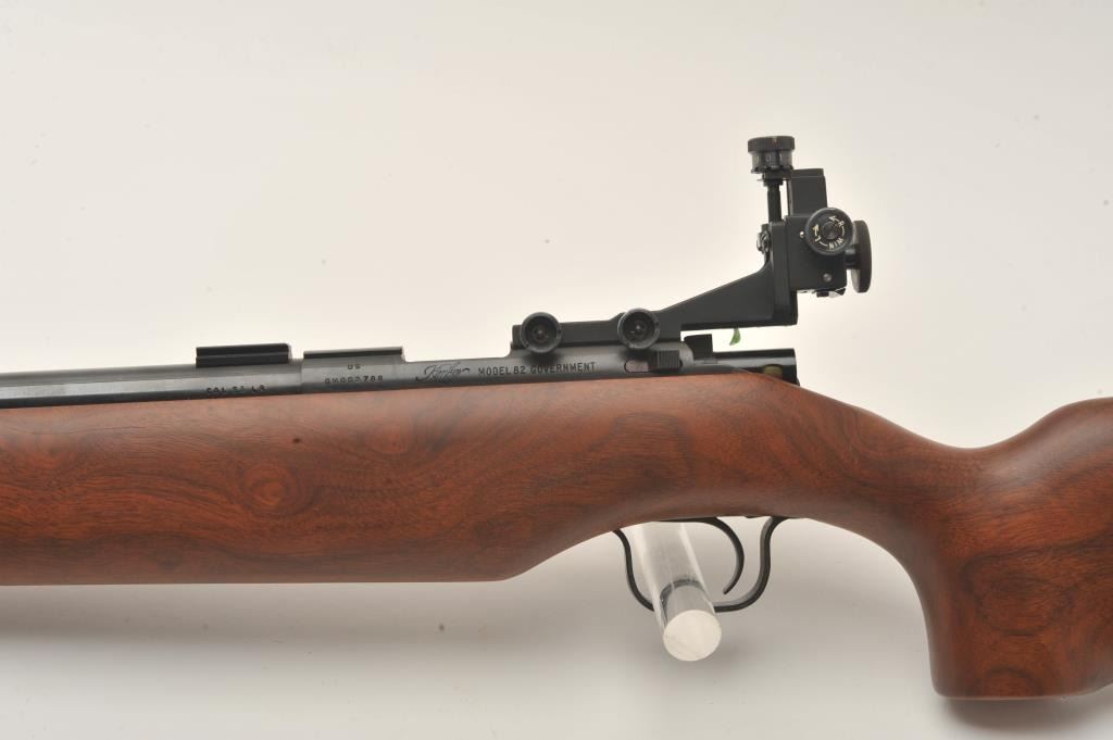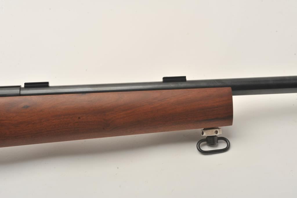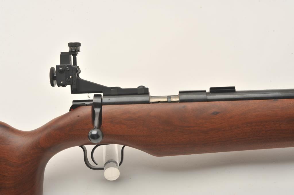 Kimber Model 82 Government single shot target rifle, .22 LR, Serial #GM003788. The rifle is in fine overall condition with a 25” heavy bull barrel with a globe front and rear sights removed. The metal surfaces retainnearly all their blue finish with scope bases added to the rear of the barrel. A Kimber marked aperture sight has been added to the rear of the action. The smooth wood stock is in very good condition with an aluminummounting system under the fore end. The butt stock ends with a rubber butt pad with two plastic spacers providing a 13” LOP. The bore is good, the action is crisp and markings are sharp on this Oregon Kimbersingle shot. Est.: $600-$1,200. (Modern).