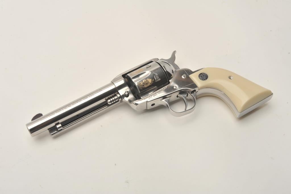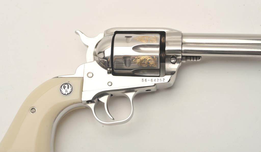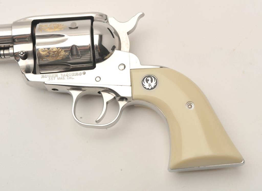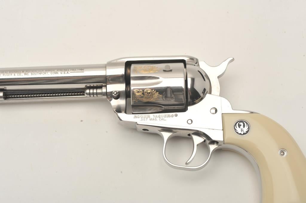 Ruger Vaquero revolver, .357 Magnum caliber, Serial #56-64252. The pistol is in fine overall condition with a 5 ½” barrel. The metal surfaces retain nearly all of their polished stainless steel finish with onlylight handling marks noted. The top of the front sight has been colored black for increased visibility. The cylinder has factory gold engraving between the flutes and a faint drag line. The smooth medallionfaux ivory grips are in very good condition showing little wear. The bore is very good, the action crisp and markings are sharp on this desirable Ruger Vaquero. Est.: $400-$800. (Modern/PPT).