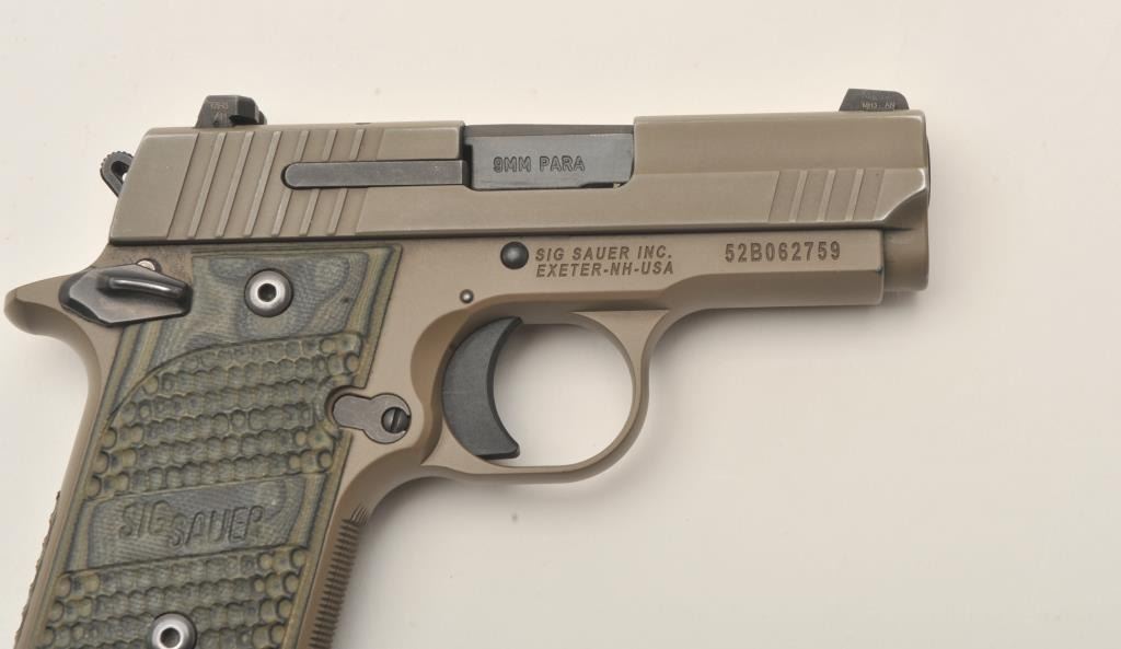 Sig Sauer Model P938 Scorpion semi-automatic pistol, 9mm caliber, Serial #52B062759. The pistol is in very good to nearly fine overall condition with a 3” barrel. The metal surfaces are finished in a matte desert tancolor. The pistol shows light holster wear at the muzzle and features Sig-Lite night sights. The textured synthetic grips are in very good condition with little wear. The bore is good, the action is crisp andmarkings are sharp. The lot includes the factory hard case with a Kydex holster and two magazines. Est.: $400-$800. (Modern/PPT).
