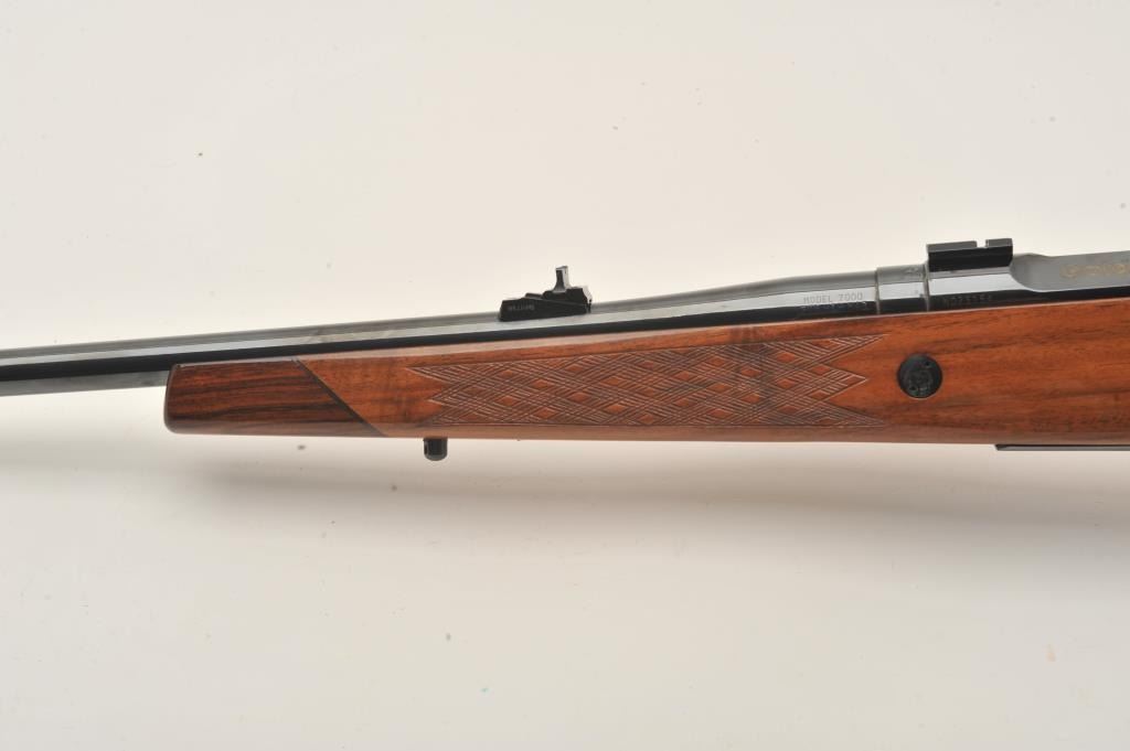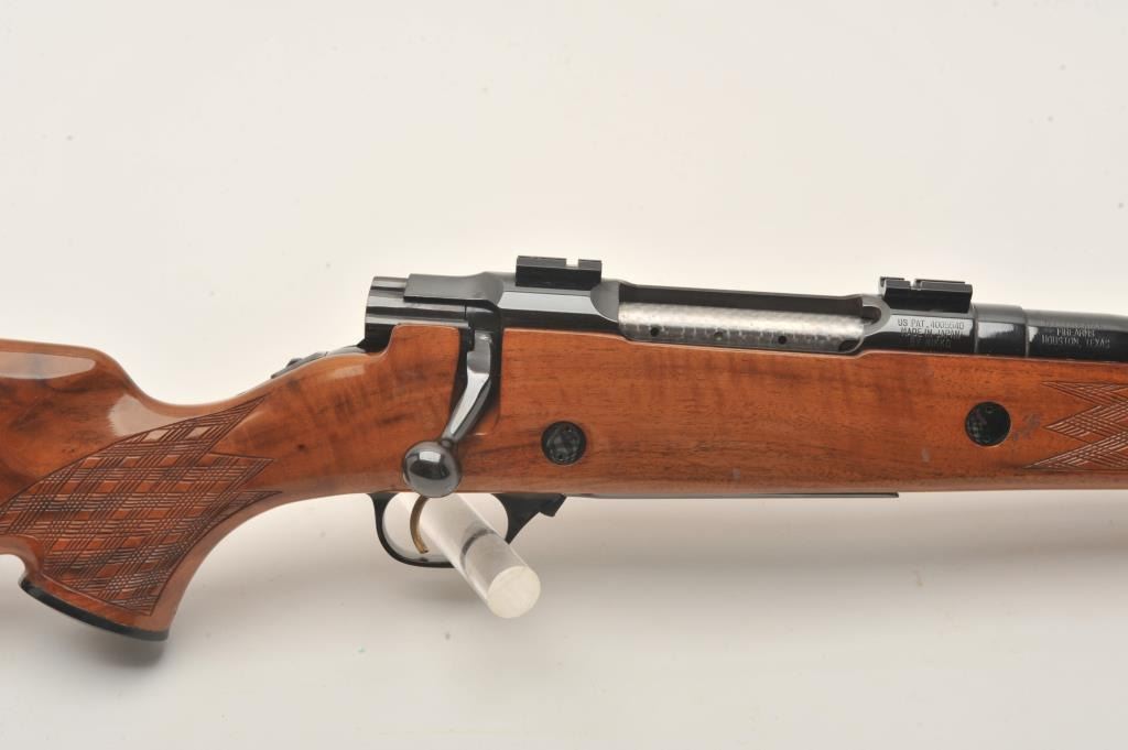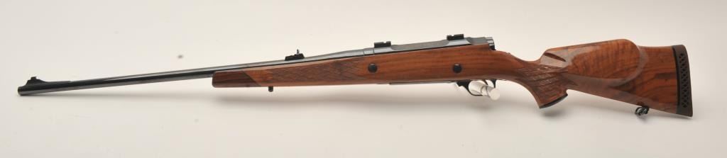 Nikko Model 7000 Golden Eagle bolt action rifle, .375 H&H caliber, Serial #N023154. The rifle is in very good overall condition with a 26”barrel with a ramped front and adjustable rear Williams sights. The metalsurfaces retain nearly all of their high polish blue finish. The receiver is drilled and tapped, the bolt has been jeweled and the rifle is topped with Weaver scope bases. The finely checkered Walnut stock is nicelyfigured with sharp checkering, dual heavy recoil pins, Monte Carlo cheek piece and has some small mars and compressions from carry and use. The stock has a Rosewood fore end, flared pistol grip and ends with a ventilated rubber recoil pad providing a 14” LOP to a gold trigger. The rifle was manufactured in Japan by Nikko and distributed by Golden Eagle of Houston, Texas. Long out of production this one has a very good bore,crisp action and sharp markings. Est.: $750-$1,500. (Modern).