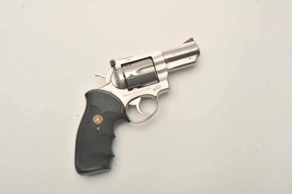 Ruger Security Six revolver, .357 Magnum caliber, Serial #159-7725. The pistol is in fine overall condition with a 2 5/8” barrel with a ramp front and adjustable rear sights. The pistol retains nearly all of its mattestainless steel finish with light handling marks. The checkered rubber Pachmayr combat grips are in very good condition showing little wear. The bore is good, the action is crisp and markings are sharp on this lightly used Ruger. Est.: $300-$600. (Modern/PPT).