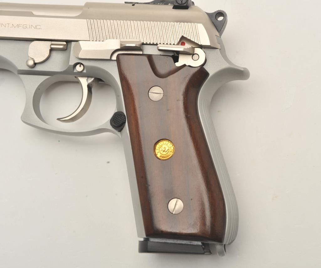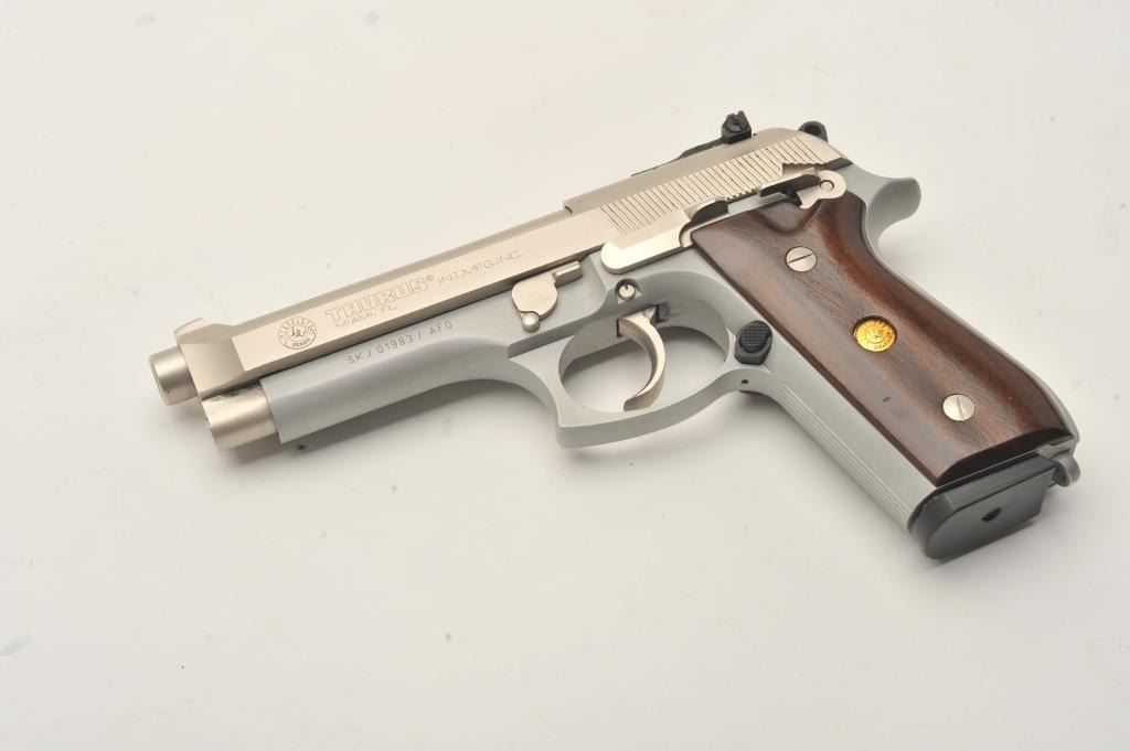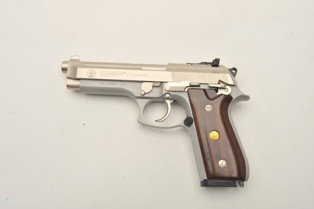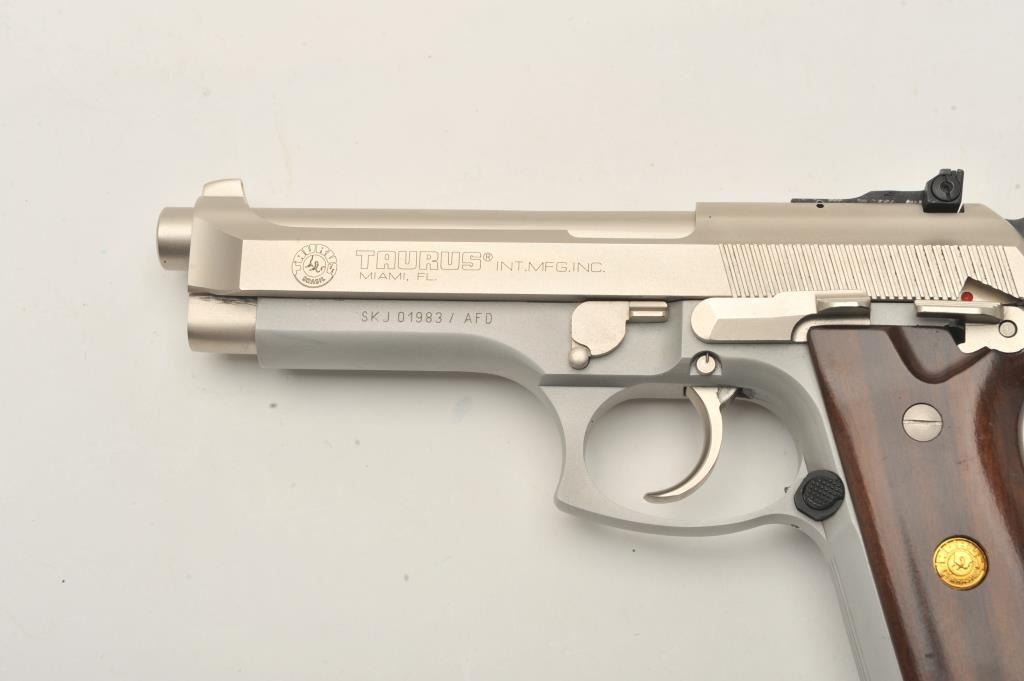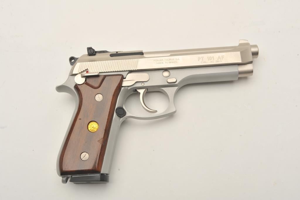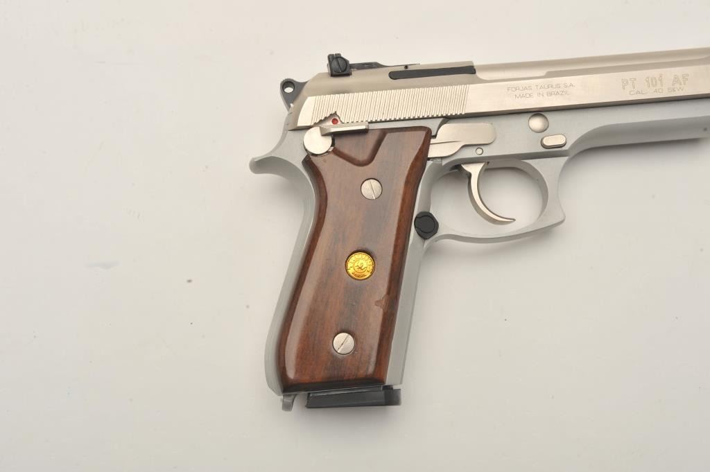 Taurus PT 101 AF semi-automatic pistol, .40 S& W caliber, Serial #SKJ01983/AFD. The pistol is in very good overall condition with a 4 ¾” barrel. The pistol retains nearly all of its matte stainless steel finish withonly light handling marks. The smooth wood medallion grips are in very good condition showing little use or wear. The lot includes one correct magazine. The lot includes the original factory cardboard sleeve withcleaning brush. The bore is good, the action is crisp and markings are sharp on this lightly used Taurus. Est.: $300-$600. (Modern/PPT).
