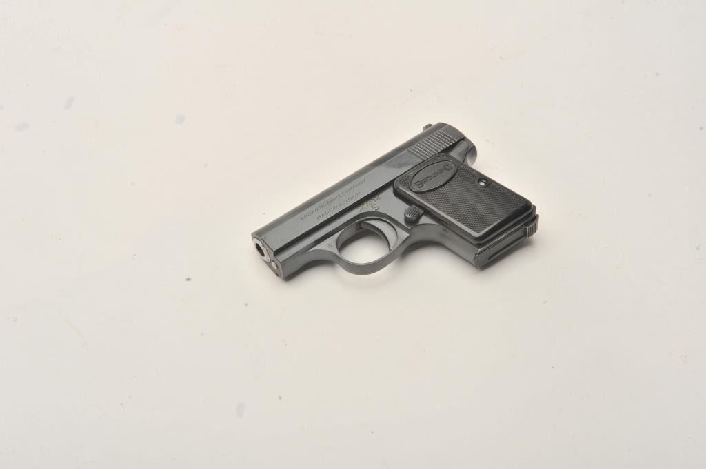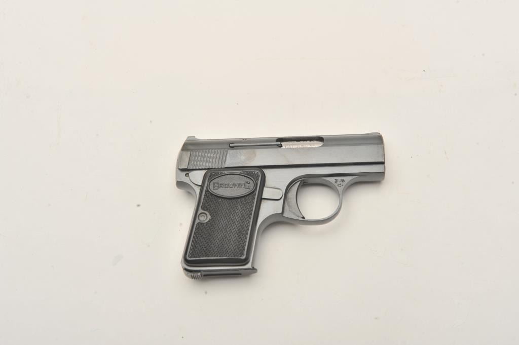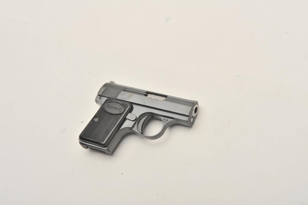Belgian-made Browning baby pocket semi-automatic pistol, 6.35mm caliber, 2” barrel, blued finish, checkered black grips, S/N 327212, in overall near new condition. (Modern/PPT). Est.: $200-$400.