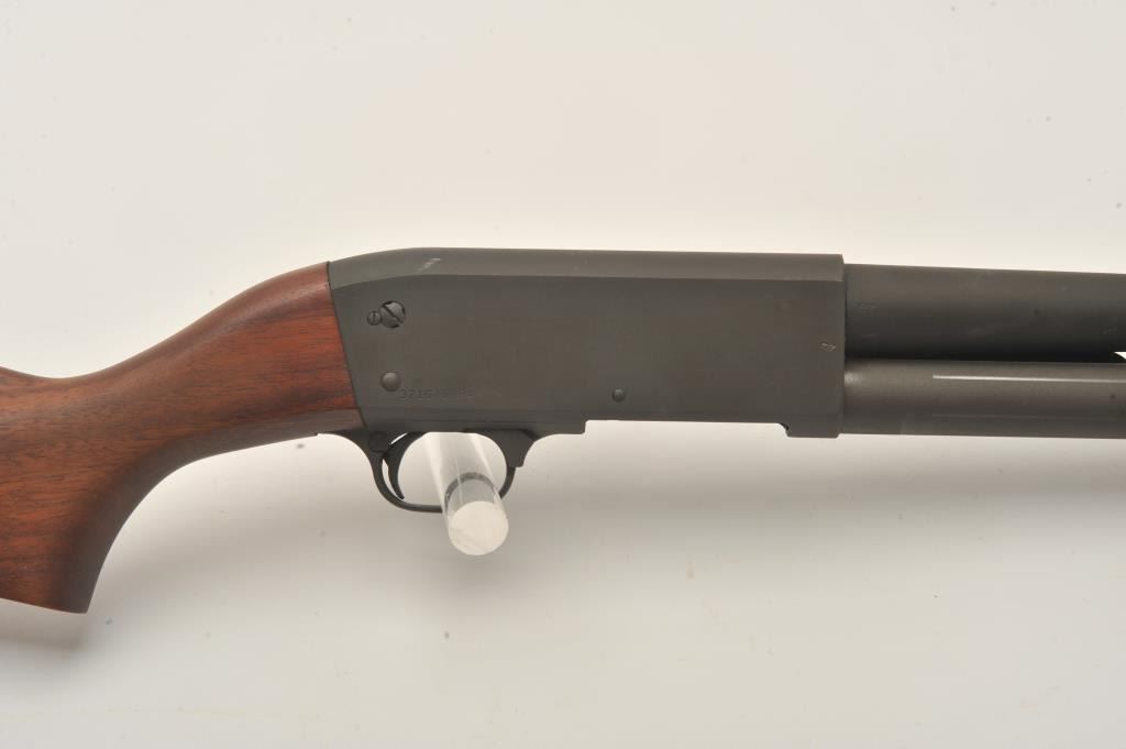 Ithaca Model 37 pump action shotgun, 12 gauge, 20” barrel, parkerized finish, wood stocks, S/N 371676194, in overall very good ++ condition with majority of finish remaining, near fine bore, crisp action, very good markings and very good ++ wood. (Modern). Est.: $200-$400.
