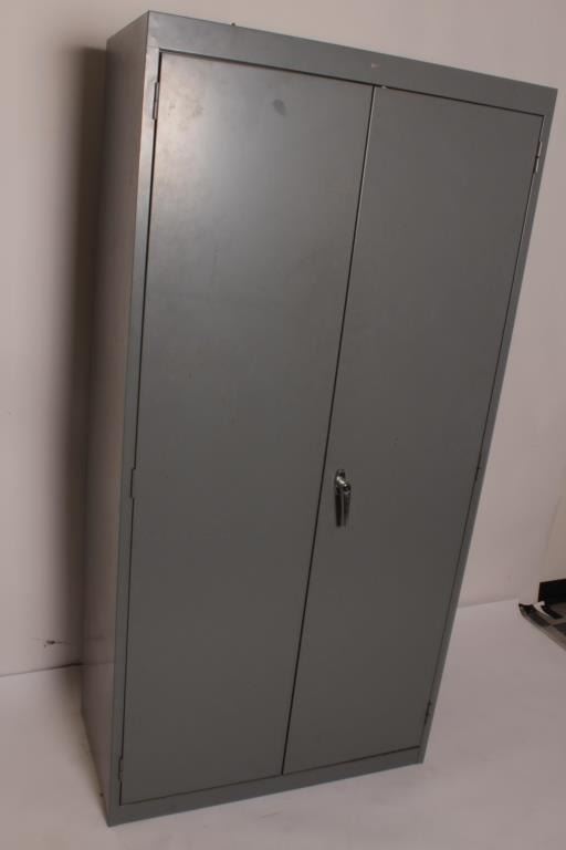 Metal gun cabinet, approximately 72” high x 36” wide x 18” deep; two doors with locking handle; no key so will require locksmith to re-key. Est.: $75-$150.