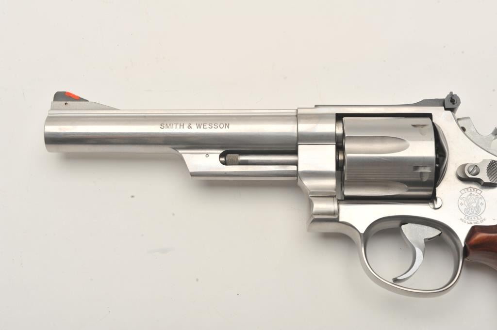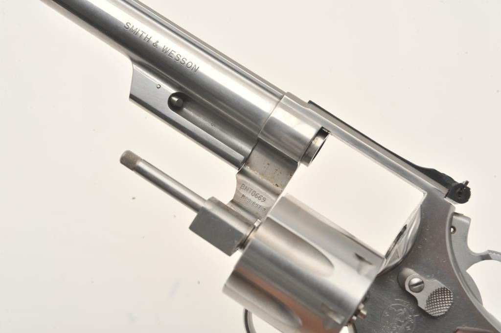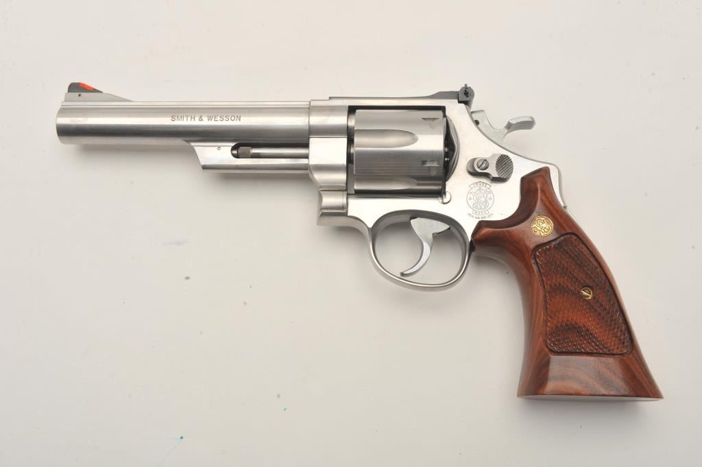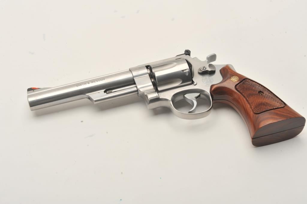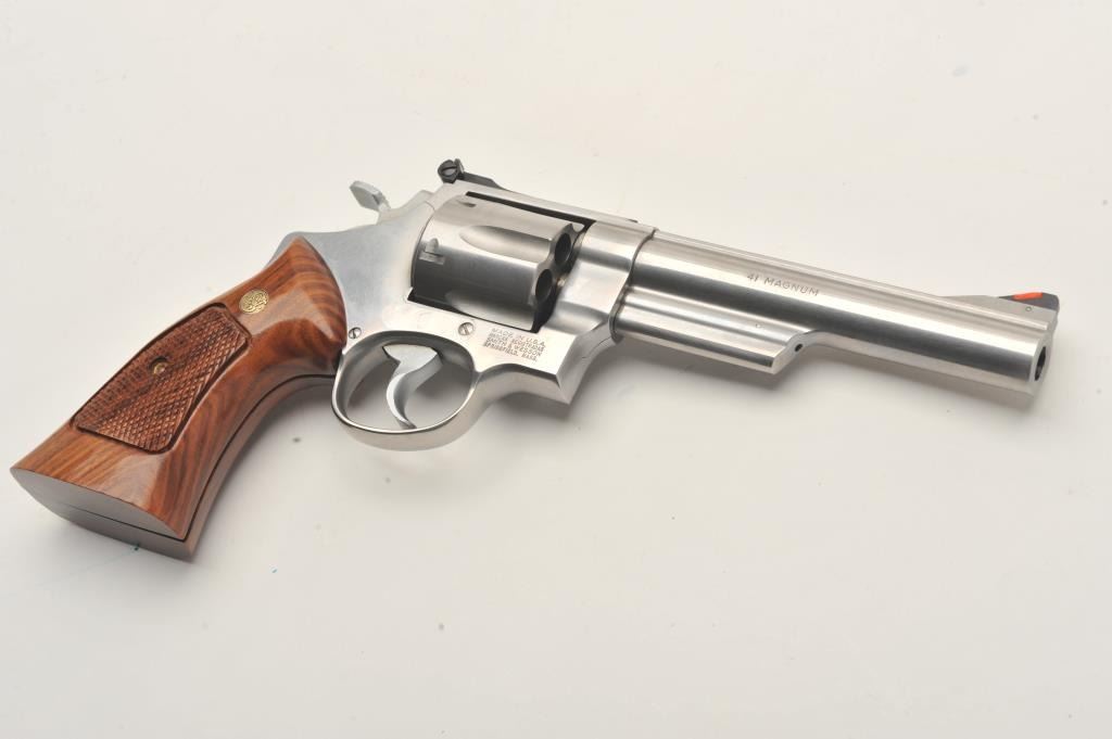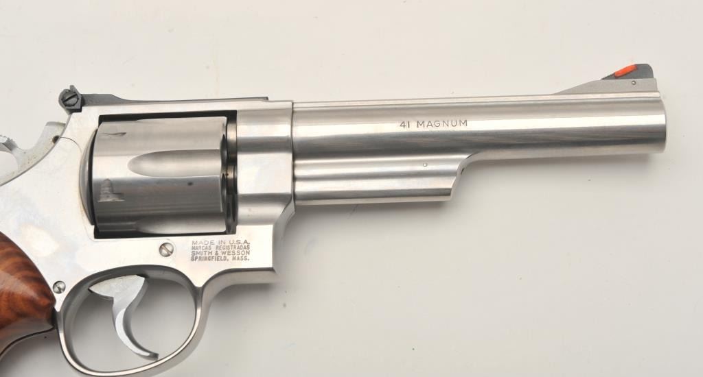 Smith & Wesson Model 657-2 DA revolver, .41 Magnum caliber, 6” barrel, stainless, checkered medallion combat wood grips, S/N BNT0669, in near new condition; fine action, bore, markings and grips. (Modern/PPT). Est.: $400-$800.