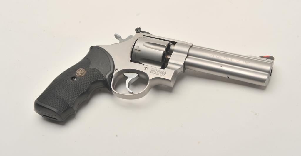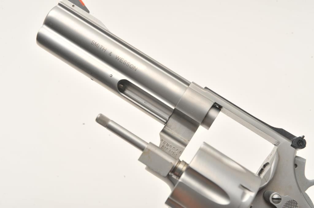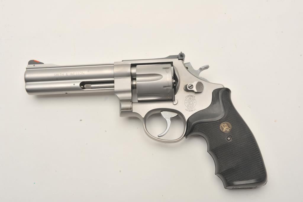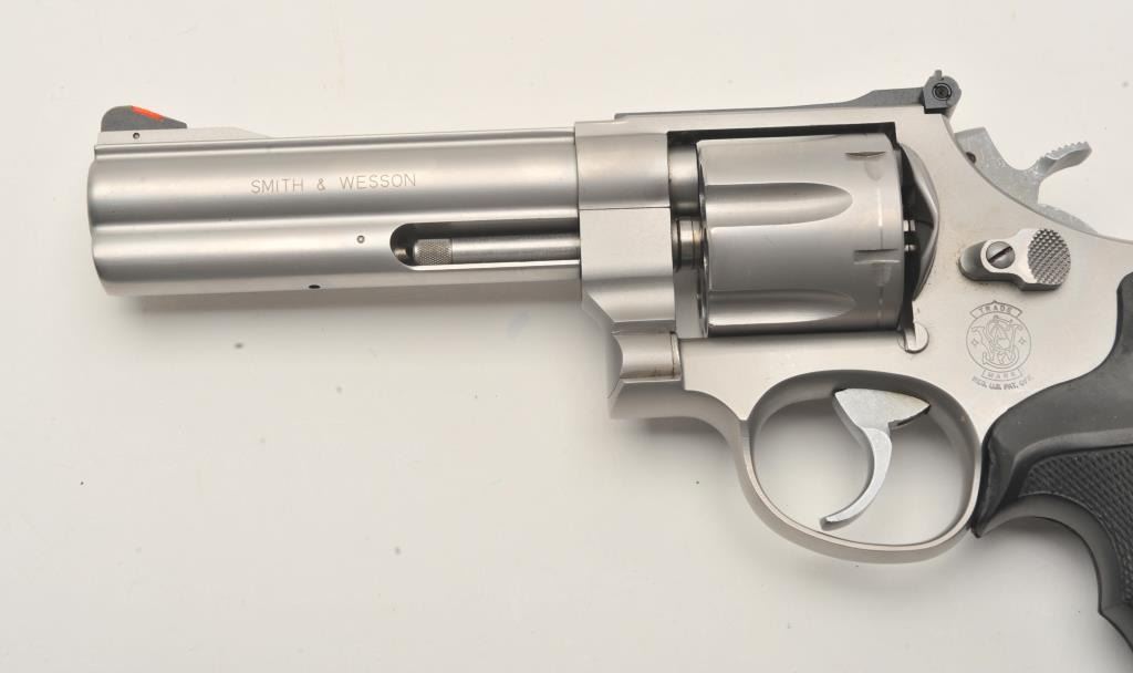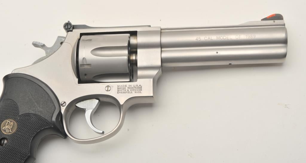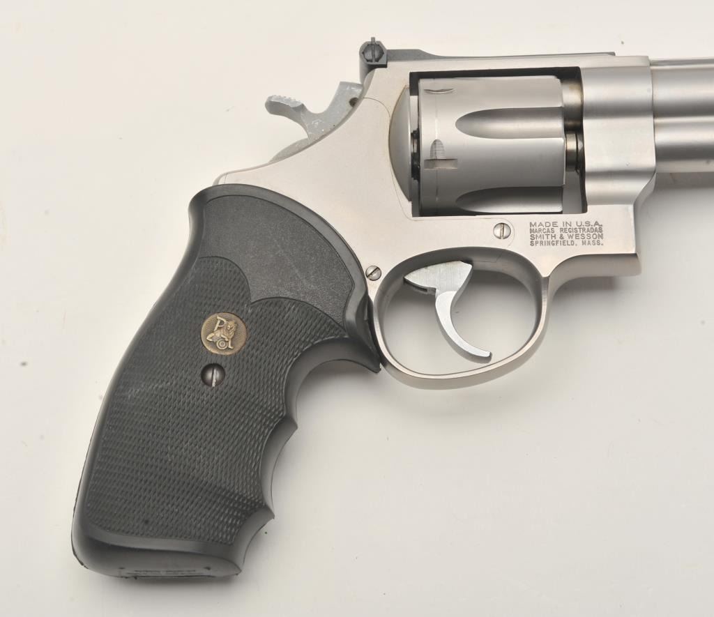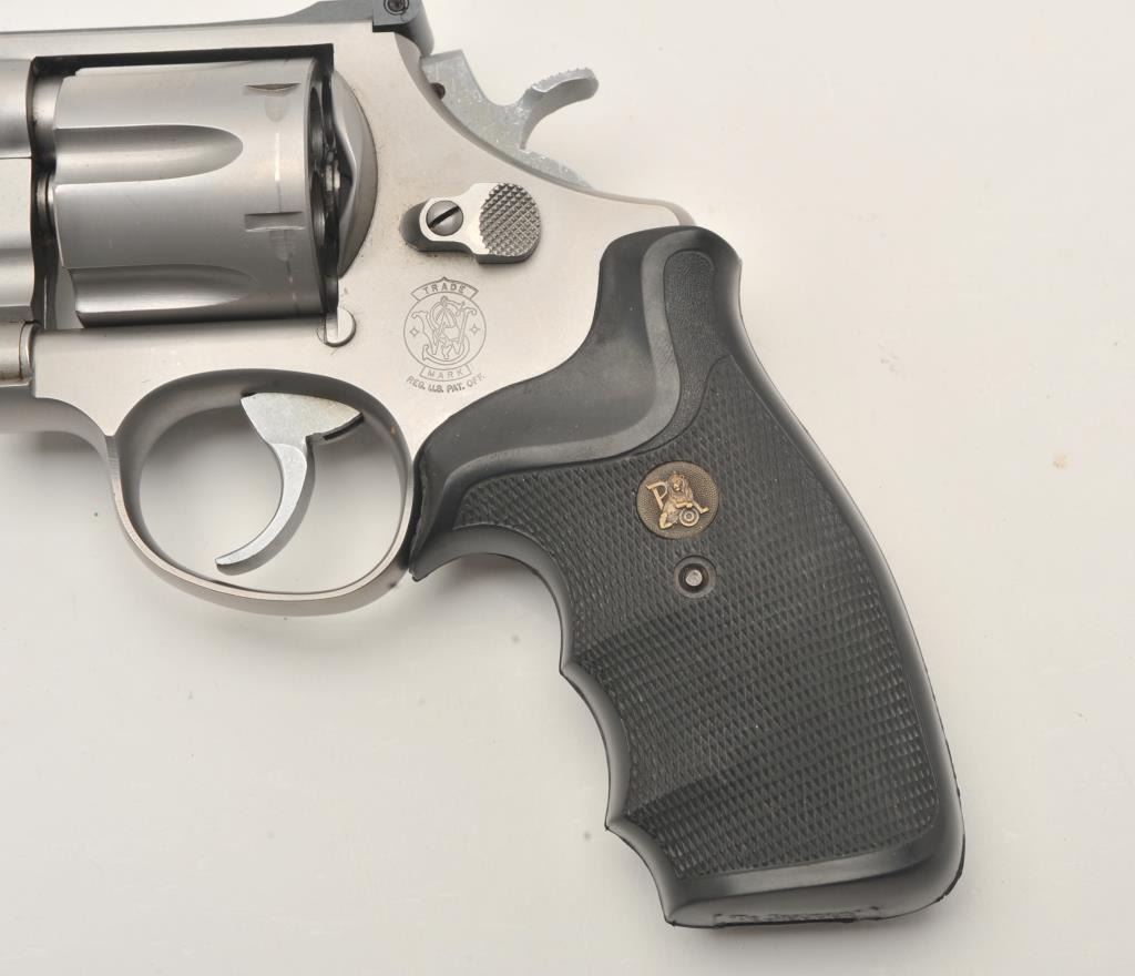 Smith & Wesson Model 625-3 DA revolver, 5” barrel, mat stainless finish, Pachmayr checkered hard rubber finger groove grips, S/N BEN6546, in near new condition; fine bore, crisp action, sharp markings and finegrips. (Modern/PPT). Est.: $350-$700.