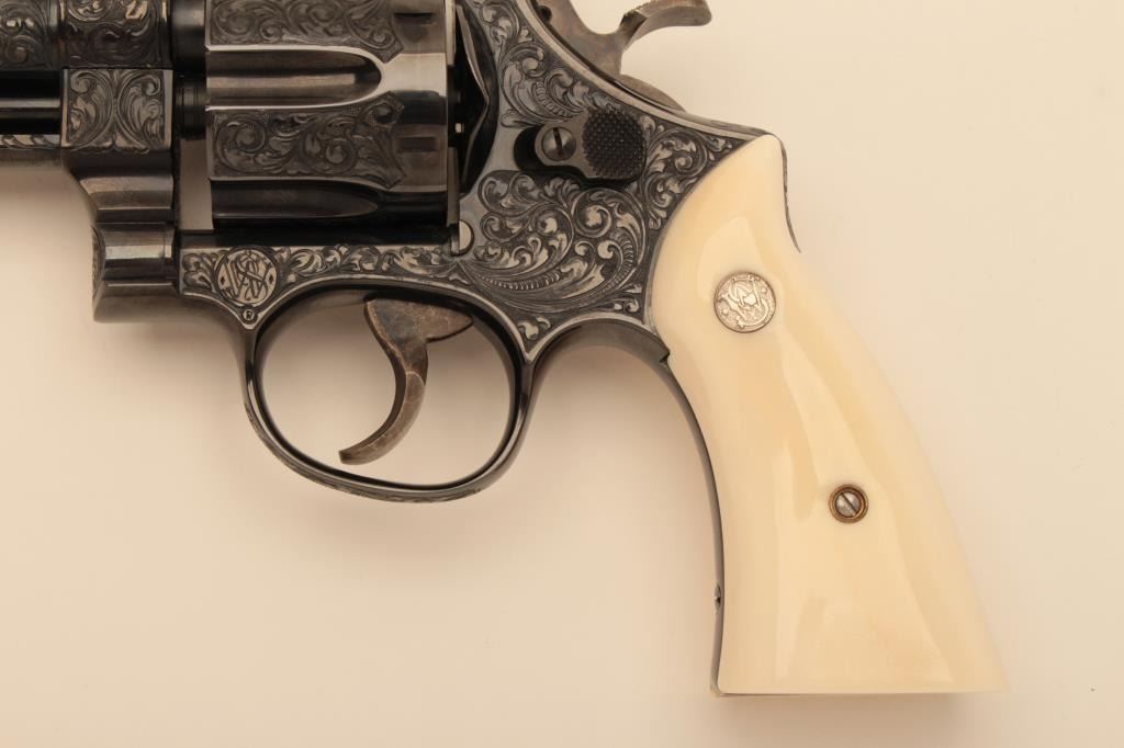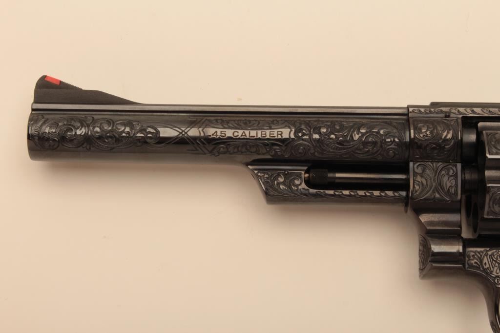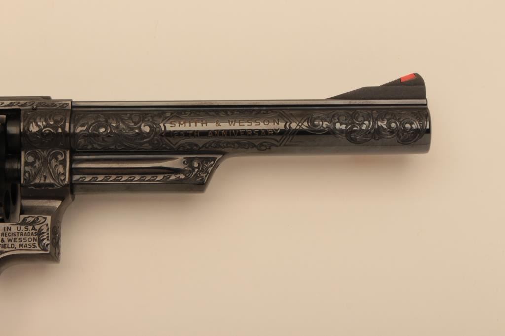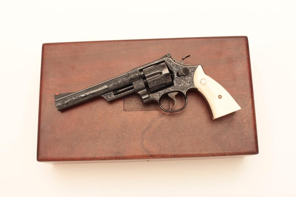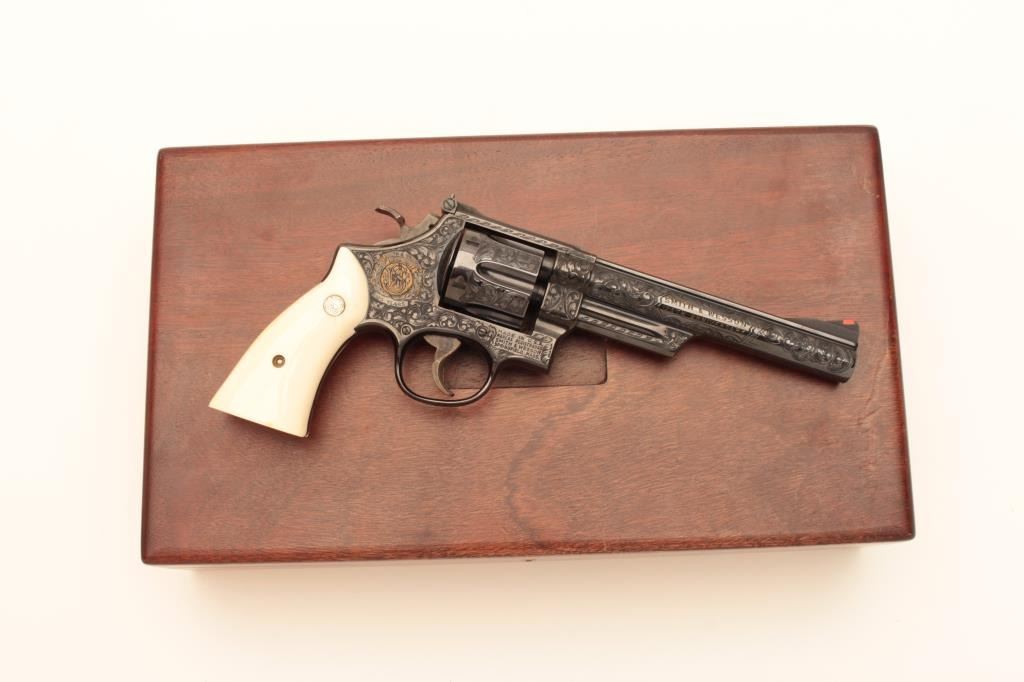 Smith & Wesson Model 25-3 in .45 L.C. caliber double action revolver with a 61/2” barrel. Special factory engraved and gold inlaid 1 of 50 edition with medallion factory grips. In presentation display case with medallion,book and lid plaque not inscribed. The book “125 Years of Smith & Wesson” is autographed by Roy Jenks and this is #50 in this ultra-rare edition offered through factory in conjunction with Smith & Wesson Collector’sAssociation. This revolver shows deluxe and deep engraving with superb S&W logo cut in high relief. This revolver is in excellent plus to almost mint with no evidence of firing. Handling and slight operation only. A few storage marks on the outside case. An impressive S&W of significate rarity that even Colt Collectors can appreciate in this caliber! (Modern/PPT) Est.: $4000-$8000