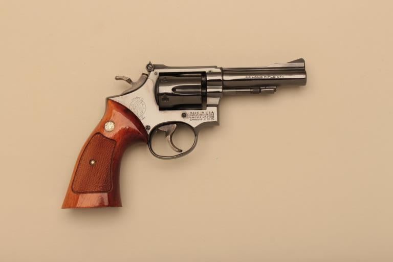 Smith & Wesson Model 18-3 DA revolver, .22LR caliber, 4” barrel, blued finish, checkered wood medallion combat grips, S/N 6K44279; overall near new condition with factory 2 piece cardboard box. (Modern/NO CAL.SALE). Est.: $400-$800.