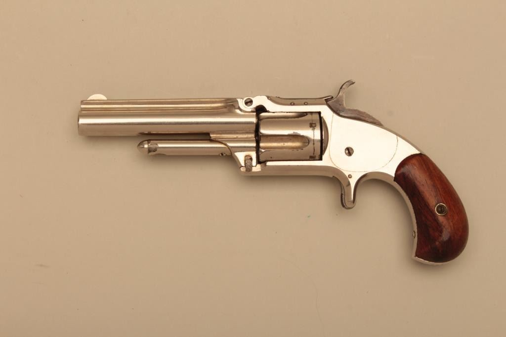 Smith & Wesson Model No. 1-1/2 Second Issue spur trigger revolver, .32 RF Long caliber, 3.5” barrel, nickel finish, rosewood grips, S/N 99009; overall very good to fine condition with majority of original finishremaining, very good bore, crisp action, sharp markings and very good grips. (Antique). Est.: $300-$600.
