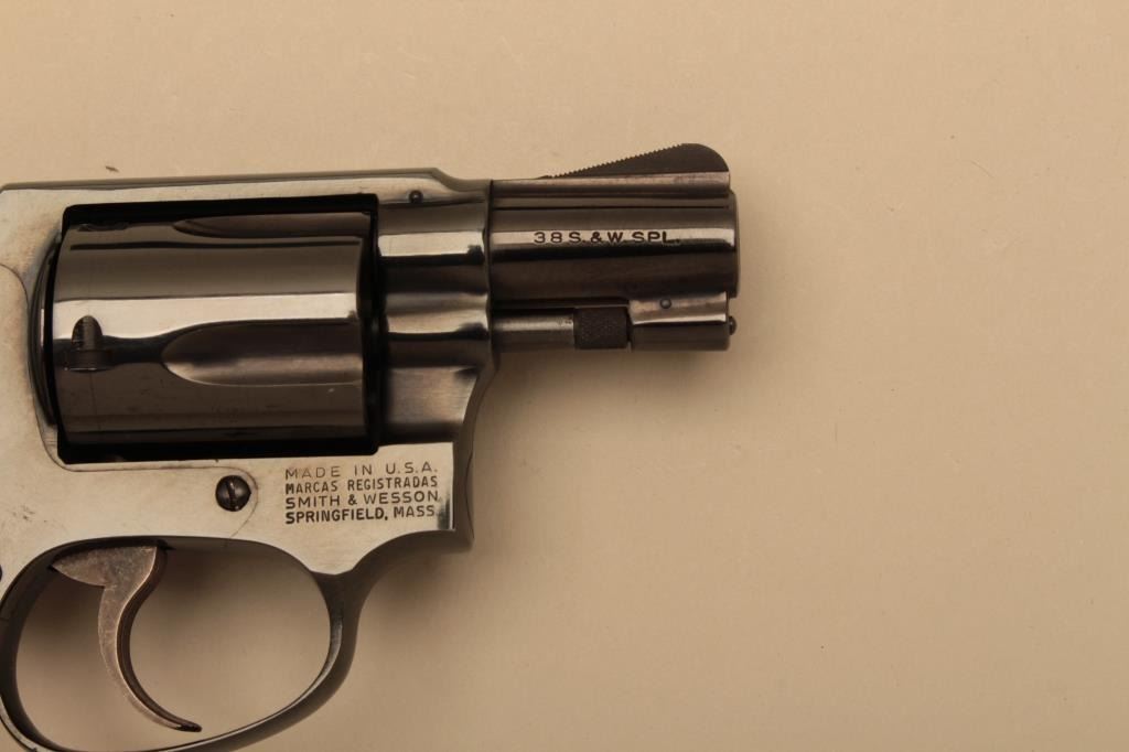 Smith & Wesson Model 36 (no dash) DA revolver, .38 Special caliber, 2” barrel, blued finish, checkered wood medallion grips, S/N J245043; in like new condition with factory two piece cardboard box.(Modern/NO CAL. SALE). Est.: $400-$800.