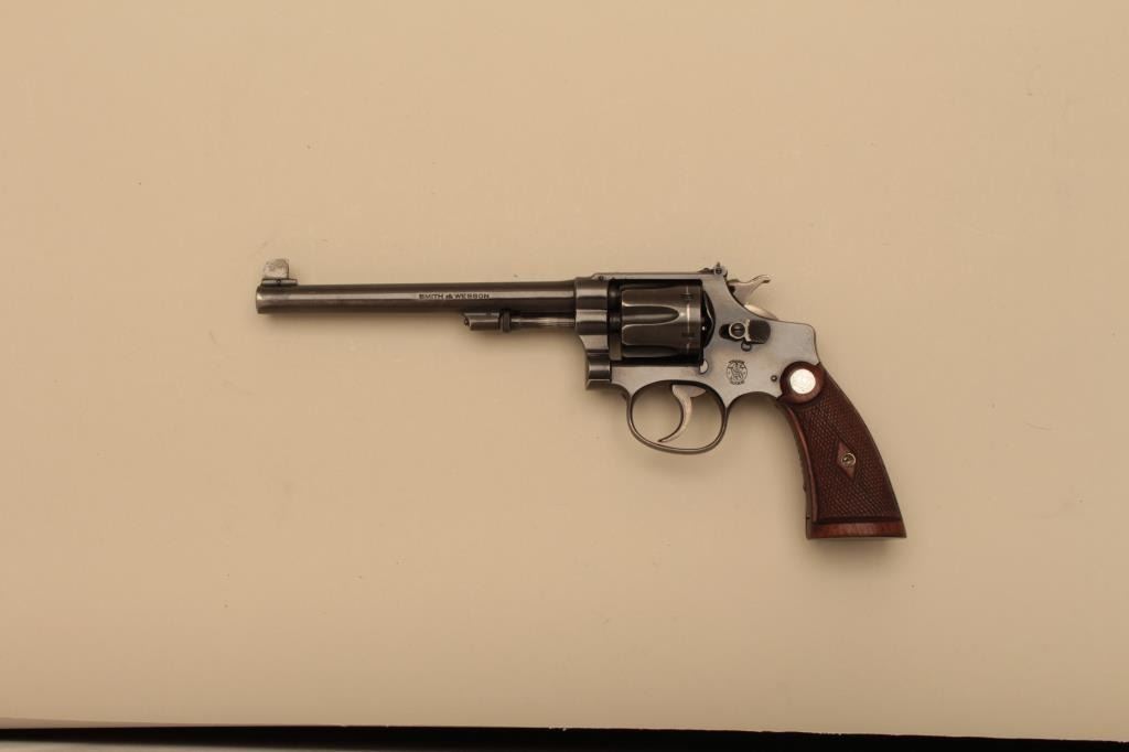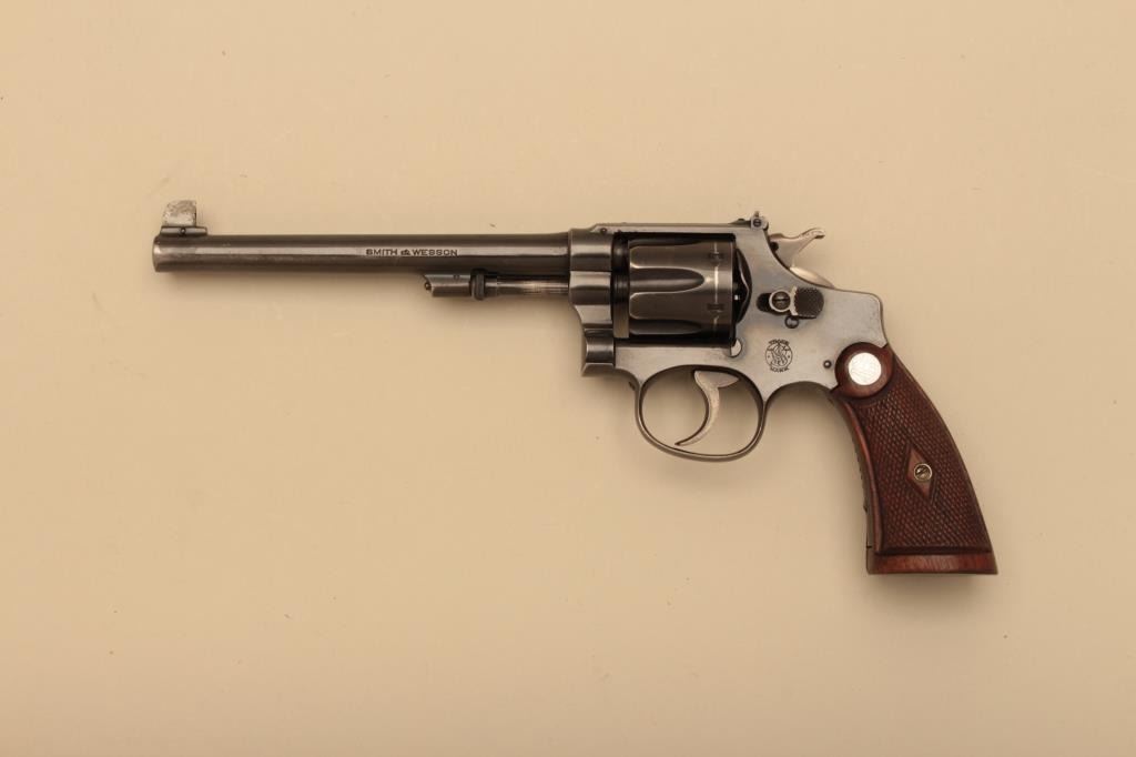 Smith & Wesson Hand Ejector Target Model DA revolver, .32 Long caliber, desirable 6” barrel, blued finish, checkered wood medallion grips, S/N 439824; overall fine condition with majority of original finish,some holster wear to muzzle area, fine bore, crisp action, sharp markings and very good + grips. (C&R). Est.: $500-$1,000.