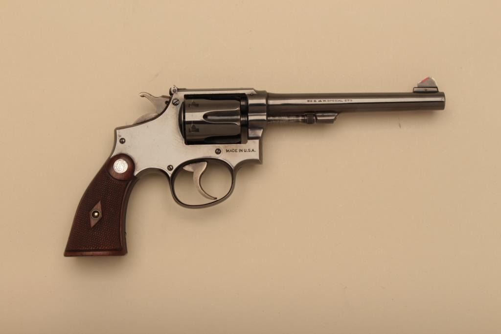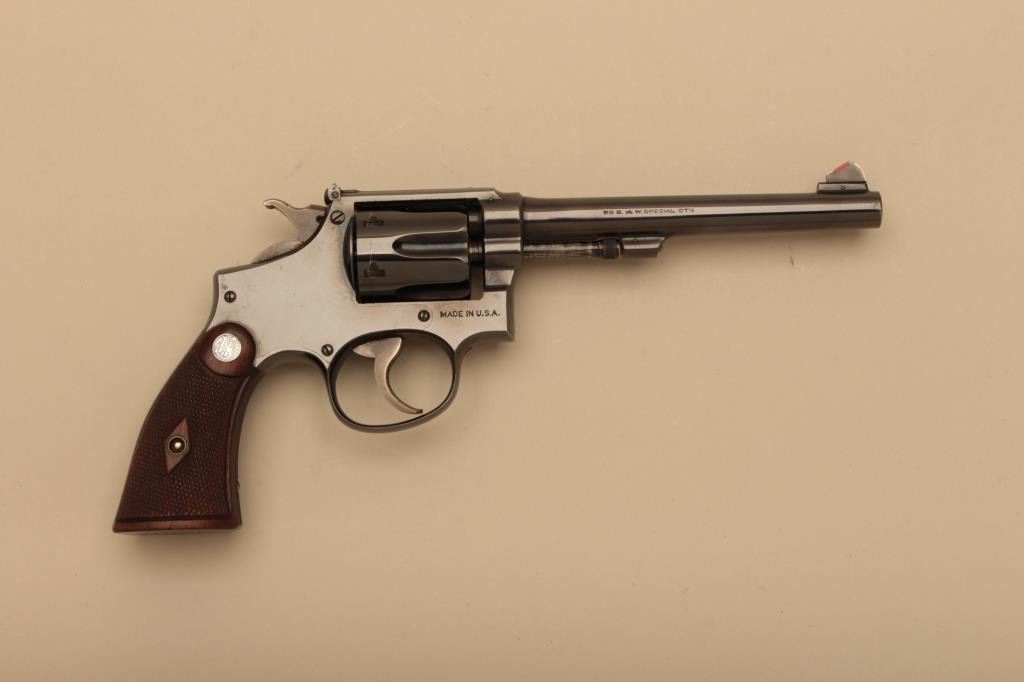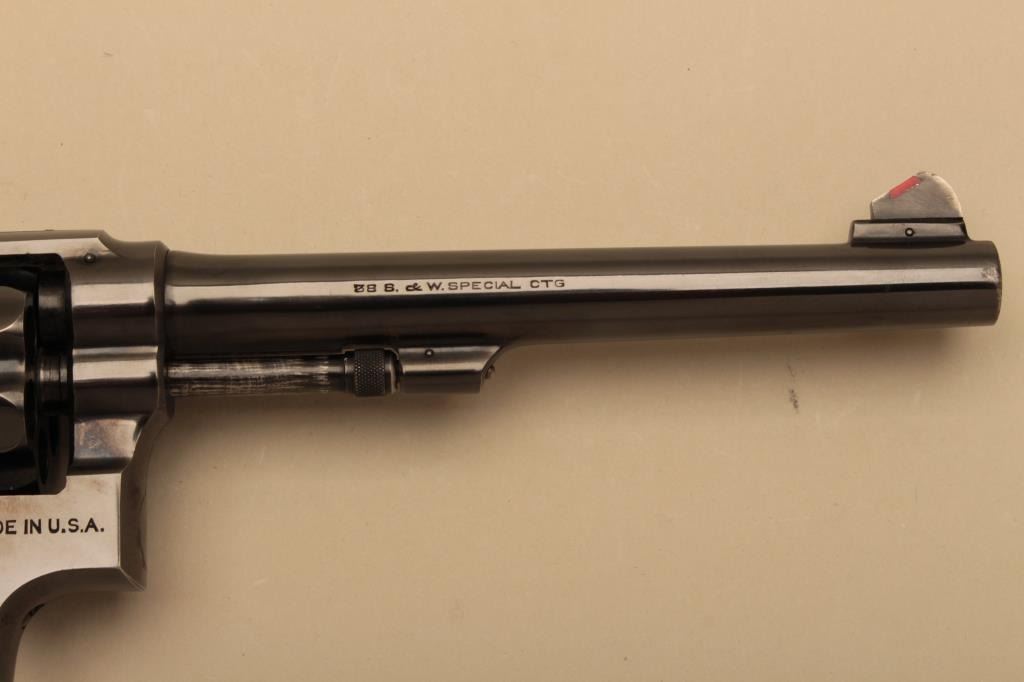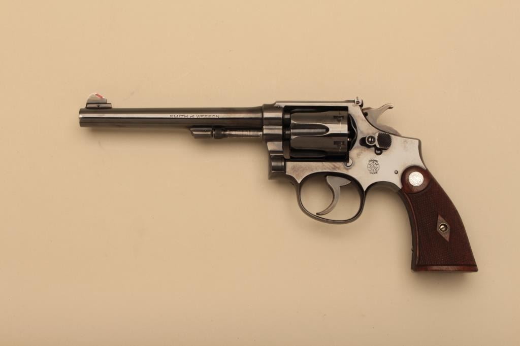 Smith & Wesson 5 screw Hand Ejector DA revolver, .38 Special caliber, 6” barrel, blued finish, checkered wood medallion grips, S/N 645645; near new condition with slight muzzle and front of front sight wear tofinish. (C&R). Est.: $600-$1,200.
